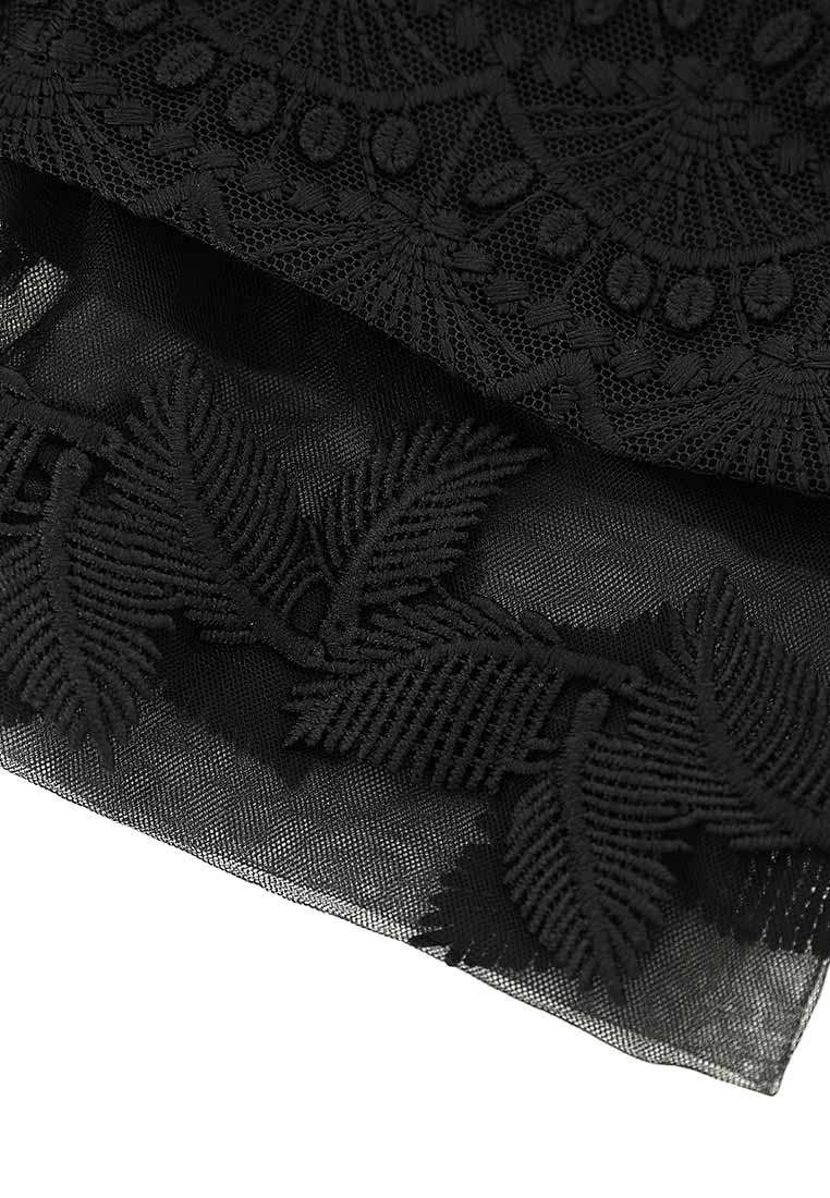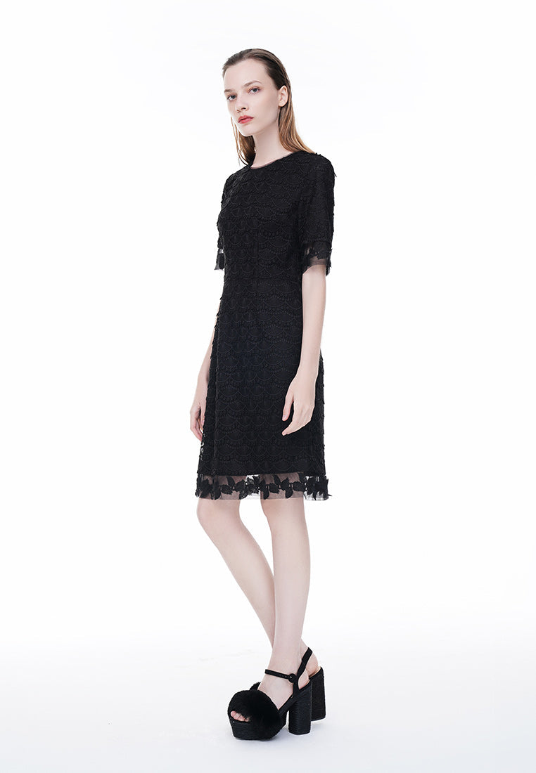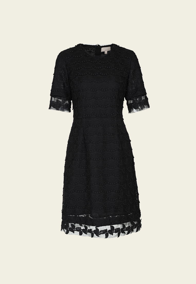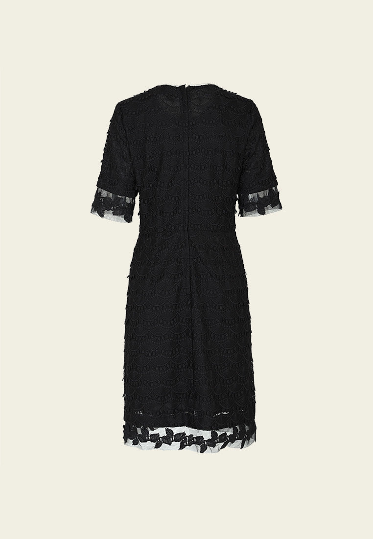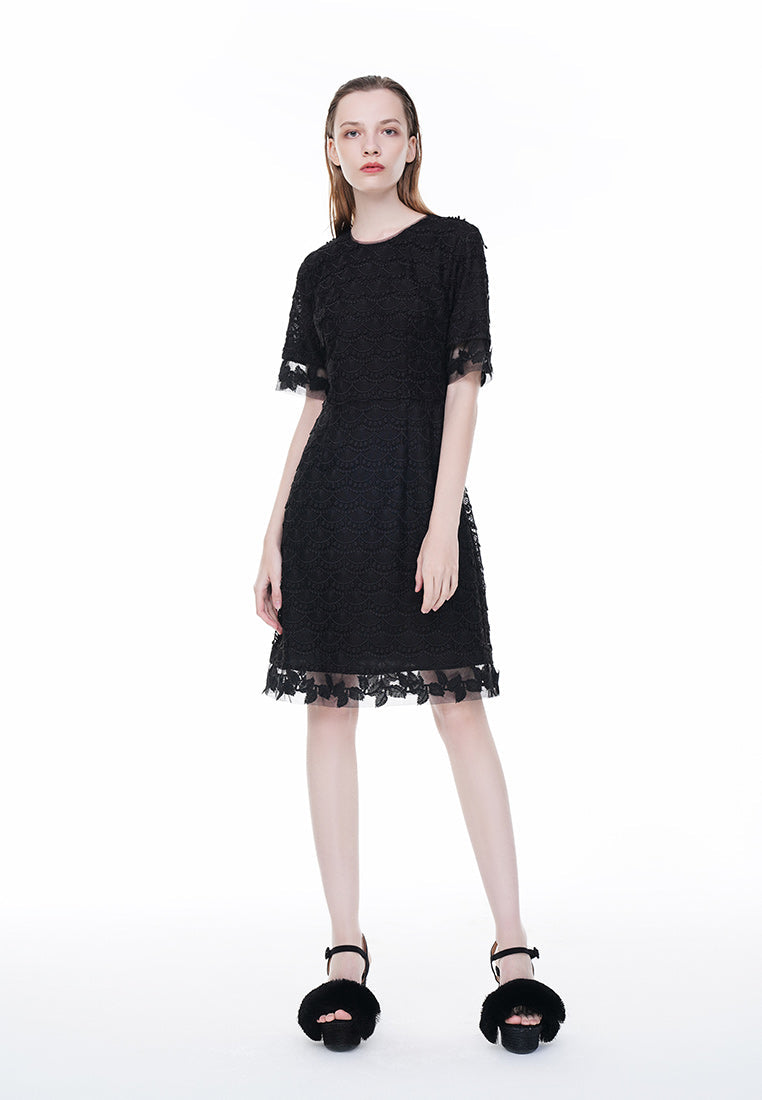 The classic little black dress is every lady wardrobe must-have. This well-tailored LBD showcased the delicate black lace and see-through details on the sleeves and hem, sexy yet elegant. Best for working occasions.