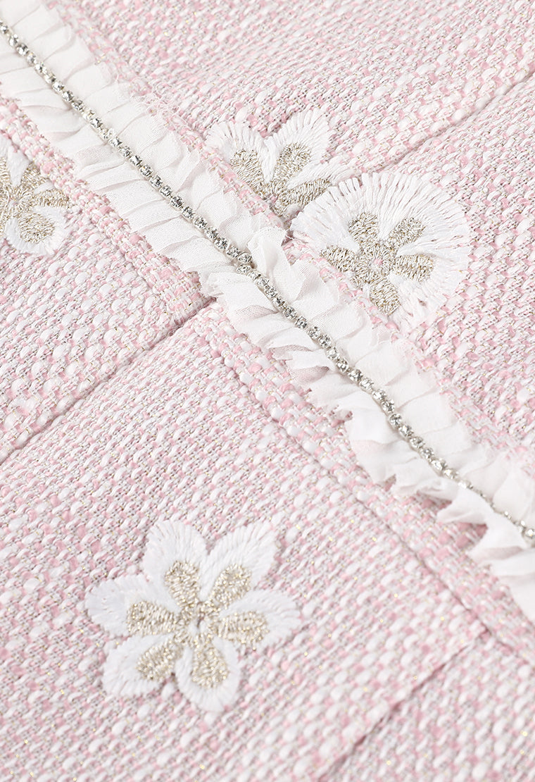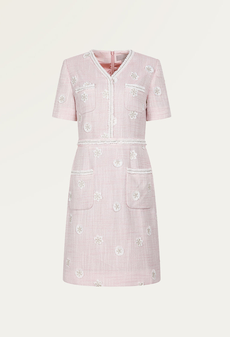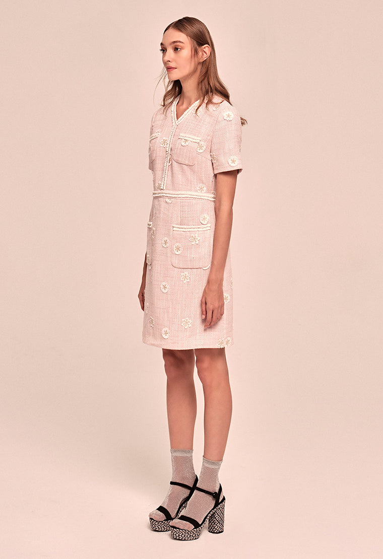 This A-line tweed dress is covered with cute three-dimensional daisies and crepe frills, fresh and bright, distilled sweetness in a garment.