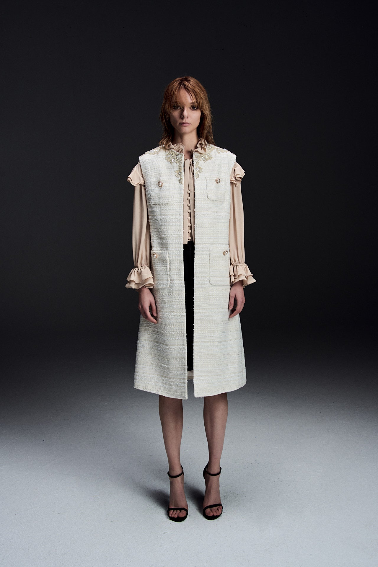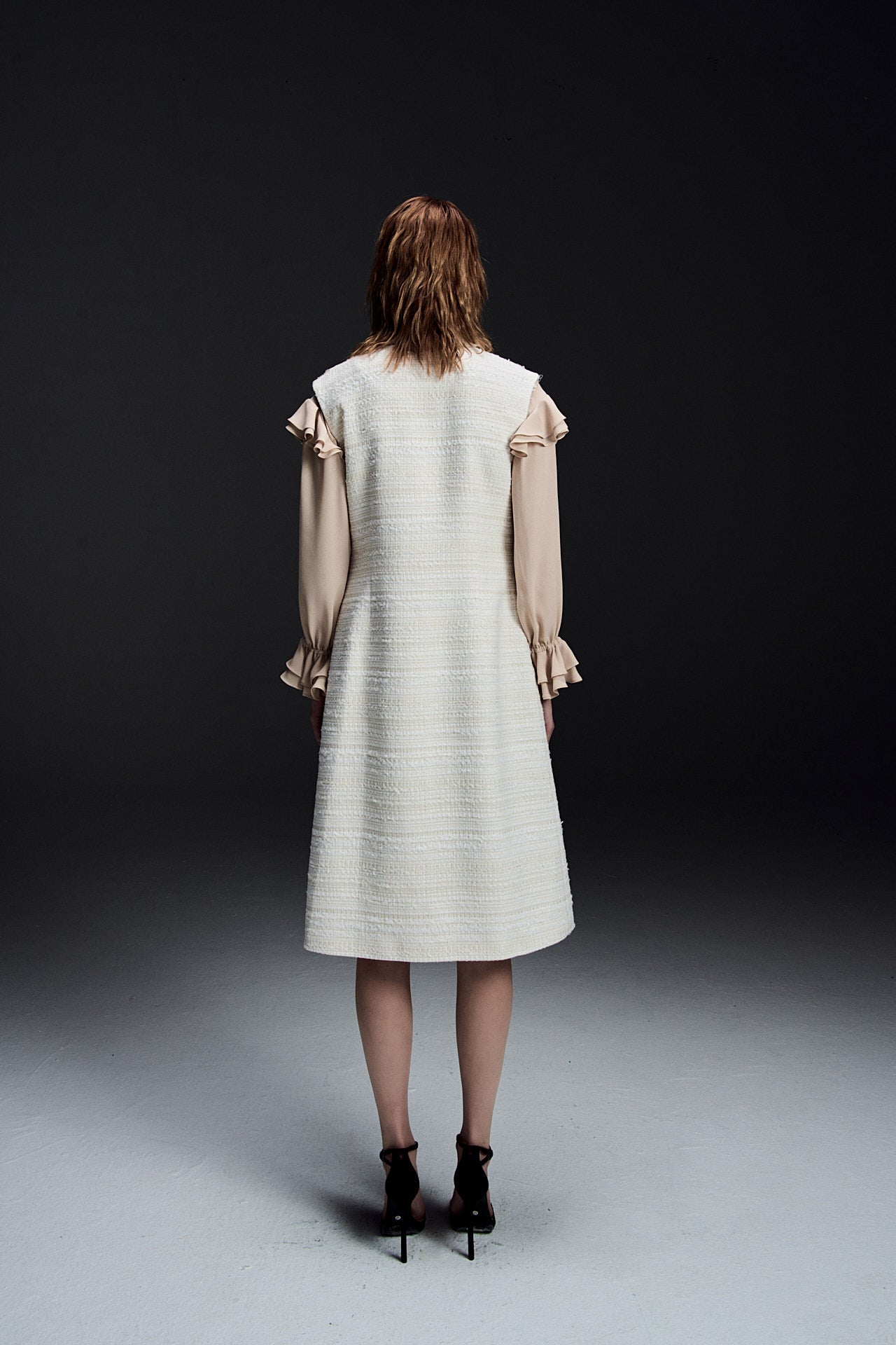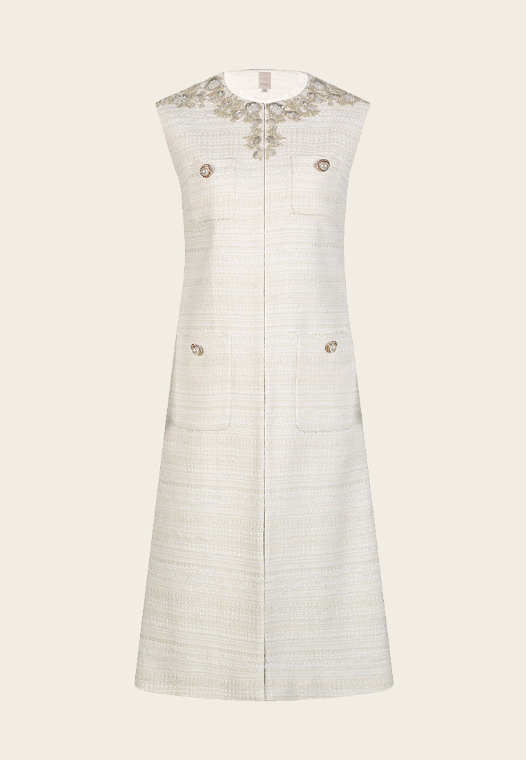 It is tailored from tweed that is textual to the touch. It has a figure-skimming fit and elegant silhouette with the embroidered collar and pearl buckles. Wear it as a dress on its own and as a knee-length jacket for layering outfit.