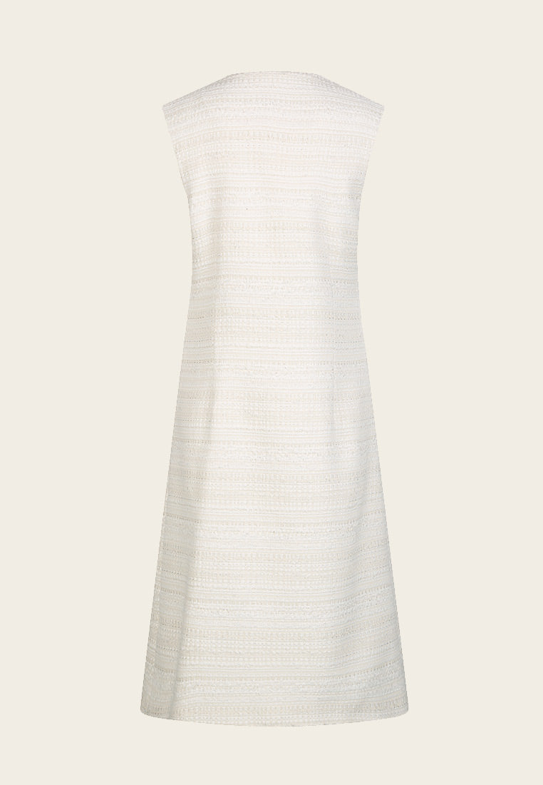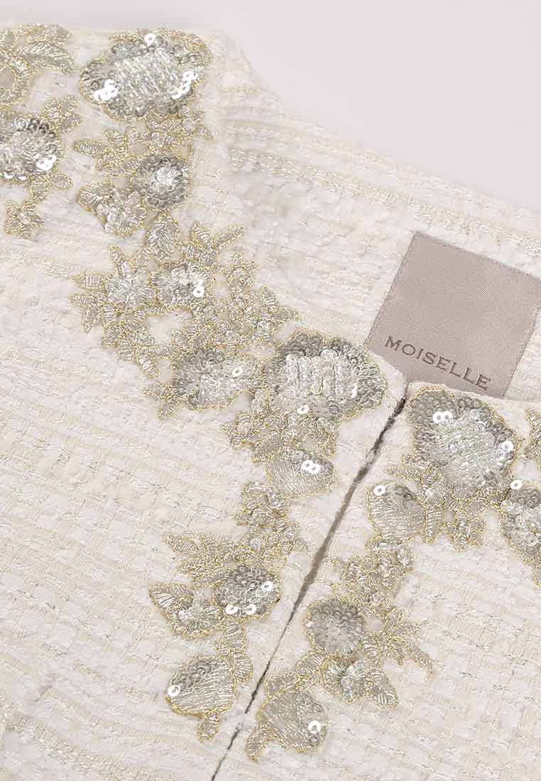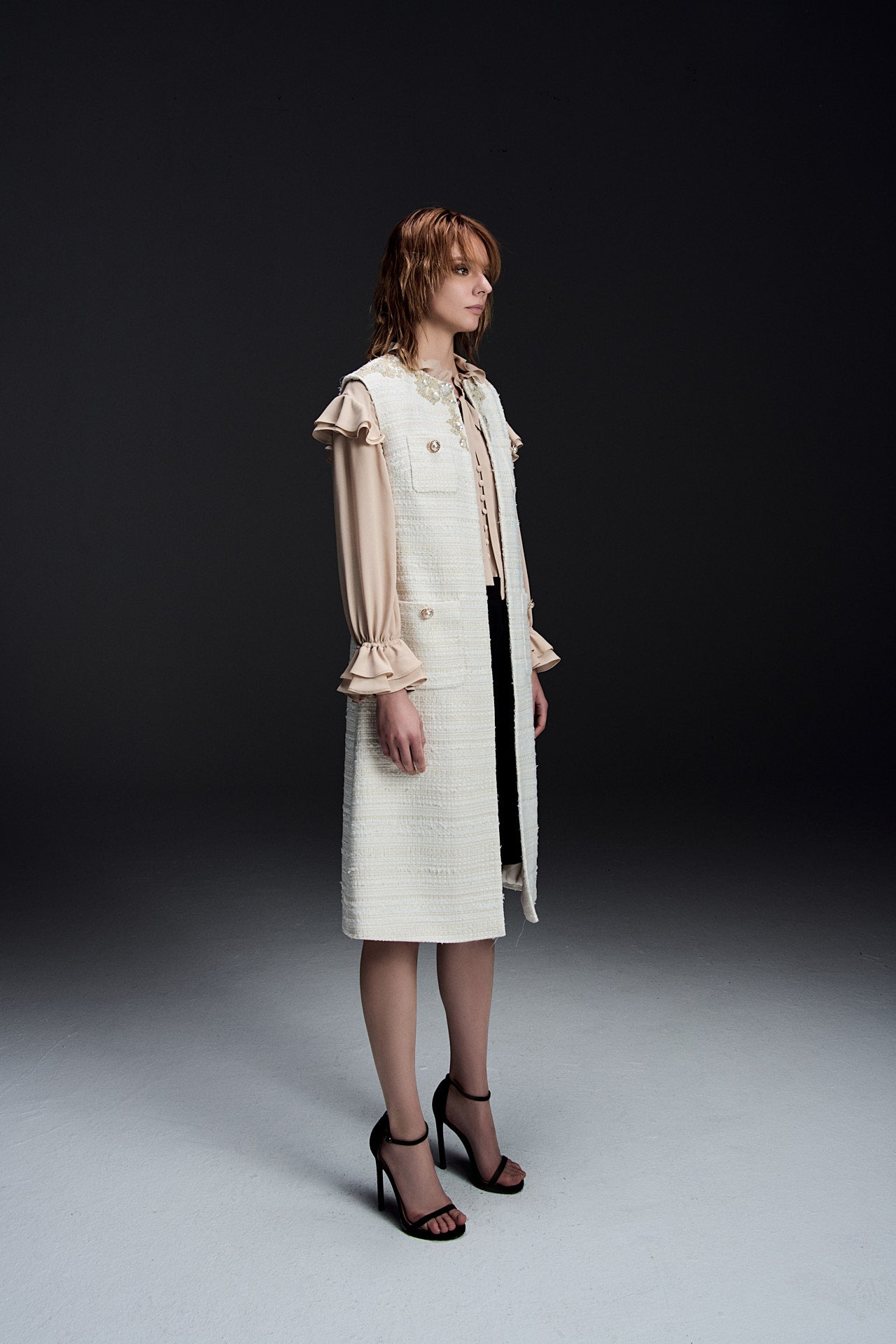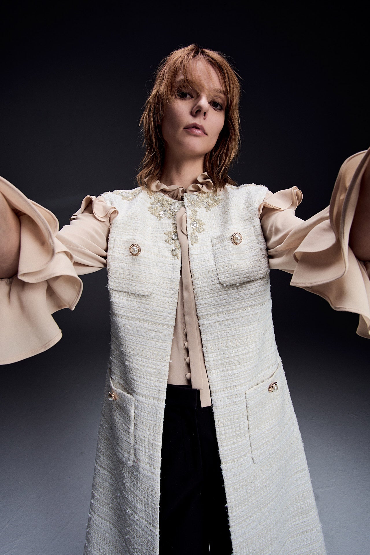 It is tailored from tweed that is textual to the touch. It has a figure-skimming fit and elegant silhouette with the embroidered collar and pearl buckles. Wear it as a dress on its own and as a knee-length jacket for layering outfit.