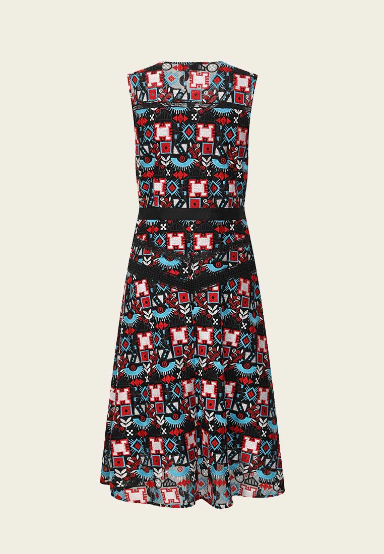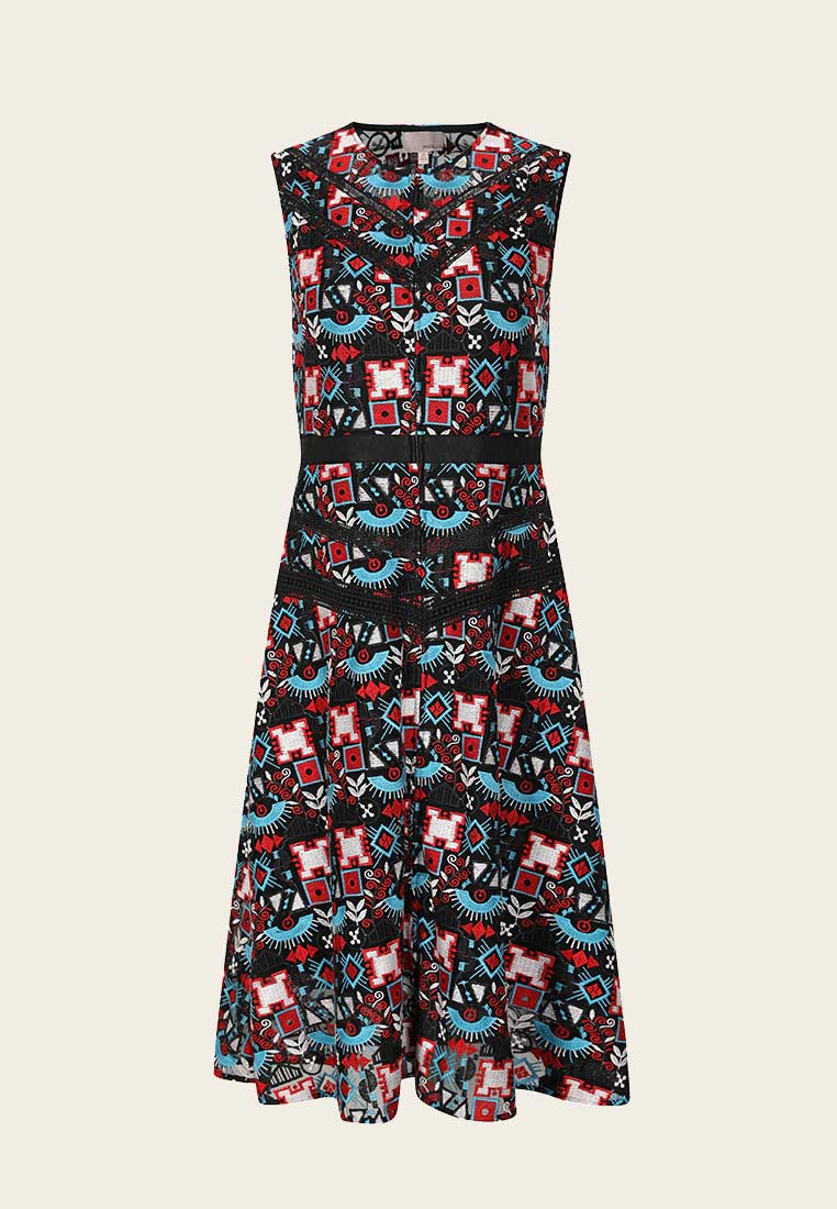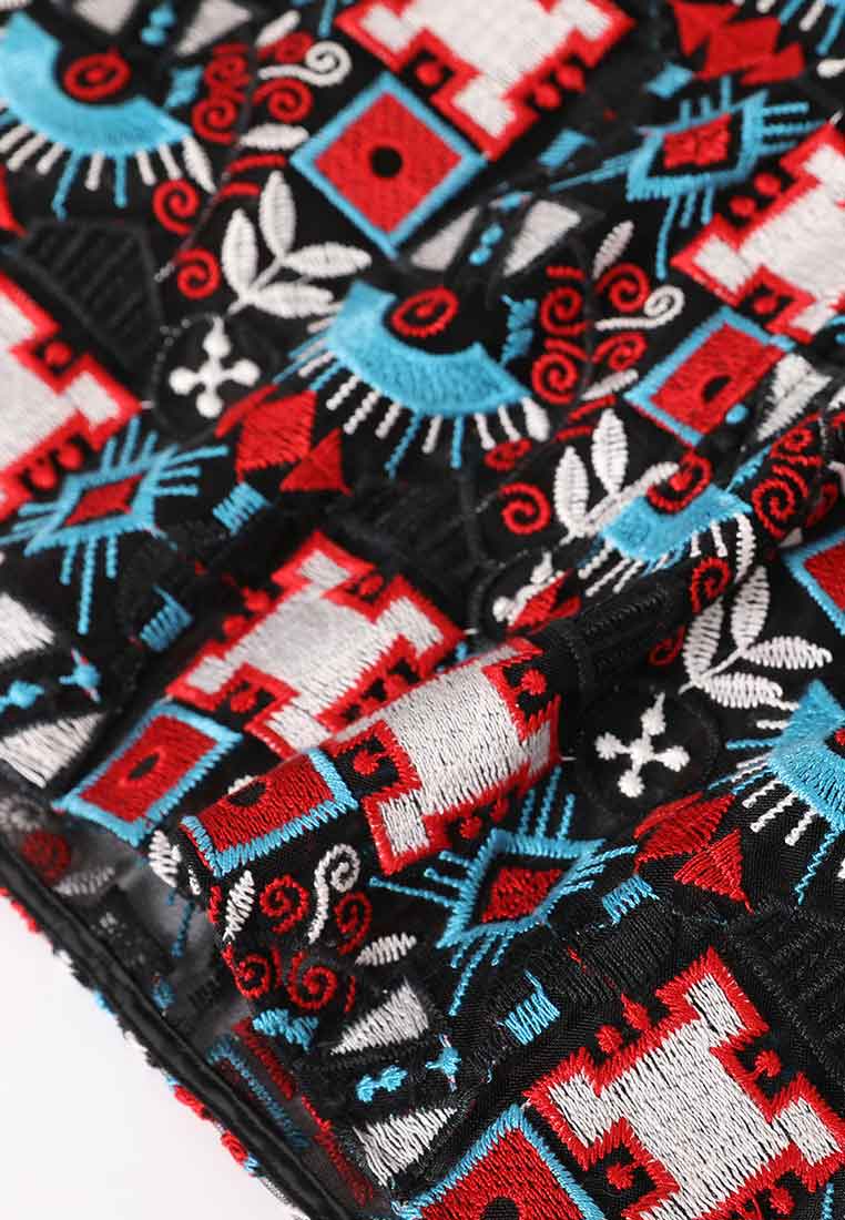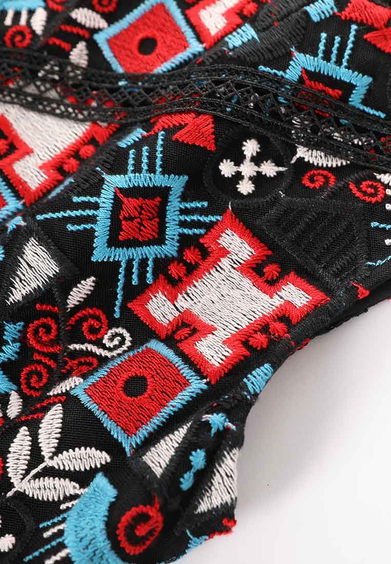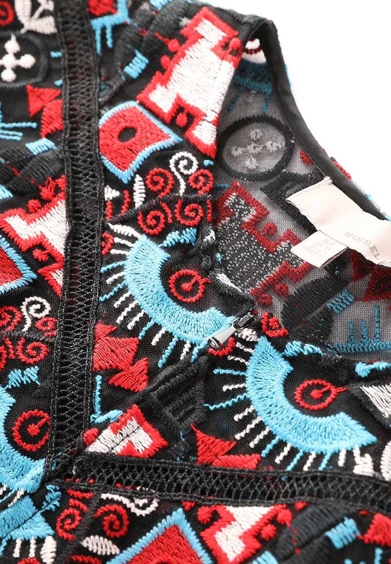 An eyecatching one-piece sleeveless black dress fully embroidered with delicate Indian totem inspired symbolic patterns. Repetitive fine pattern stands out in the black. Black lace above the bust and around the waist and thighs, outline the curves of the body.