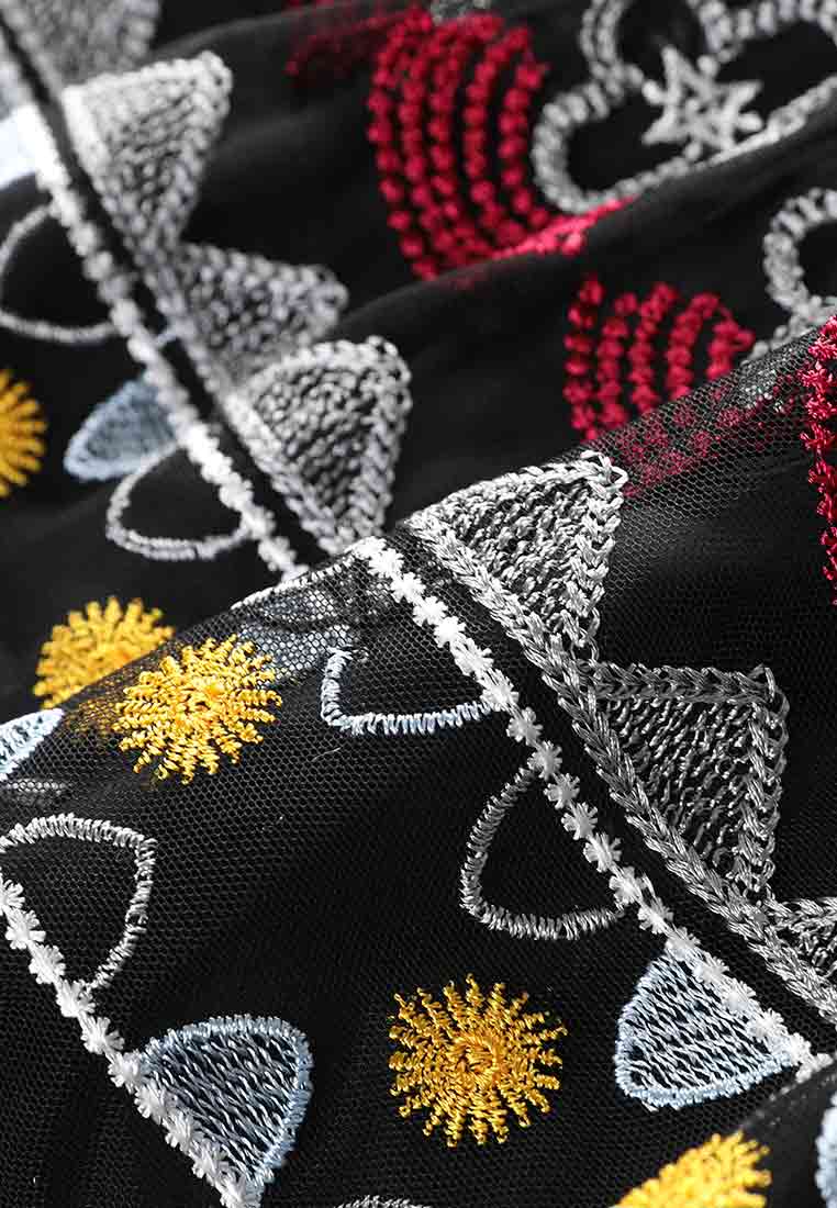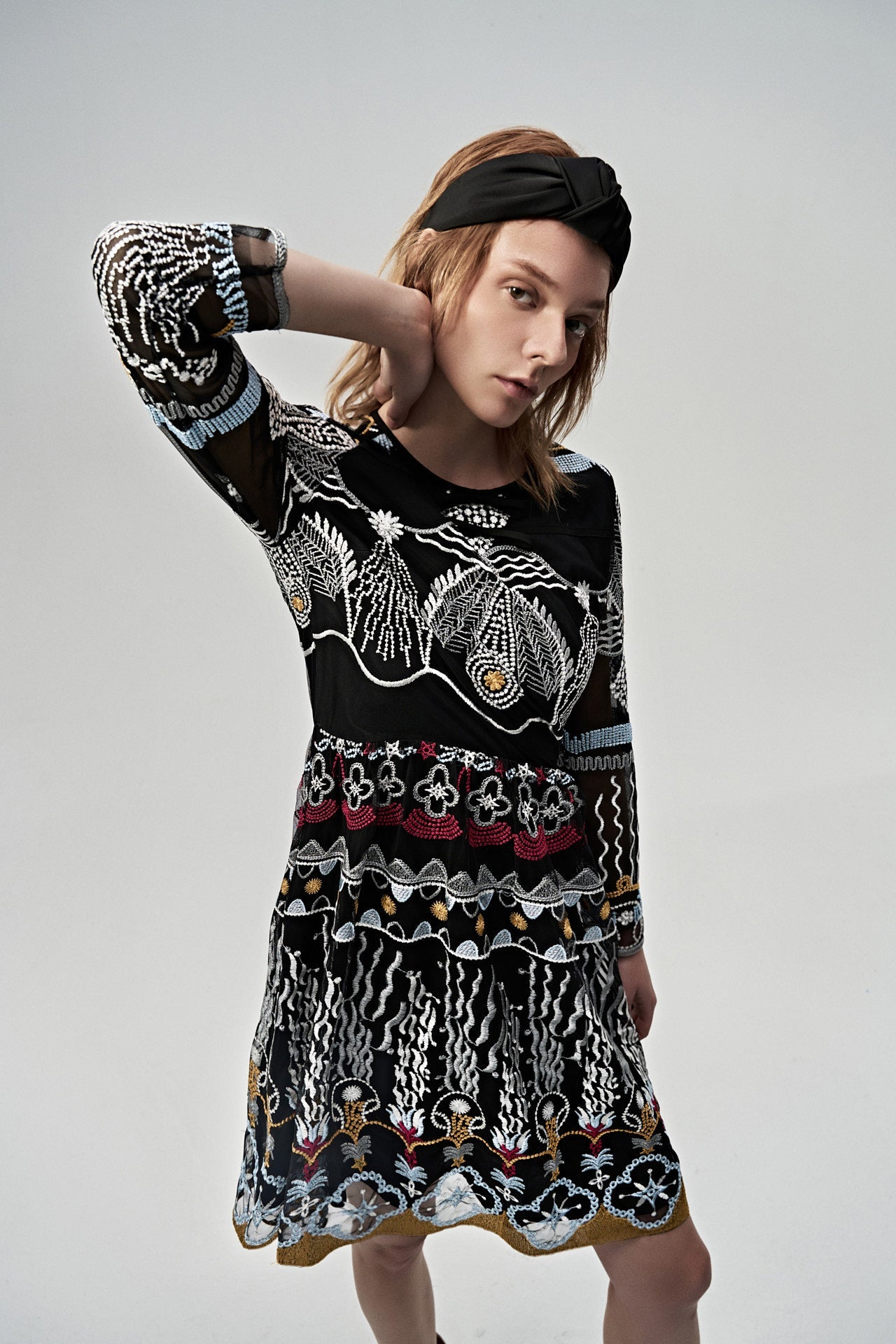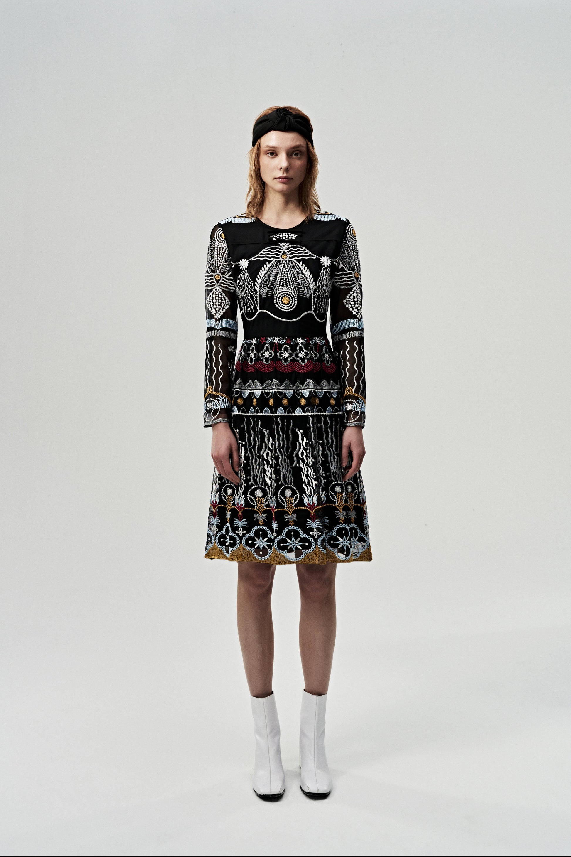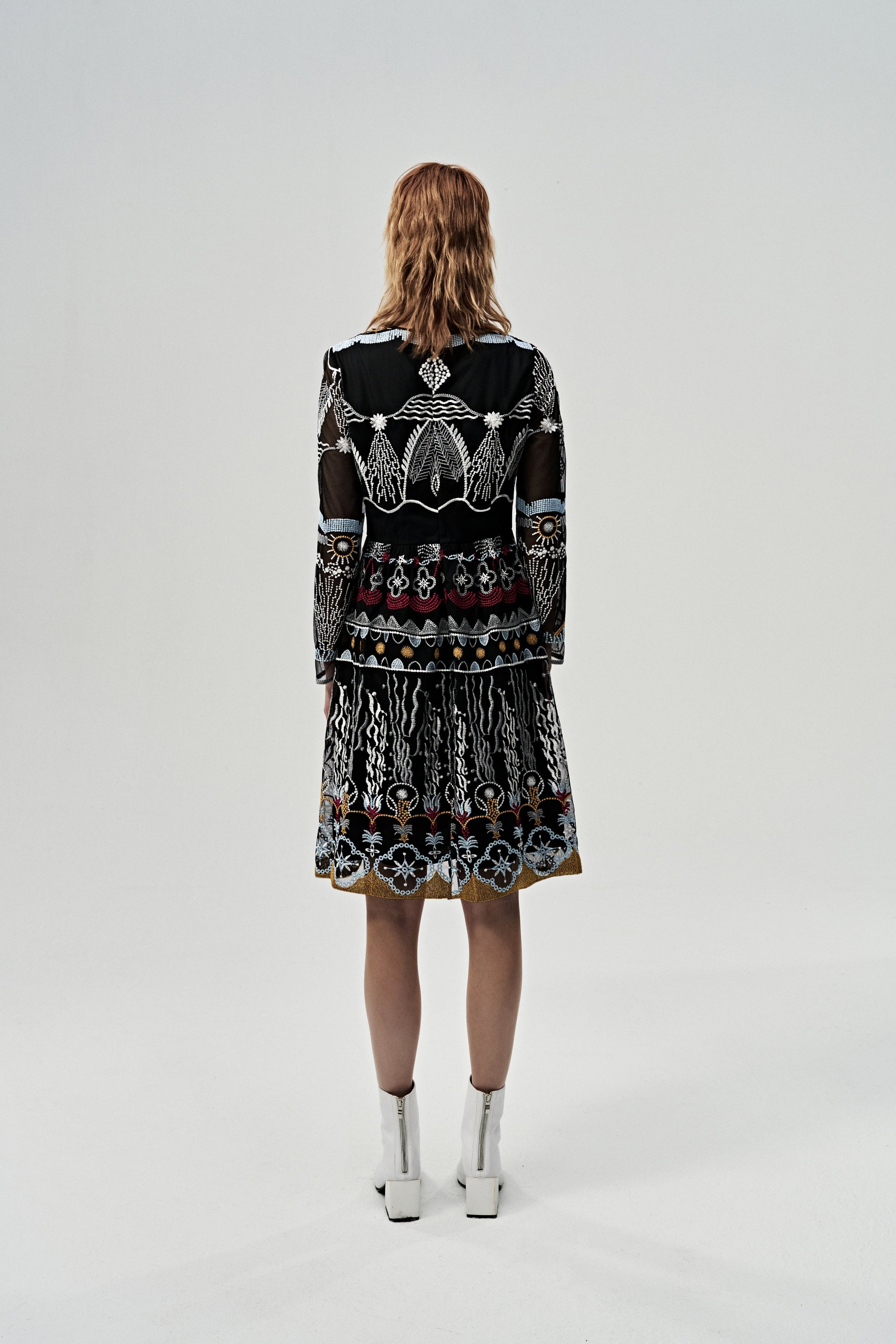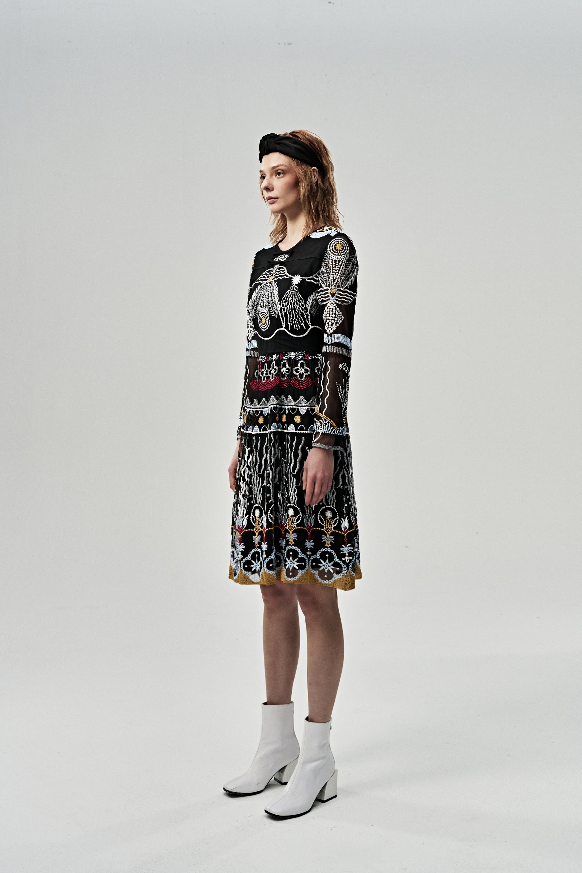 The 80s nostalgia continues in spring/summer 2022. Retro tribal patterns distributed along body parts, variety Sizes of patterns allocated along the body, outlining the silhouette. Black negative spaces accentuate collarbone and the waistline. Patterns mainly in white Colorways, hince of Colors liven up the mood of the piece.