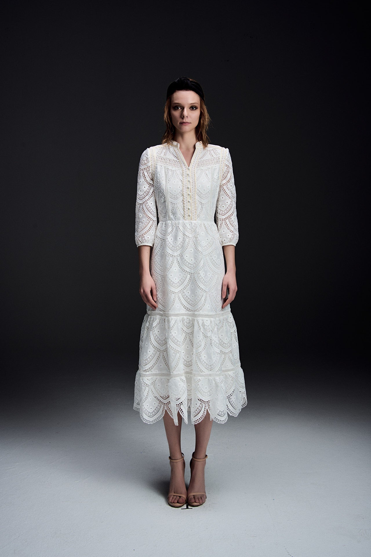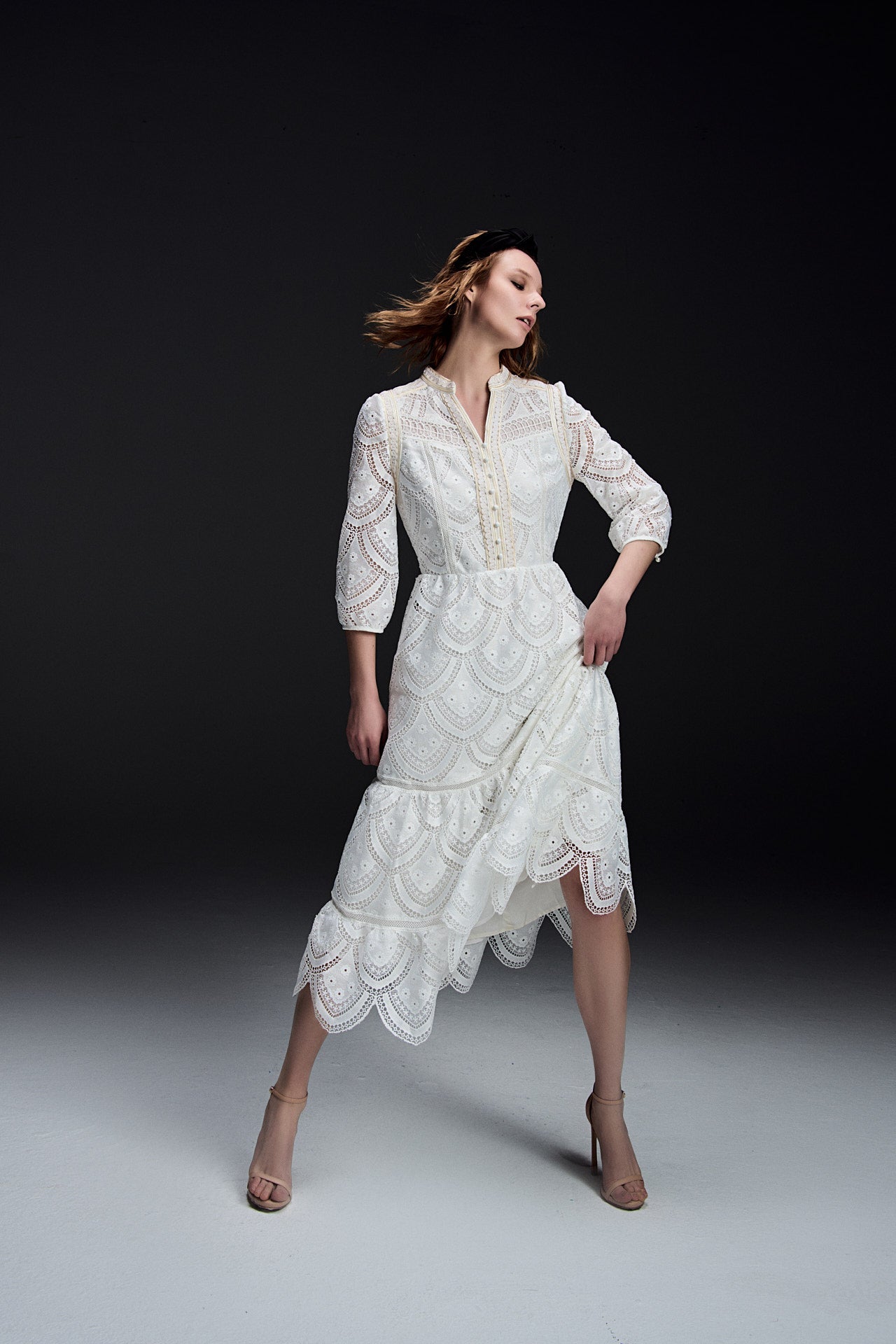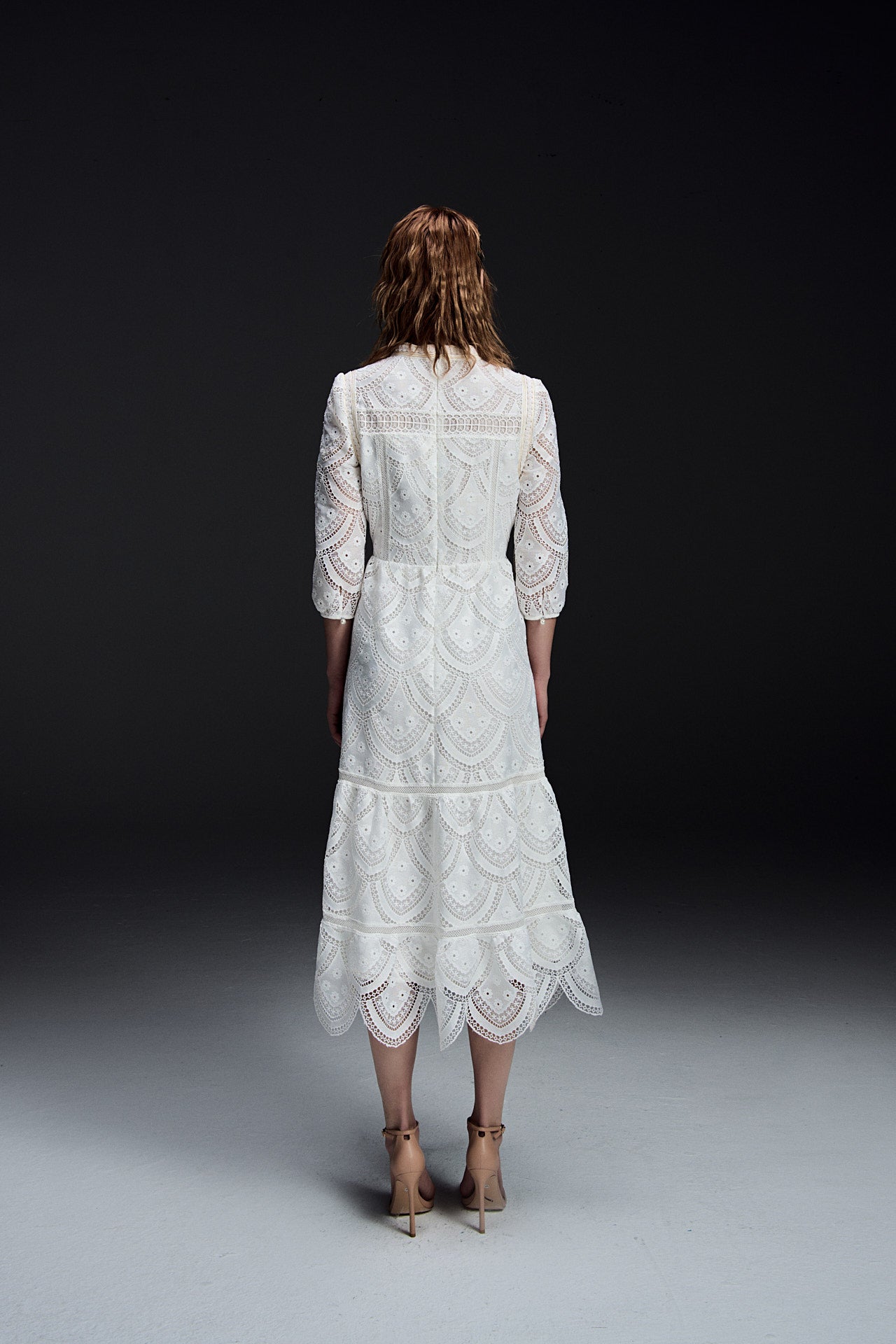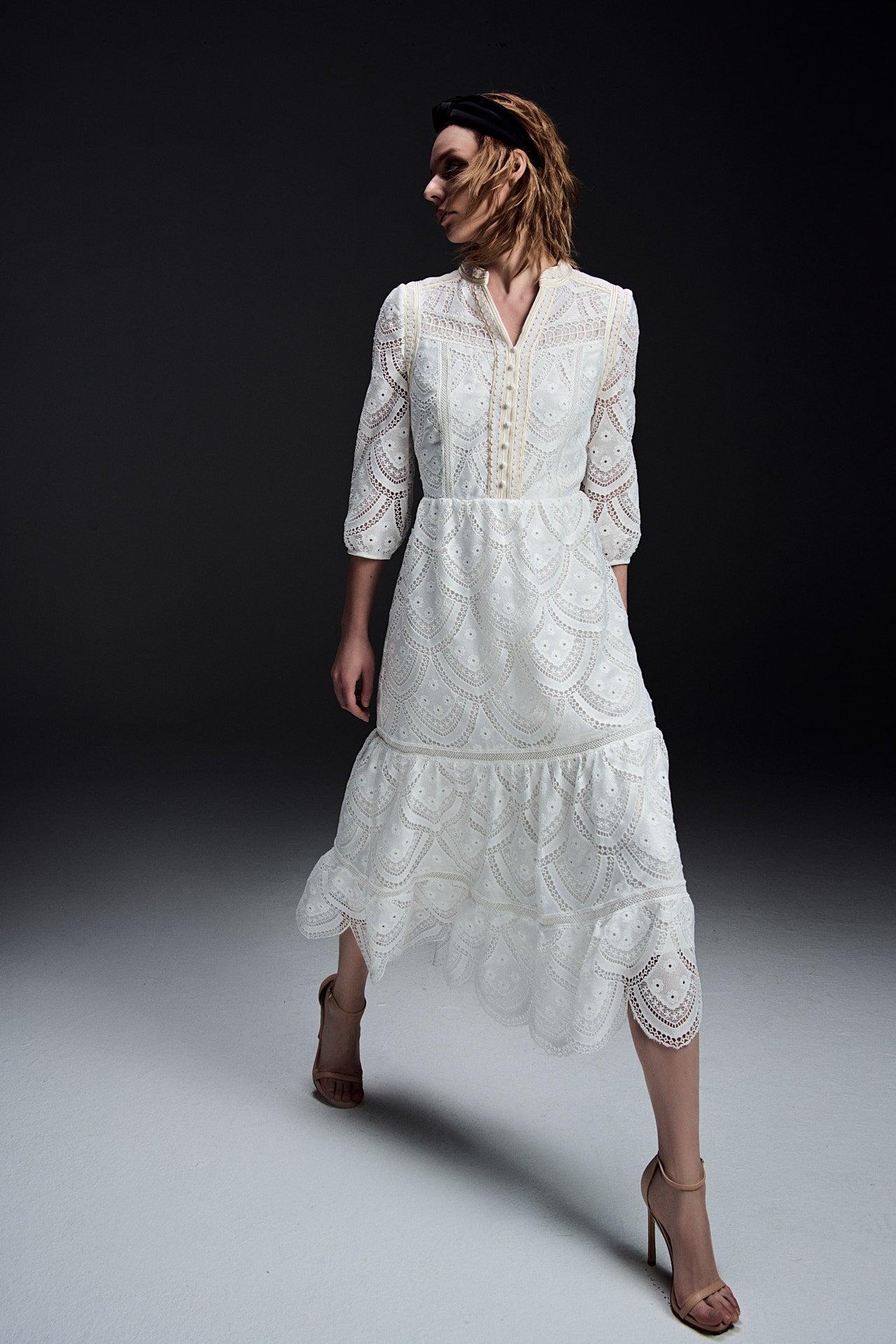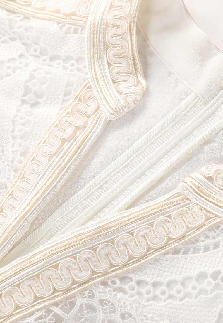 An ethereal creation fabricated in embroidered cream white lace designed with details at every corner. Highlights include an embroidered collar fastened with shank buttons and its sleeves fashioned with pearlescent charms. Dress it up with kitten heel mules.