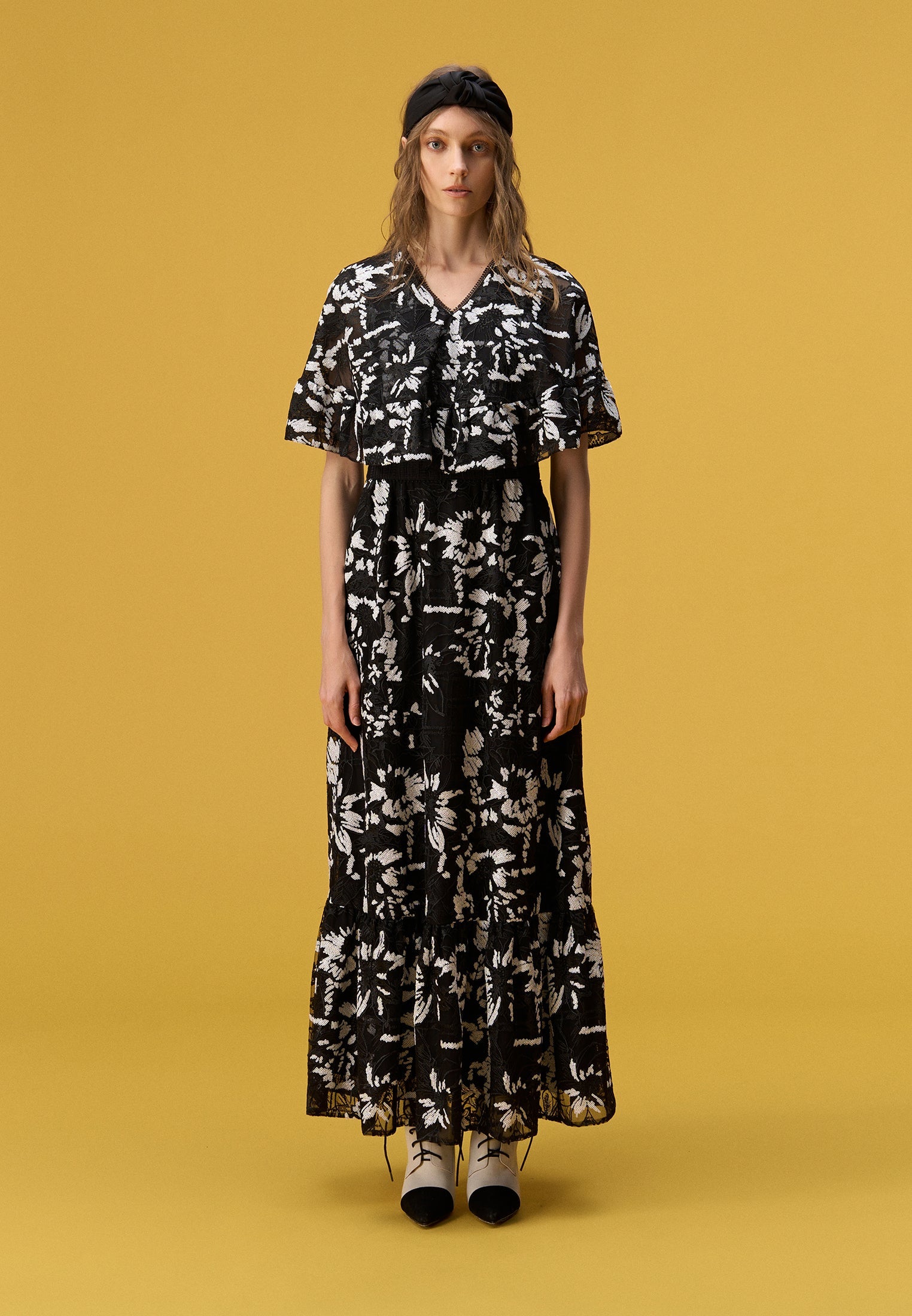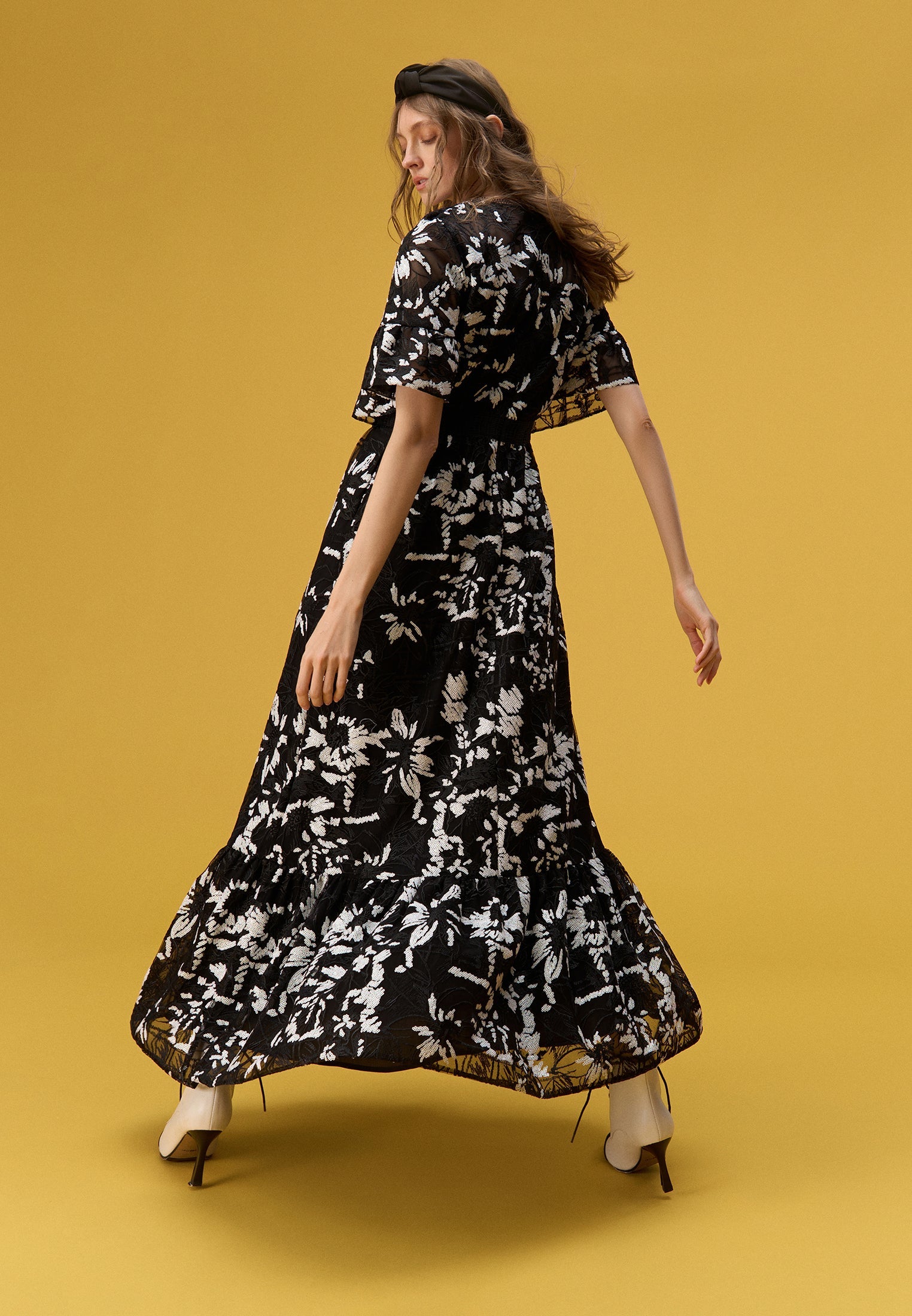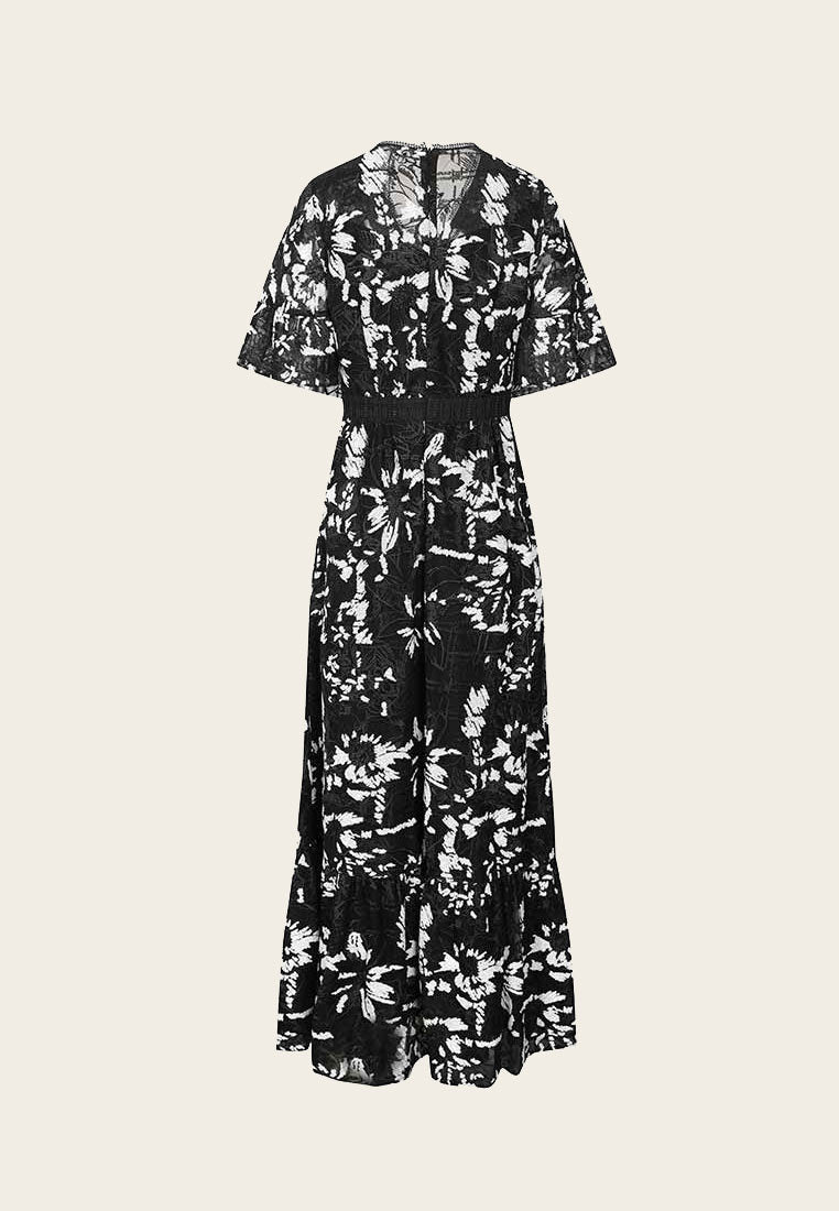 A whole black dress fully covered with contrasting punchy pattern. Low-key embroidered same Colorway floral pattern embellished with sequined abstract white floral pattern on the top, resulting rich details in the piece. Collar delicately finished up with fine black lace.