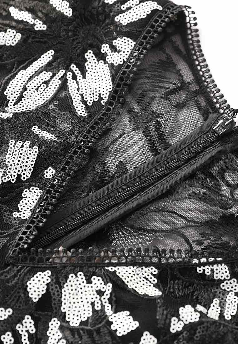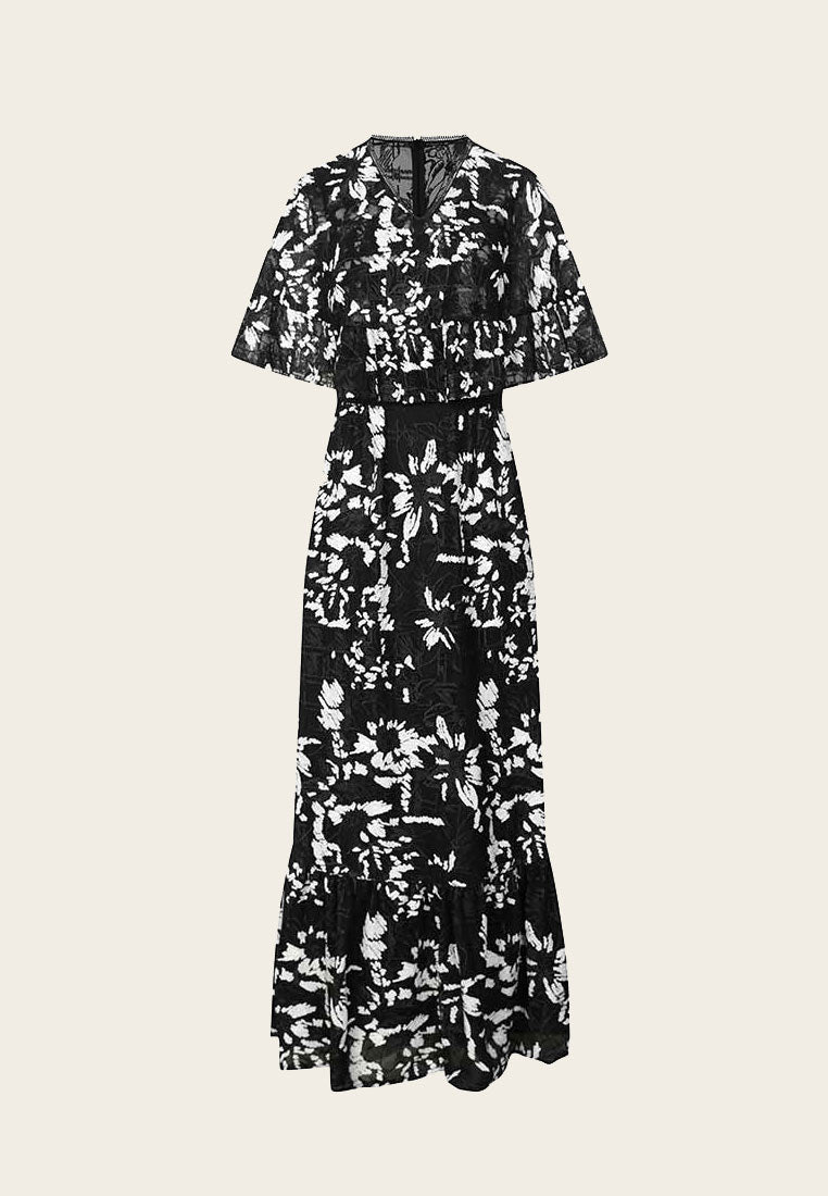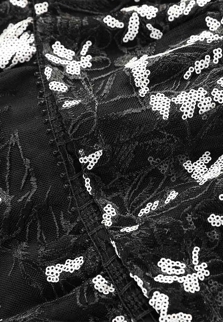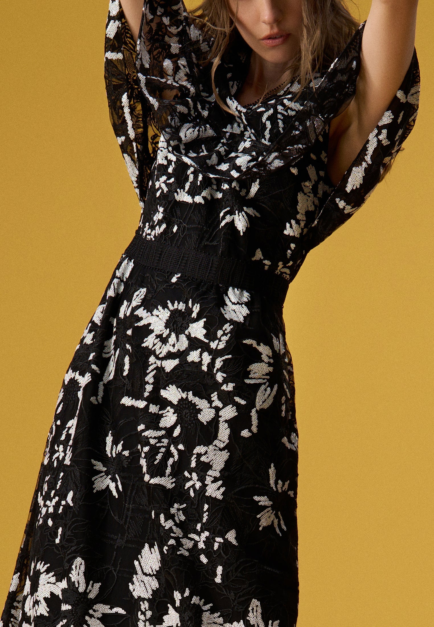 A whole black dress fully covered with contrasting punchy pattern. Low-key embroidered same Colorway floral pattern embellished with sequined abstract white floral pattern on the top, resulting rich details in the piece. Collar delicately finished up with fine black lace.