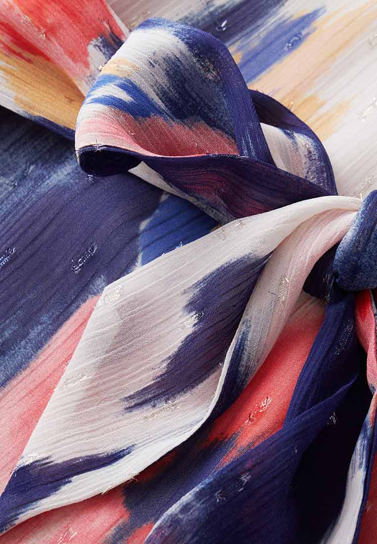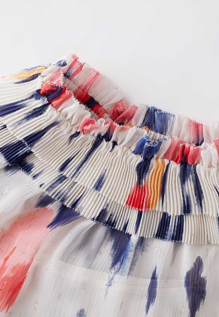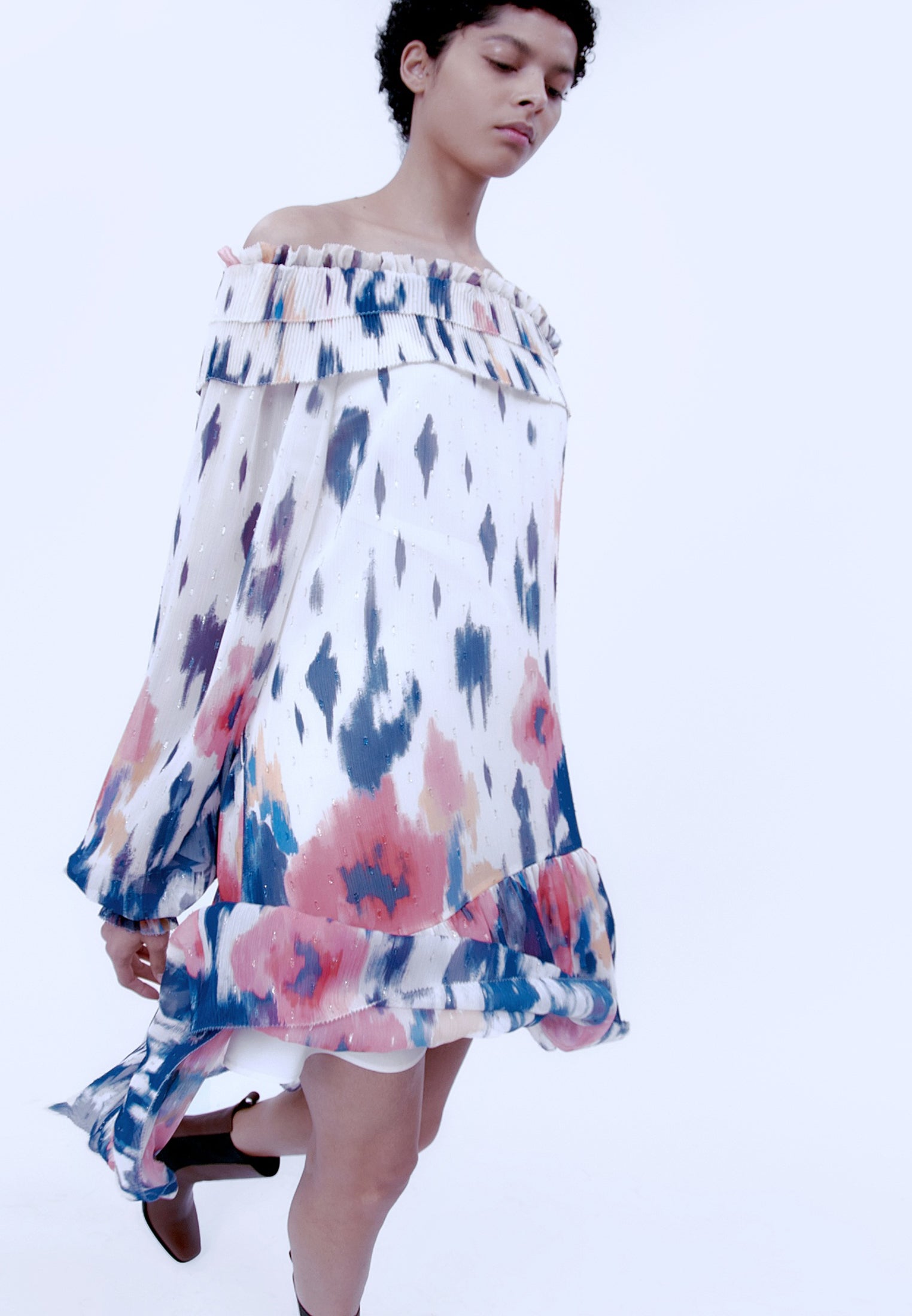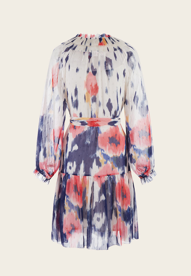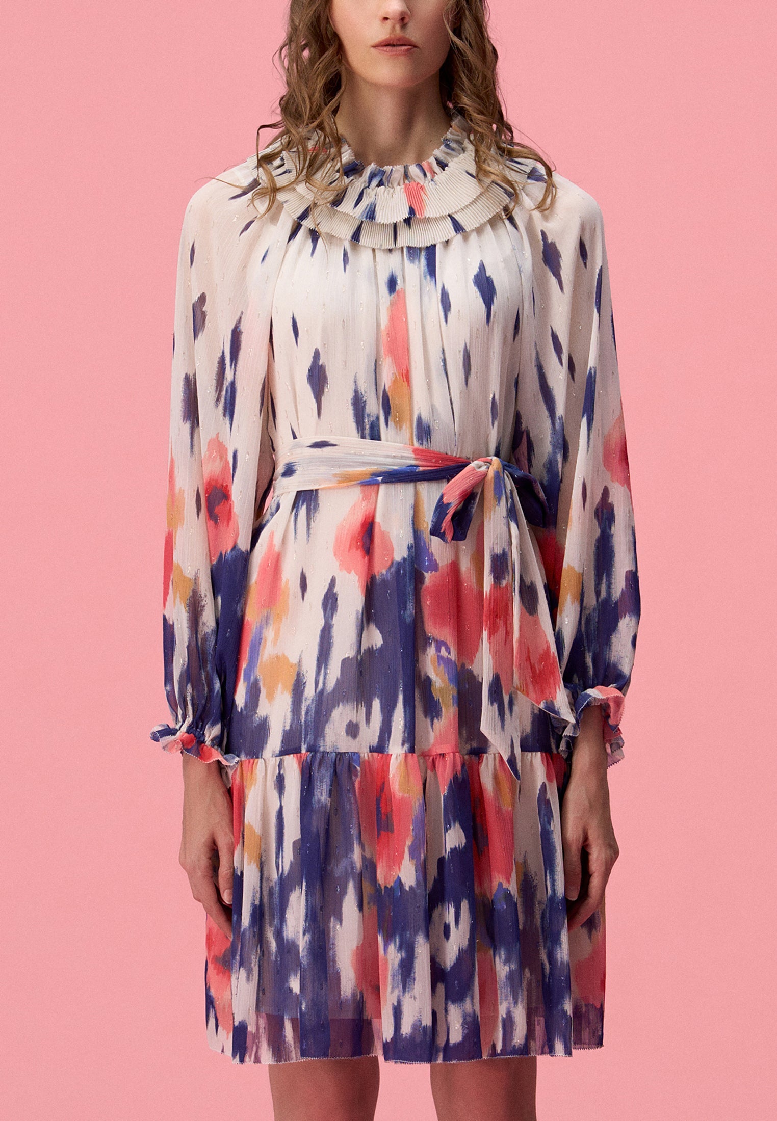 Abstract floral pattern throughout. Radial ruffle collar symbolise a floral image, echoing the theme of the piece. A piece flexible for adapting your styling. Wear it as round-neck or off-shoulder dress, choose the best way to bring up your charisma with or without the belt.