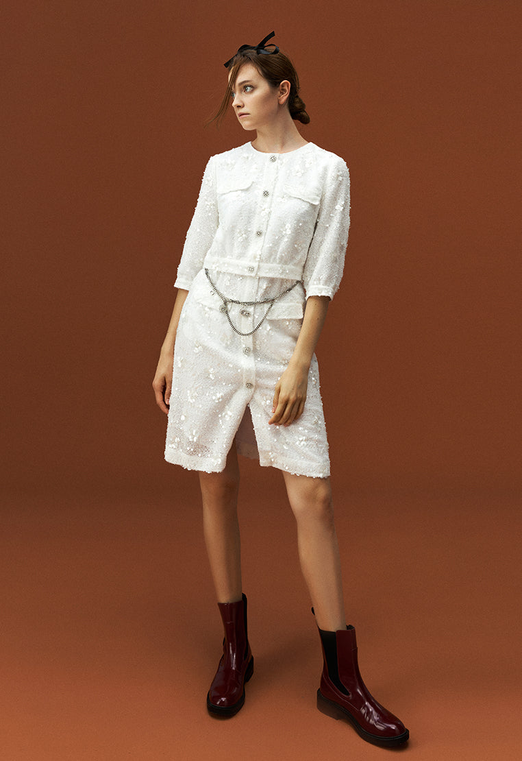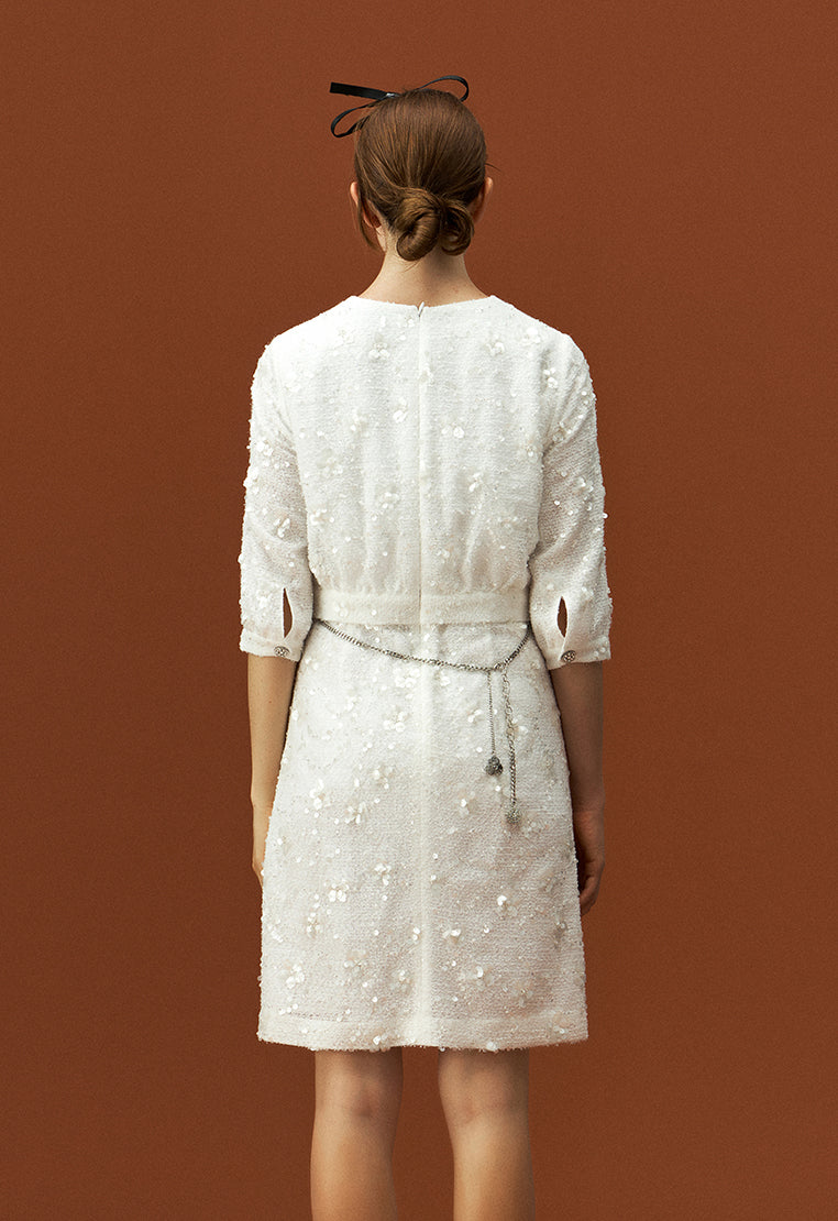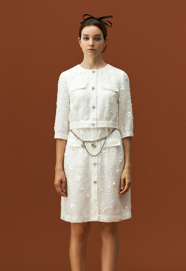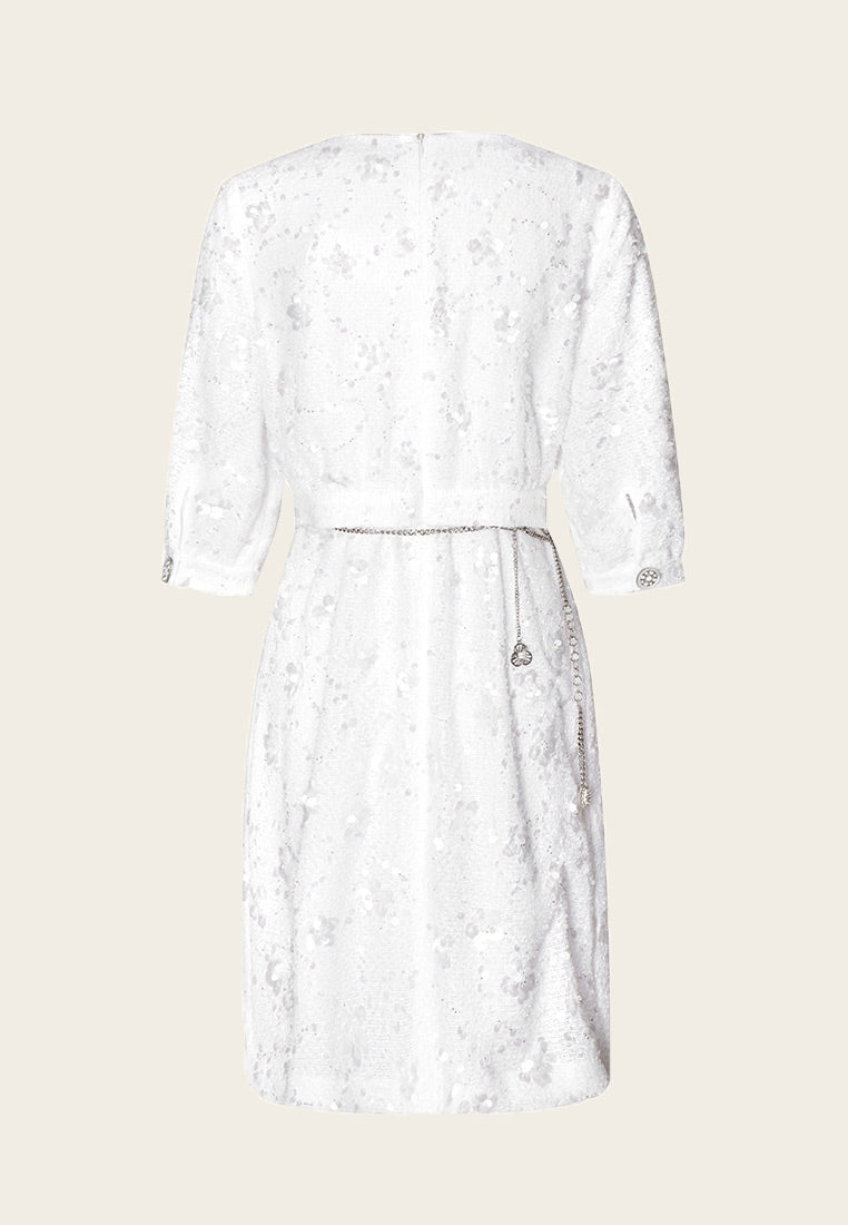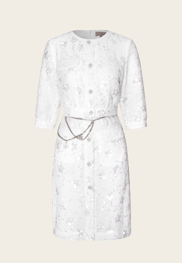 White Tweed Sequin and Bead Detailing Dress with Chain Belt
