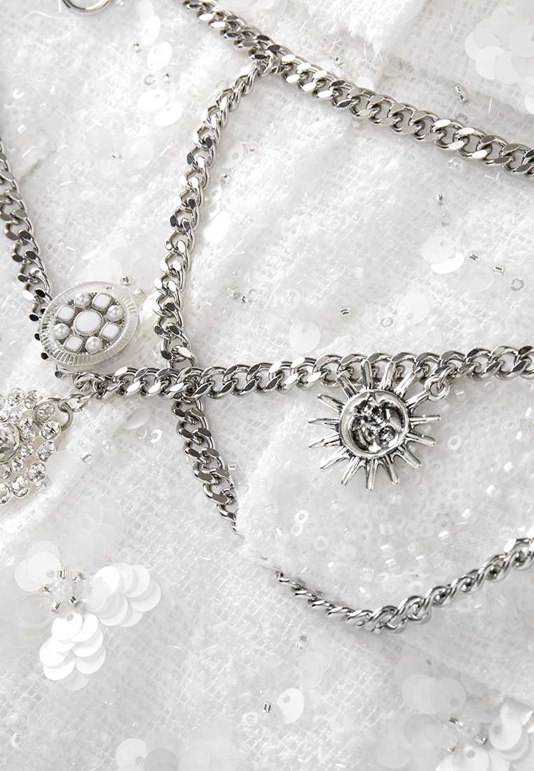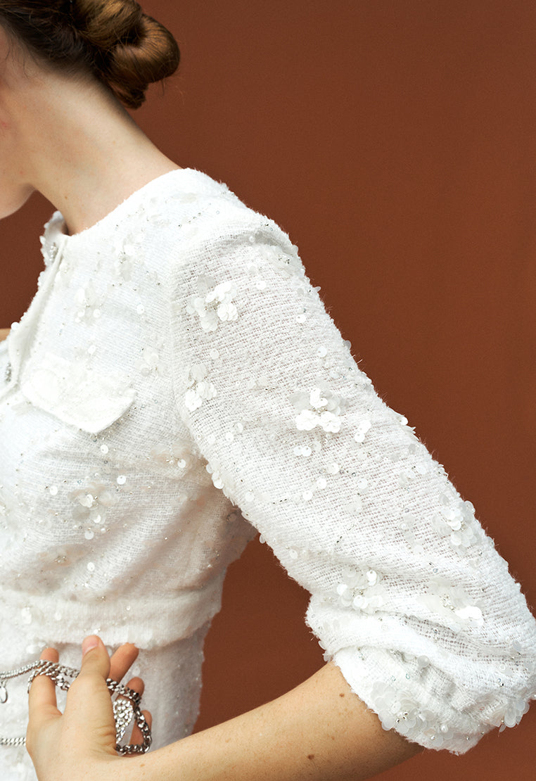 A delicate piece with exquisite details, iteration of sky filled with morning stars. White tweed encrusted with same colorway white sequin and bead detailing. Finishing up with attached rhinestone and metal detailing belt chain, reminiscent of star cluster and planets of galaxy. Wear yours to commercial events and conferences.