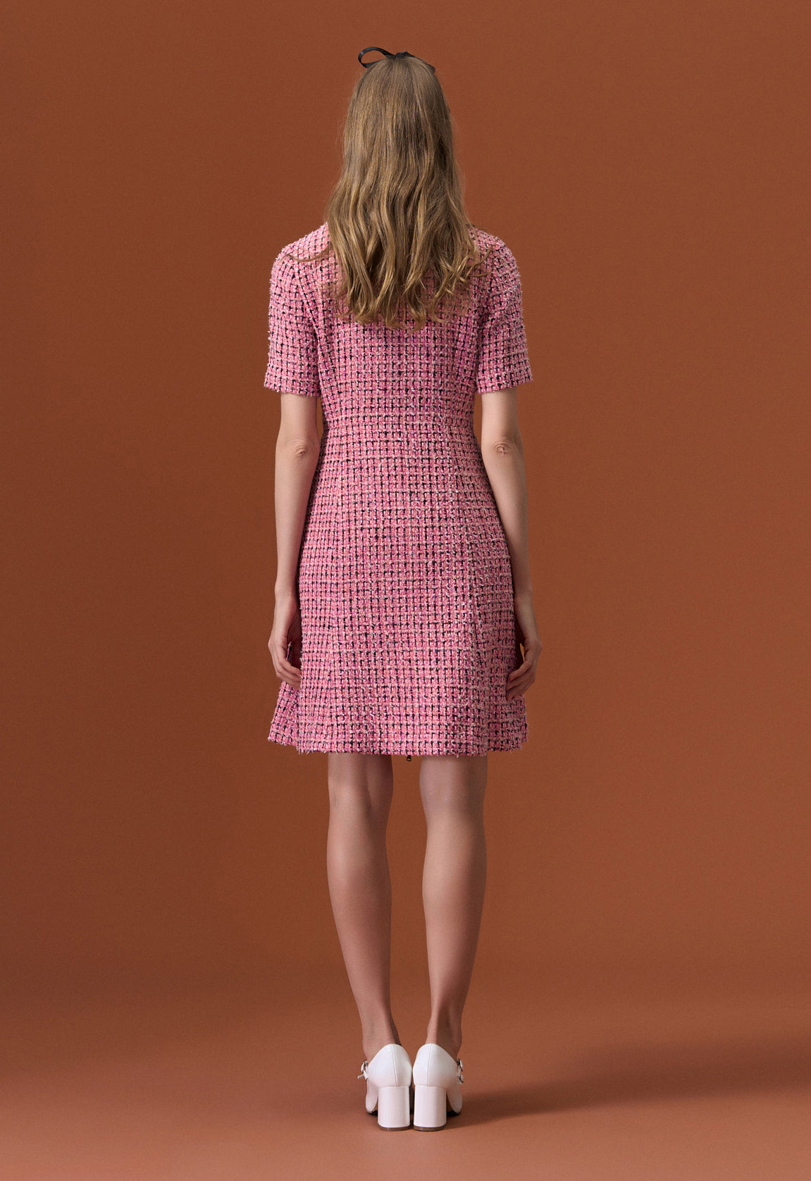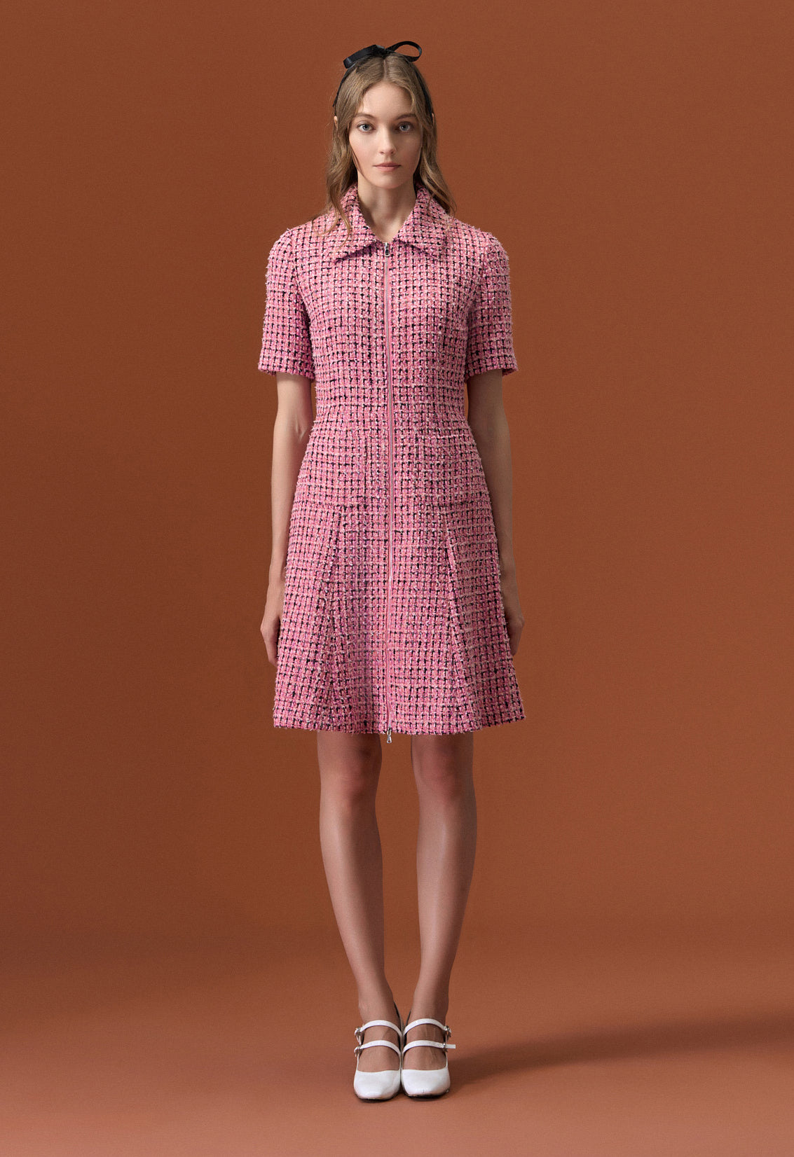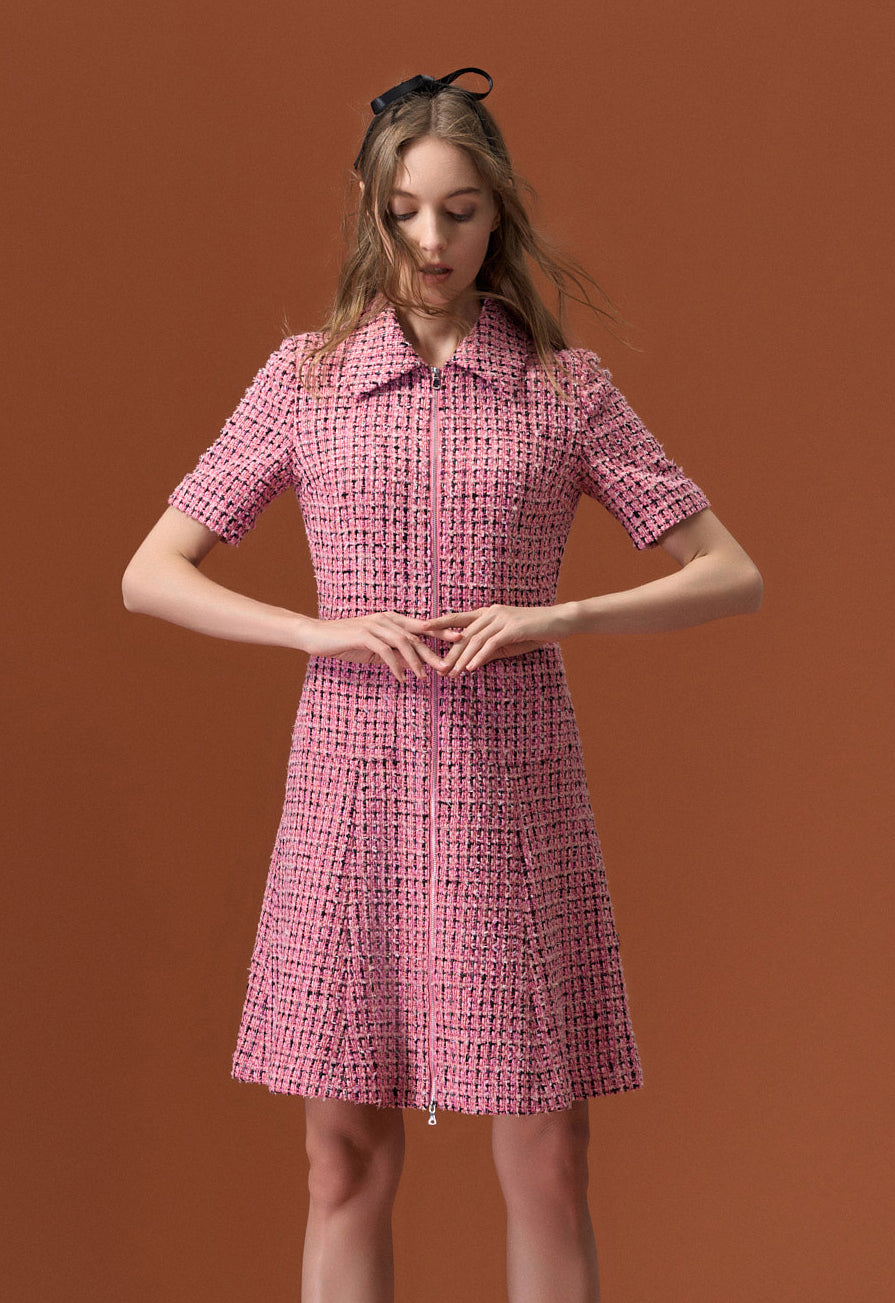A girly approach of tweed dress. An eye-catching approach of color choice. Inspired by sunset in Paris, sharp pink captures the beautiful color of the sky that disappears when night arrives before long. Finishing up with a bold front fly, echoing the punchy vibe of the piece.