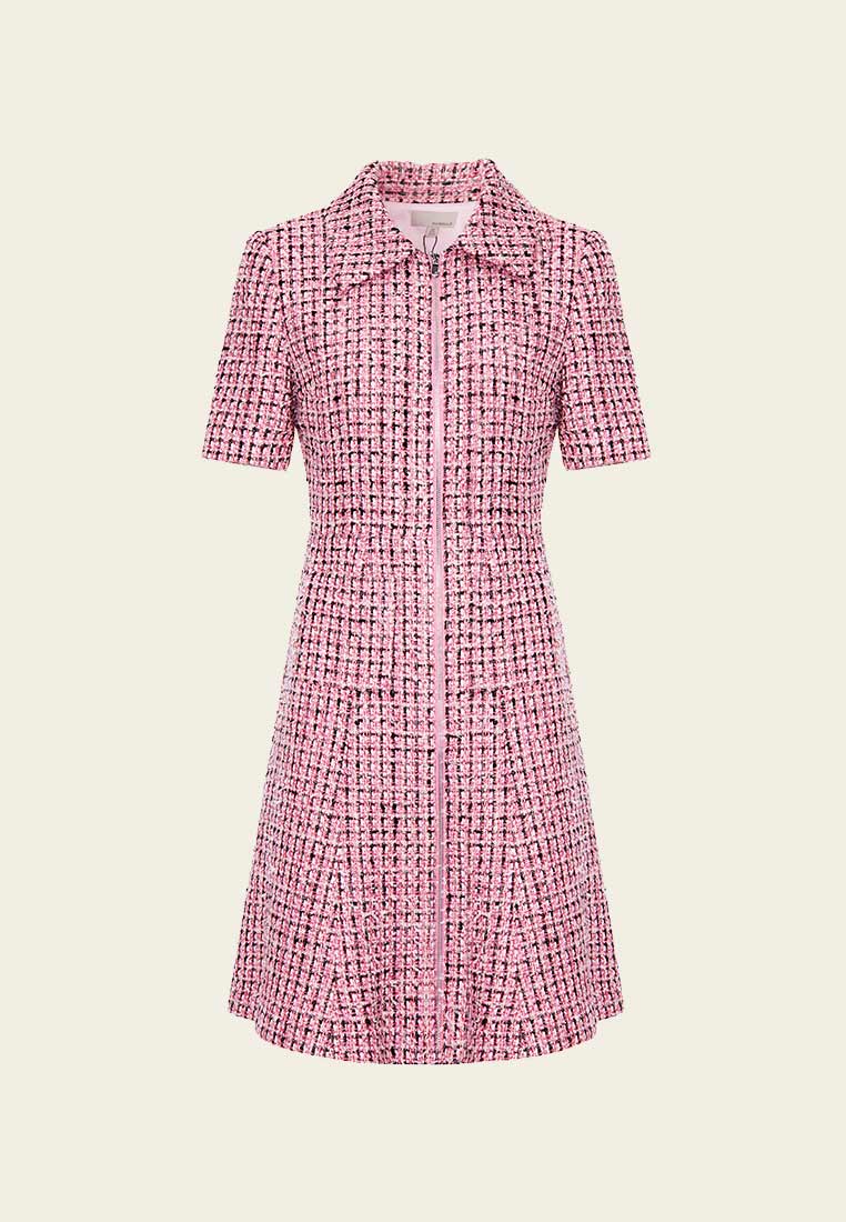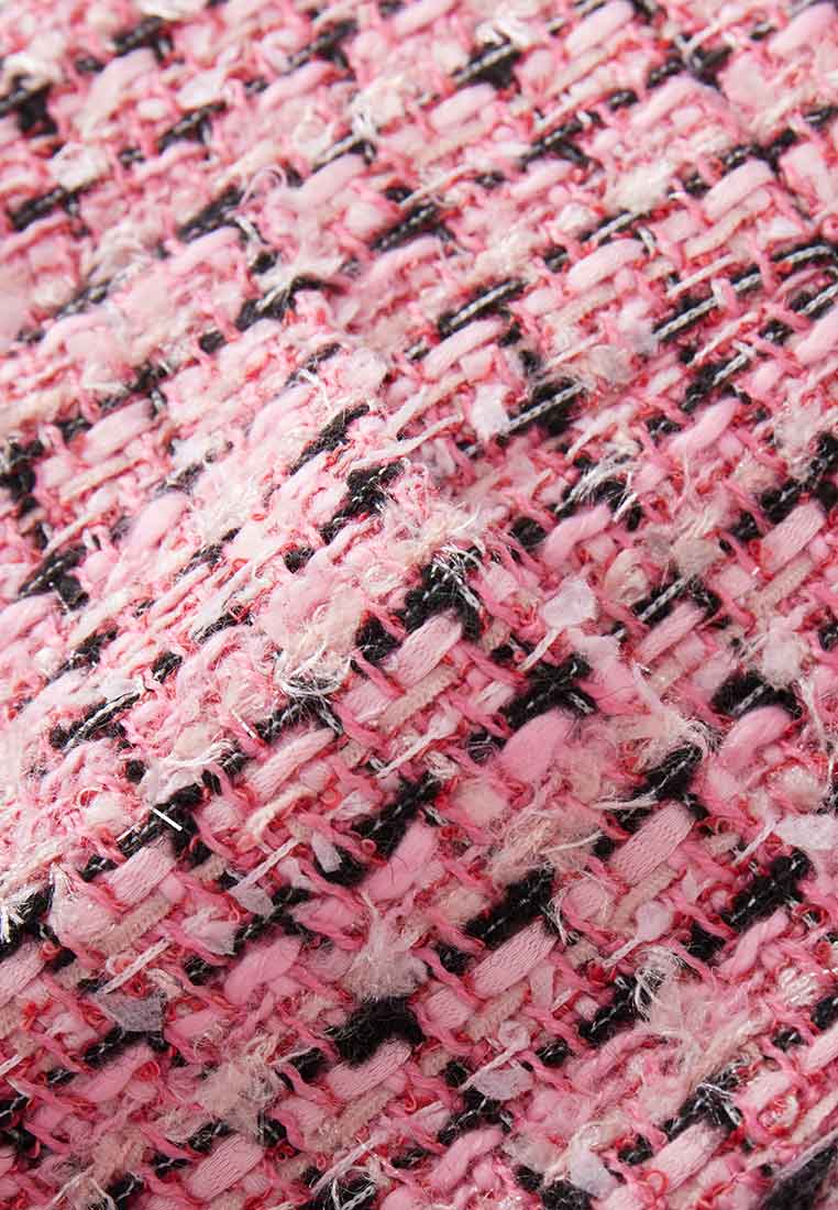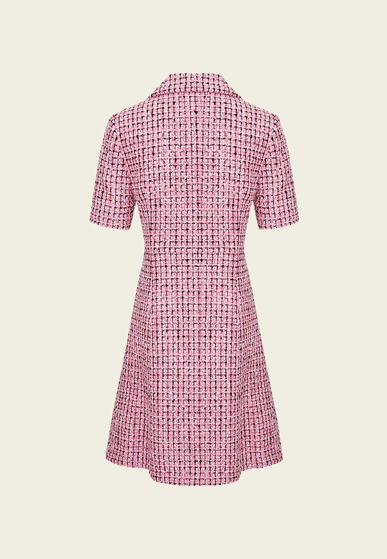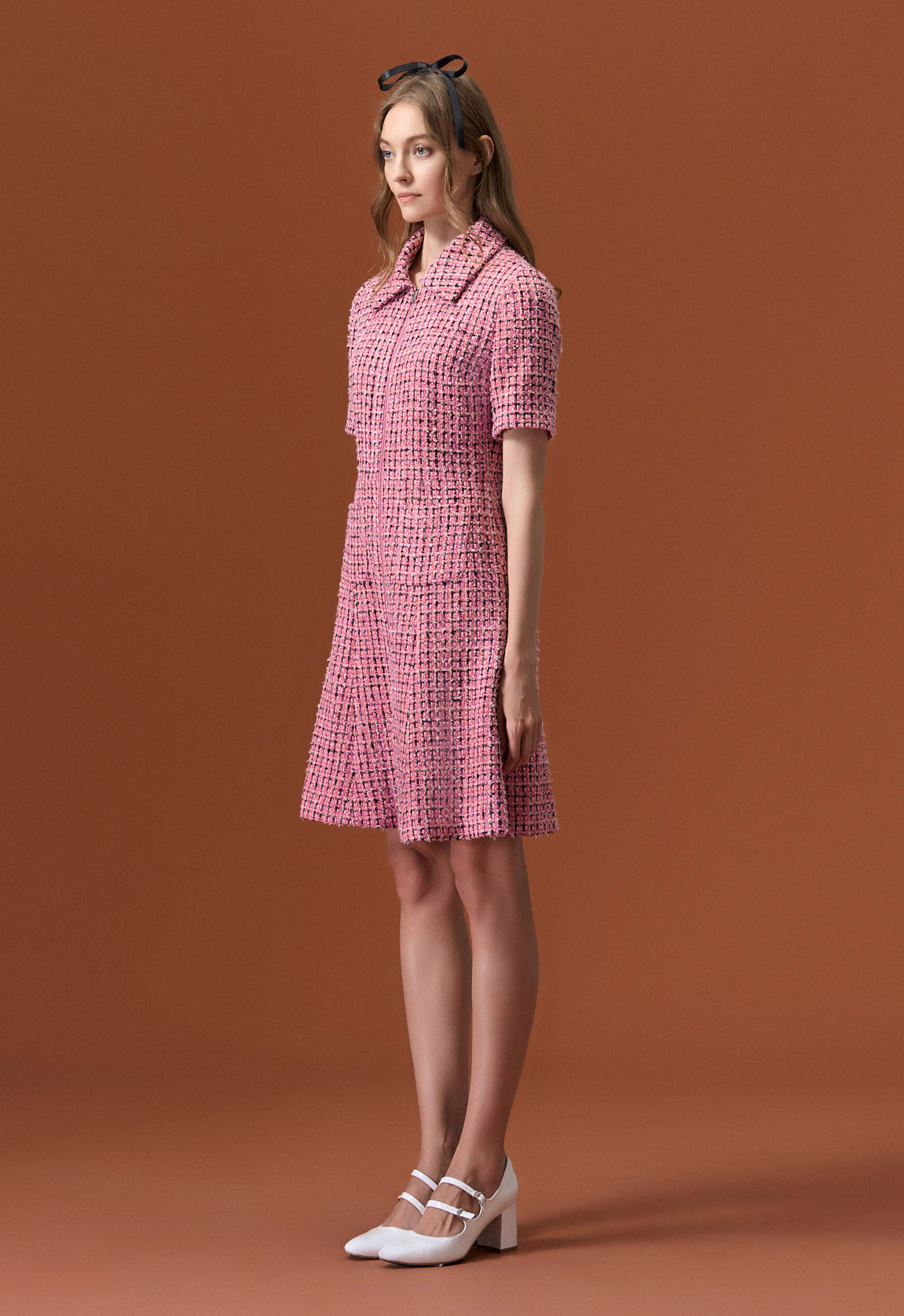 A girly approach of tweed dress. An eye-catching approach of color choice. Inspired by sunset in Paris, sharp pink captures the beautiful color of the sky that disappears when night arrives before long. Finishing up with a bold front fly, echoing the punchy vibe of the piece.