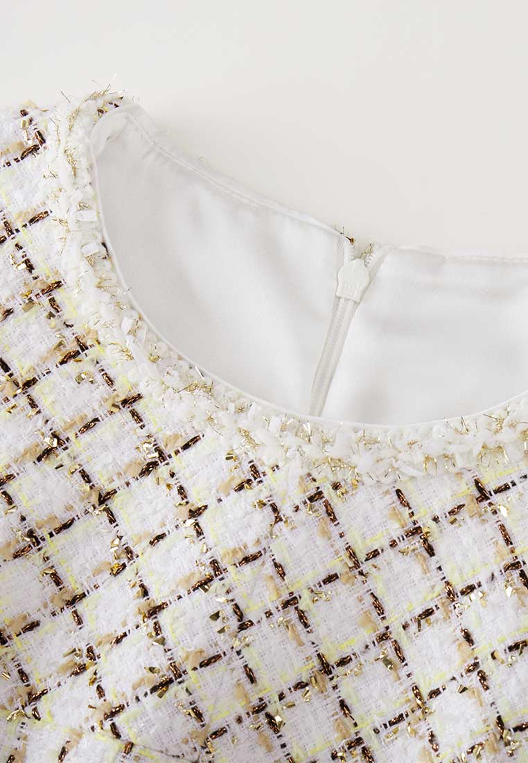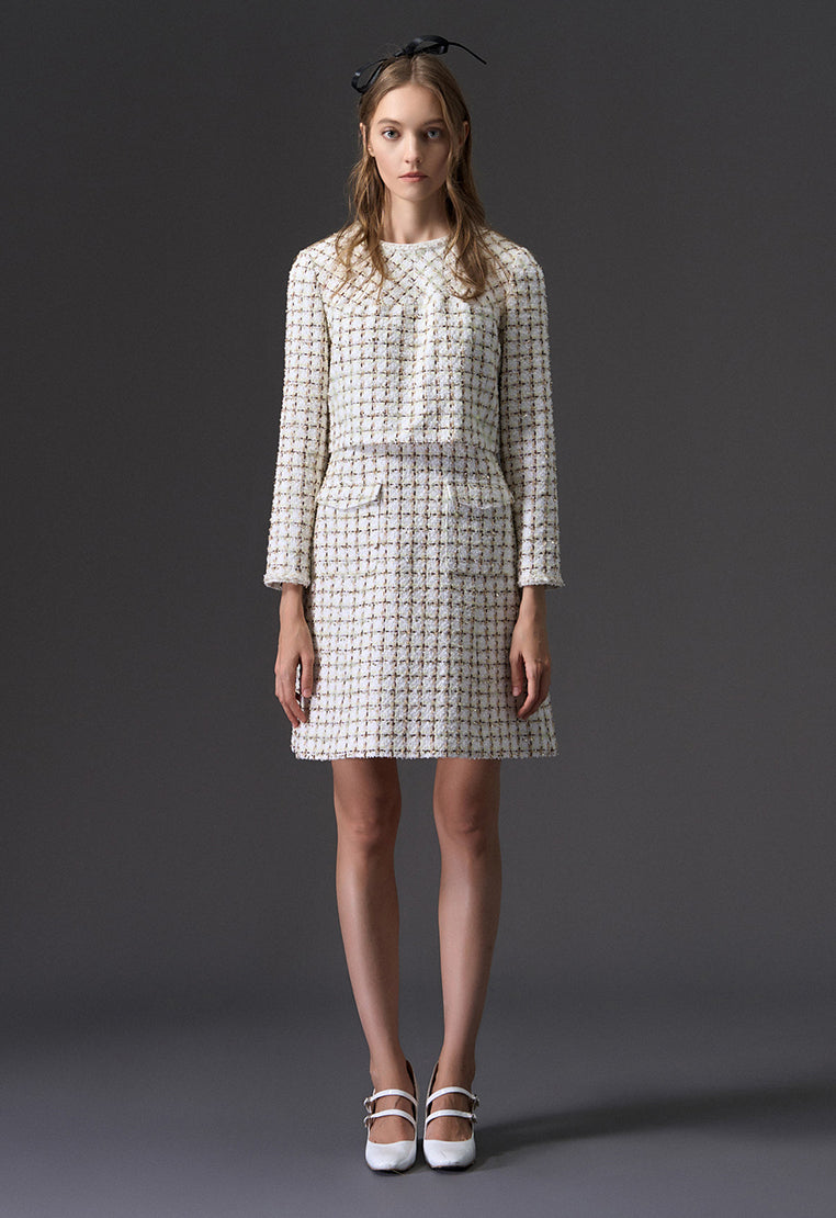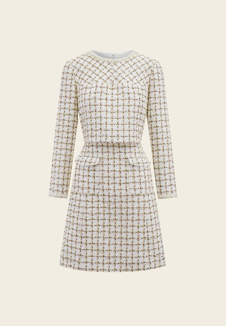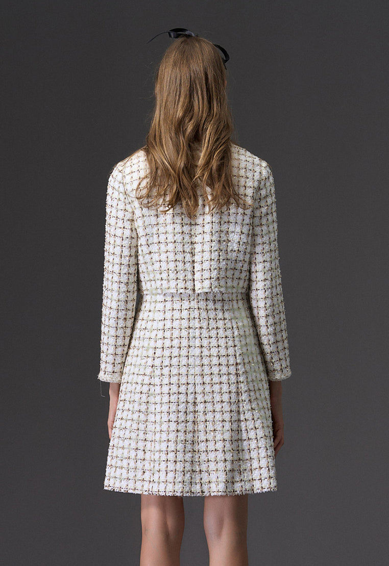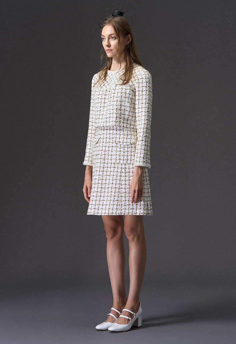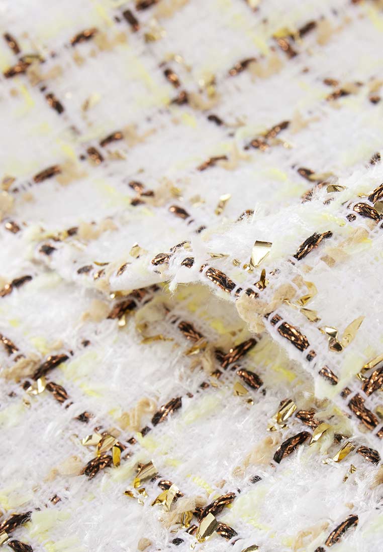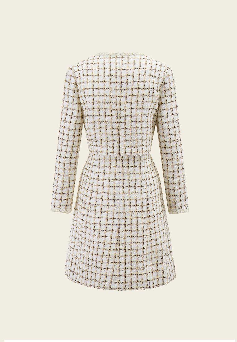 A refined piece that brings up your feminine charisma. Check-detailing woven by earthy tone colorways on white tweed, brighten up by fluorescent yellow and golden detailing. Fake two pieces delightfully accentuate the waistline. Two front pockets along thighs. A piece that will surely brighten up your day, best for meetings and daytime events.
