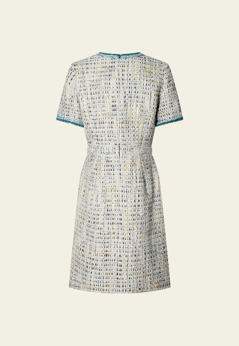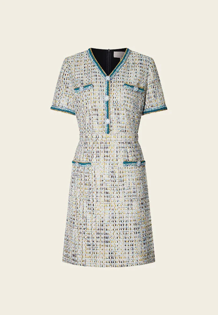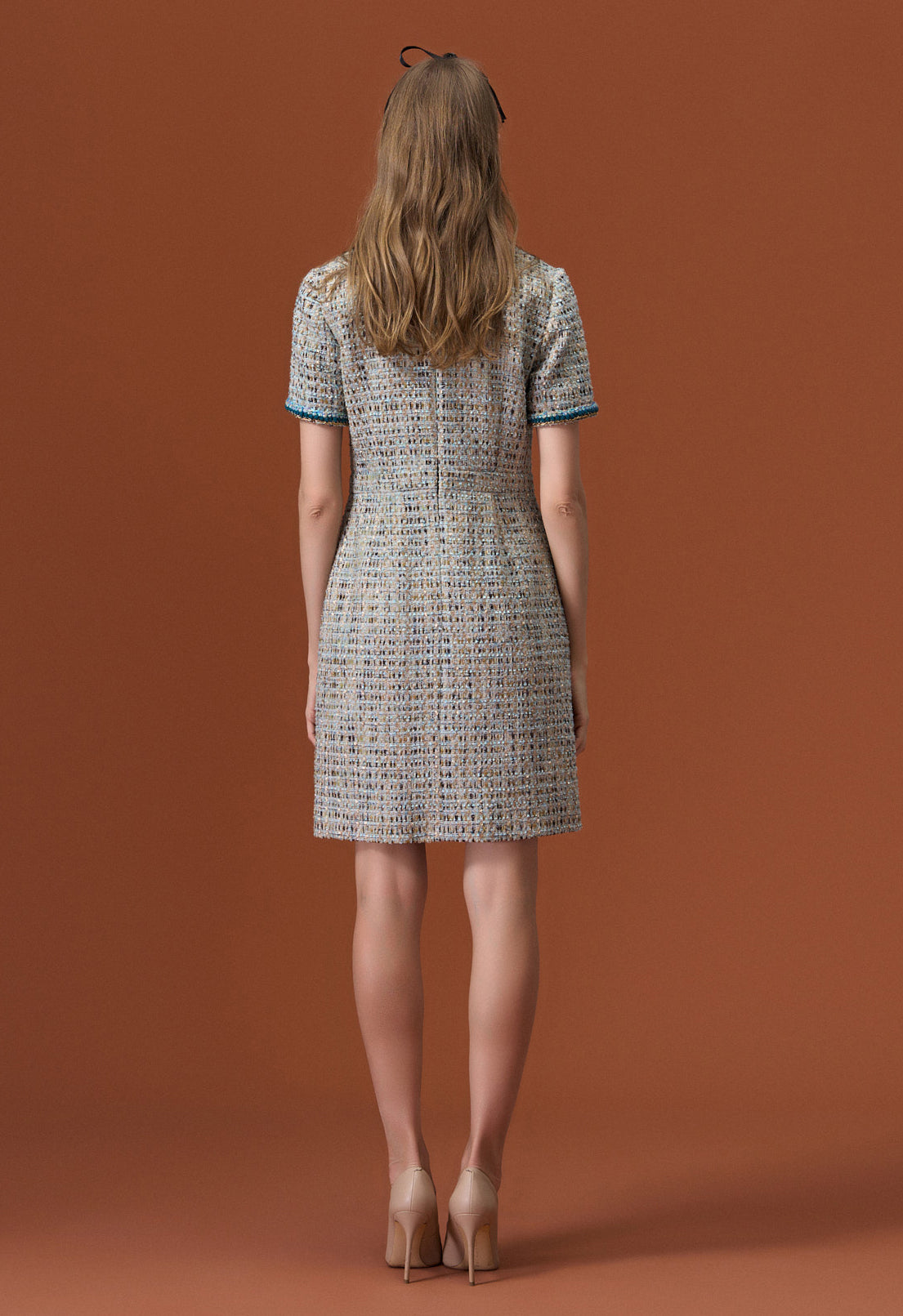 Earth Tone Blue And Gold Detailing Tweed Dress