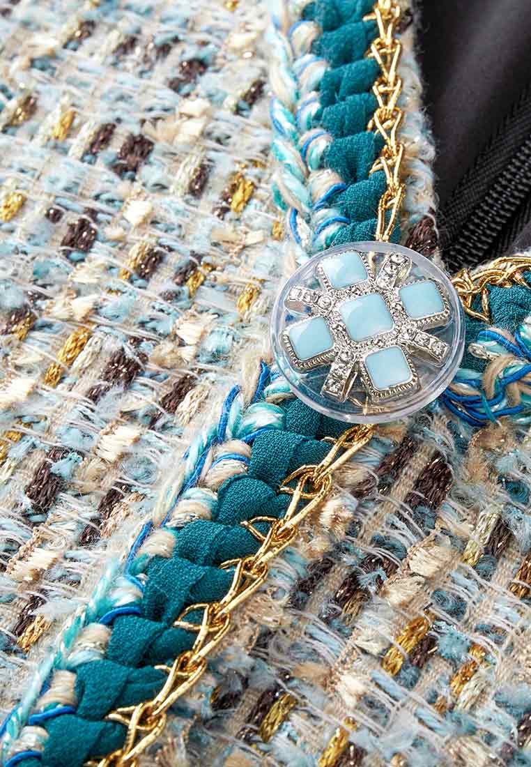 The item boast teal colorway front, cuffs, and pocket edges, with interwoven golden chain. Symphonized in harmony with earth tone colorway tweed, brings up by golden thread detailing. Calf length. Front pocket, thigh pocket and front fly embellished with rhinestone and sky blue gem buttons.
