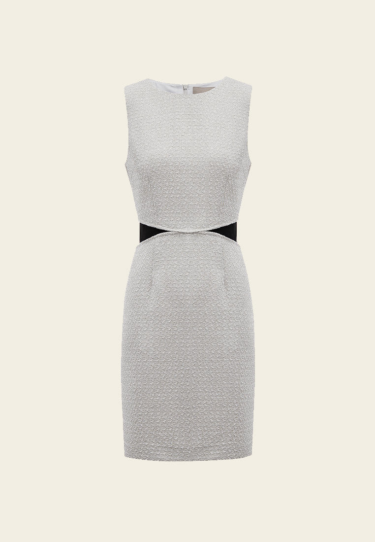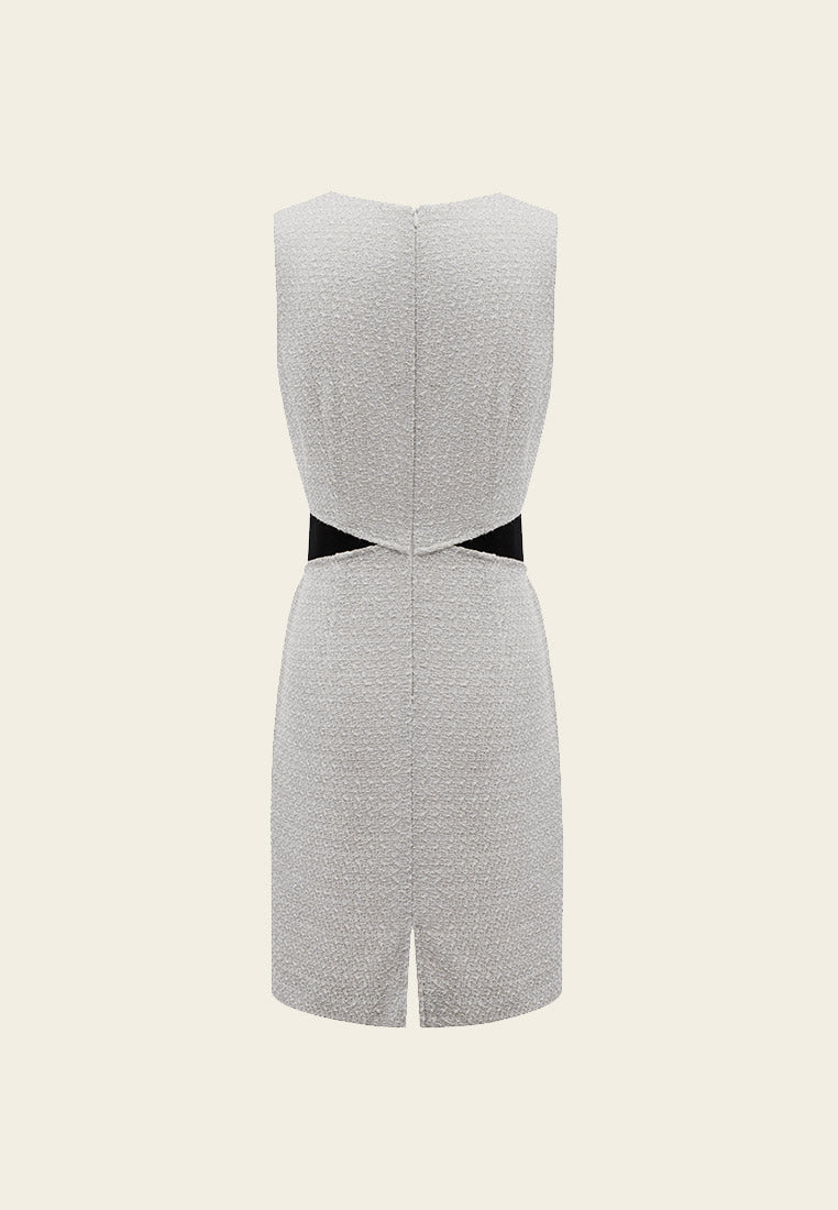 Fake Two Piece Black Detailing Sleeveless Silver Tweed Dress