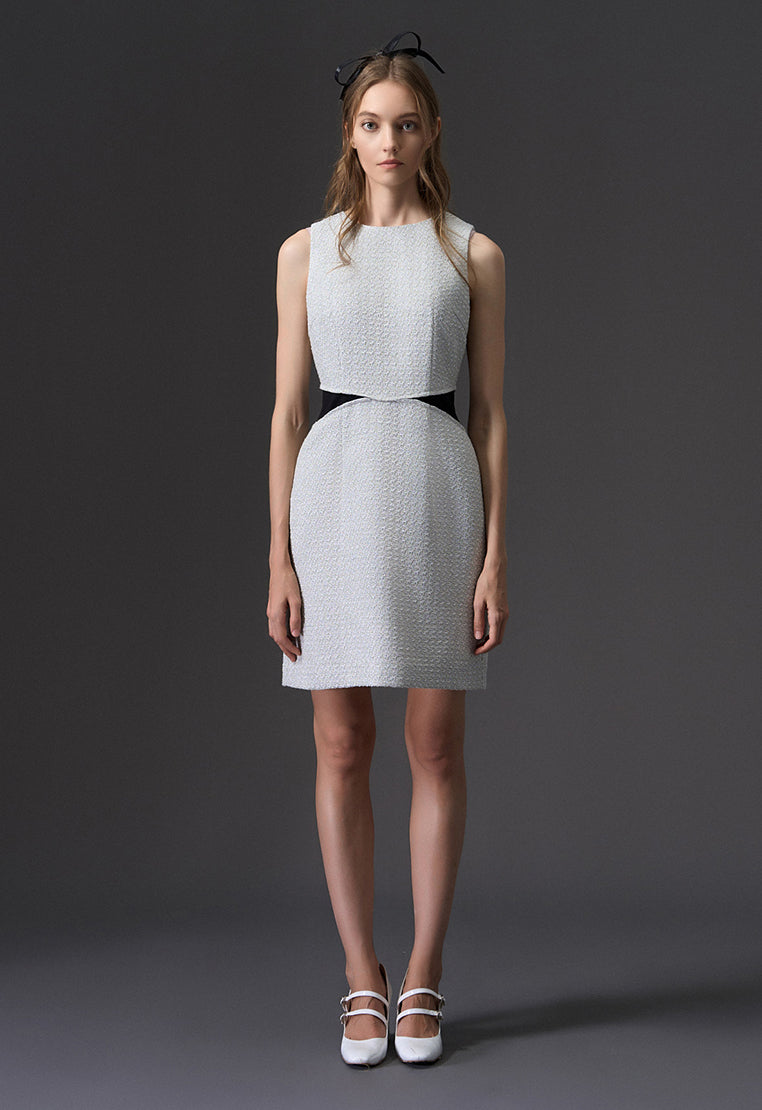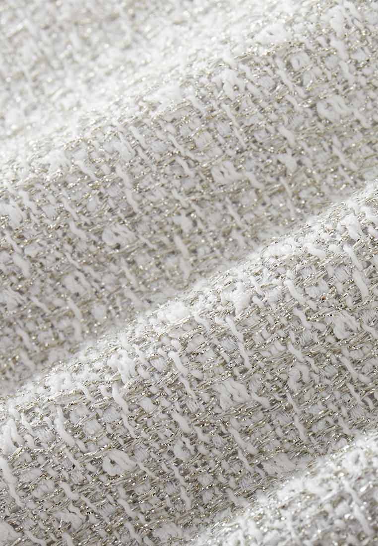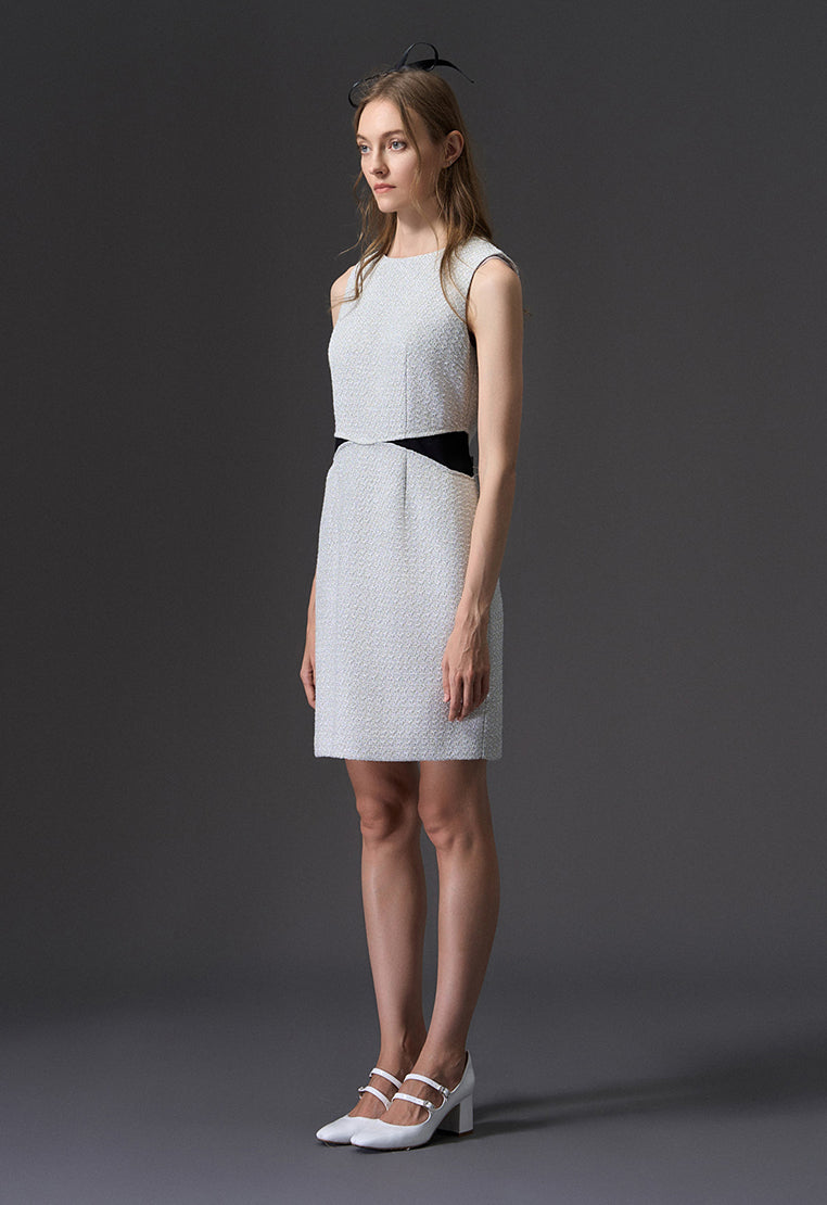 Reflecting MOISELLE's refined and sophisticated approach, tweed is frequently being used. Inspired by garden in Budapest, this tweed one-piece brings up your refined charisma in white colorway, with silver interwoven, glimmering by reflection. collarless and sleeveless. Black highlight accentuate waistline.