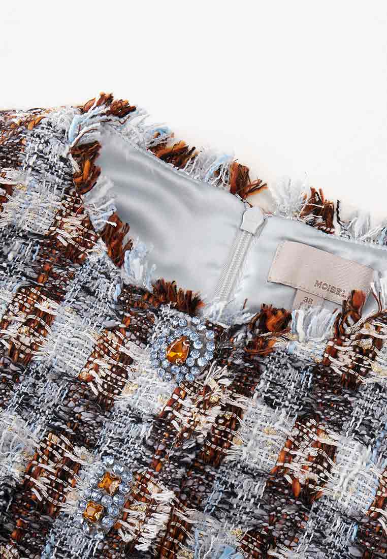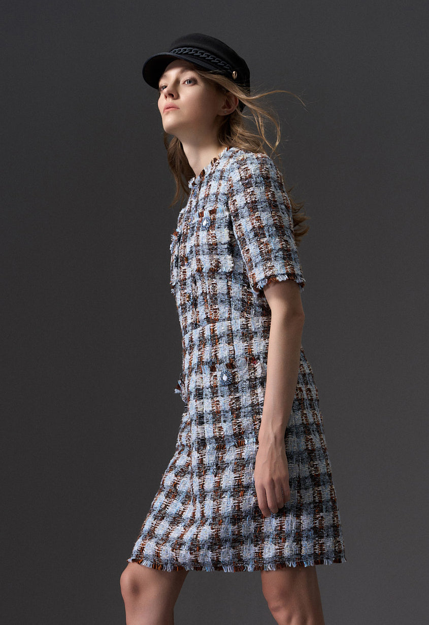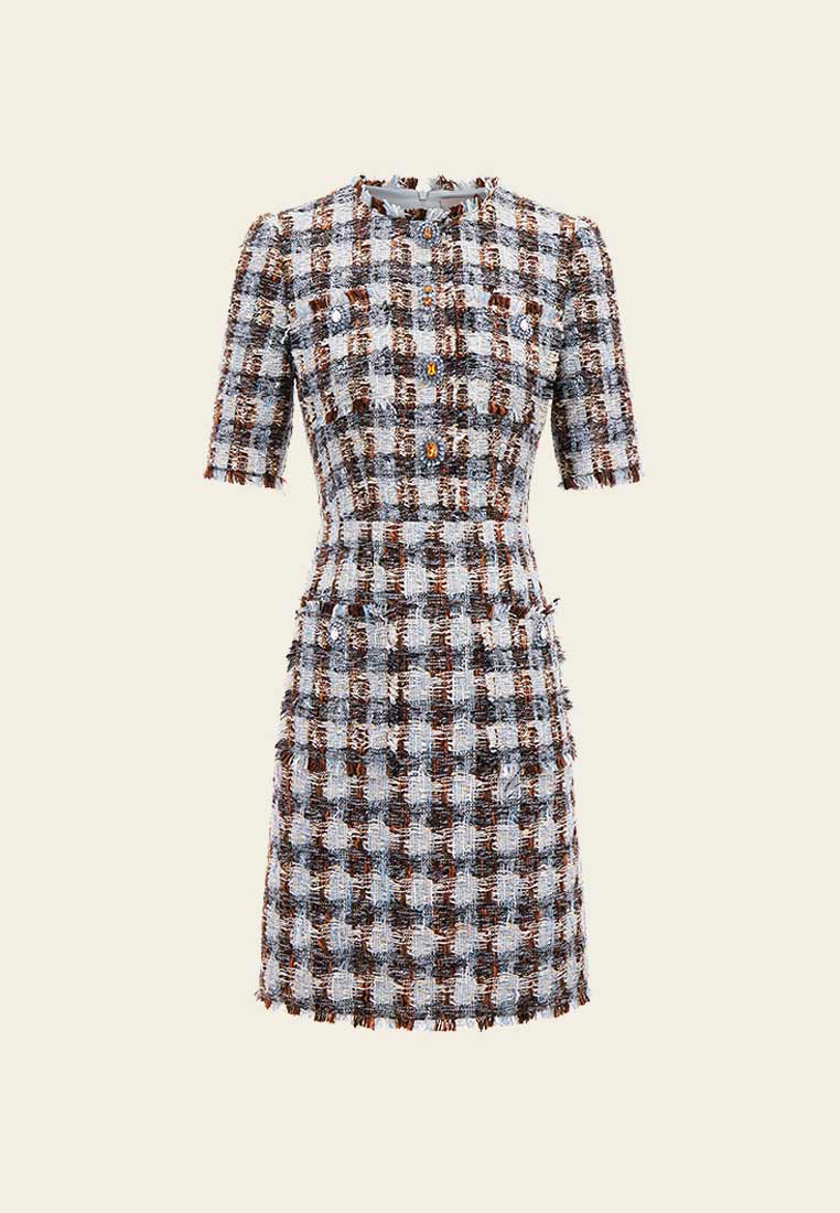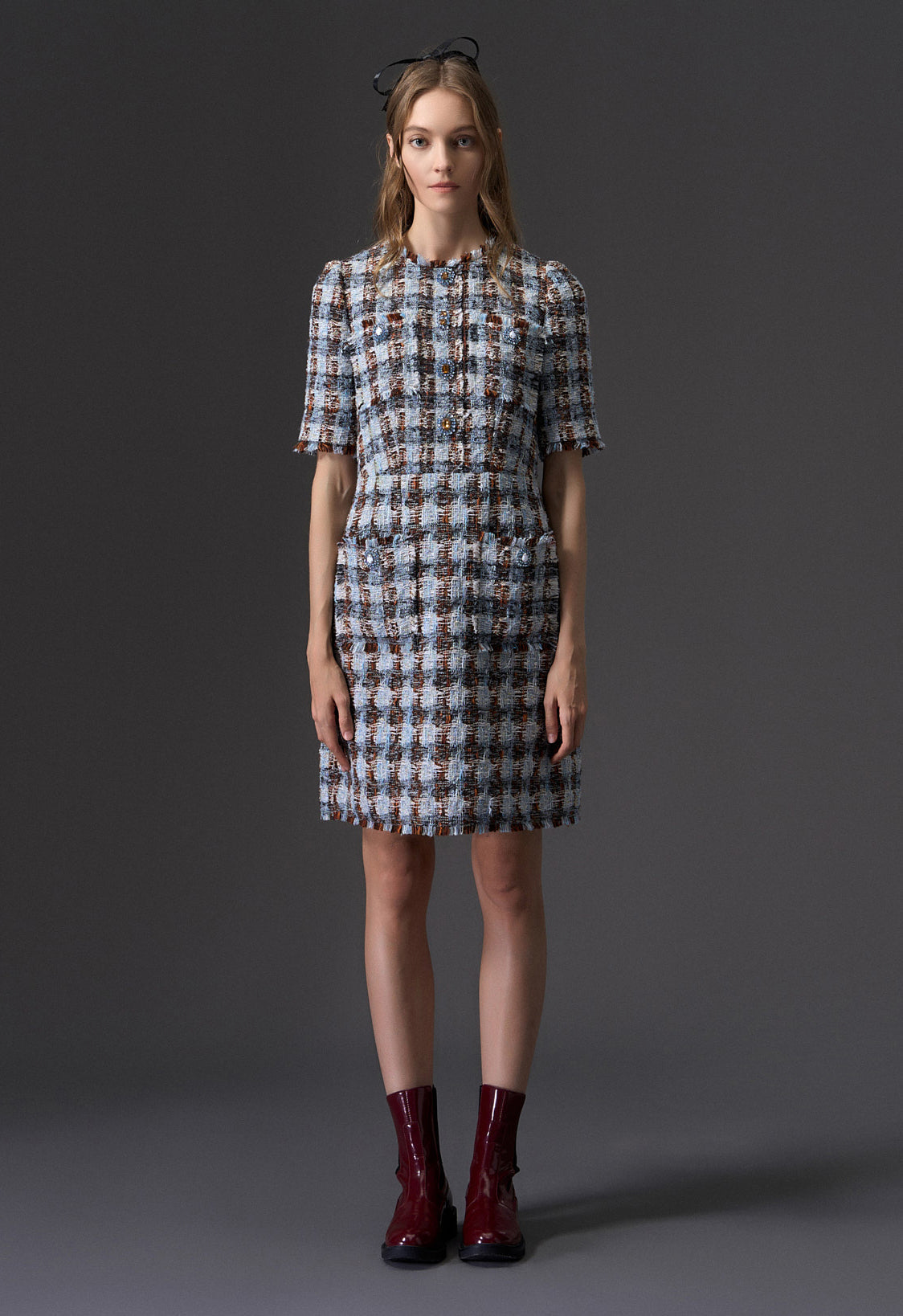 A classic tweed dress with a punchy twist, by the collision of amber and light blue. Who would have thought of such a distinctive piece would have outcomed by the two classic and understated colorway? Finishing up by rhinestone embedded buttons, wear yours to commercial events.