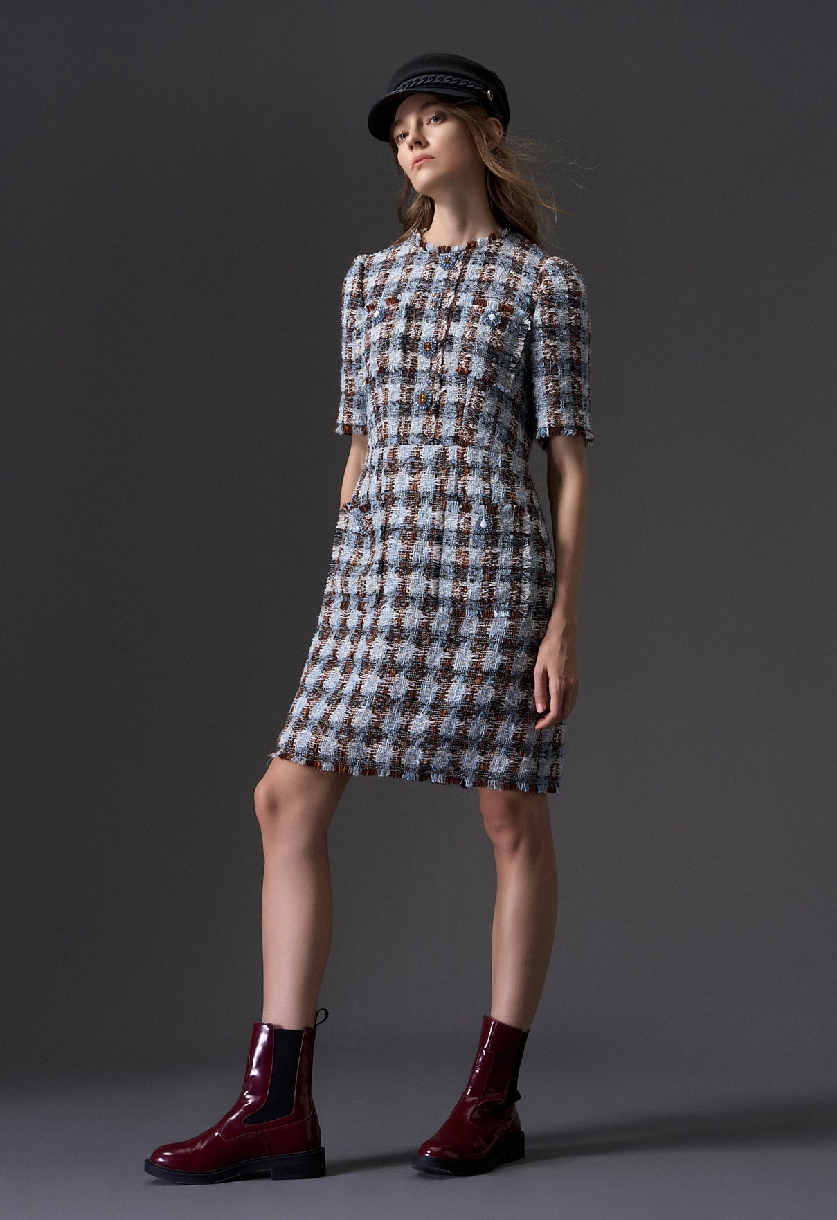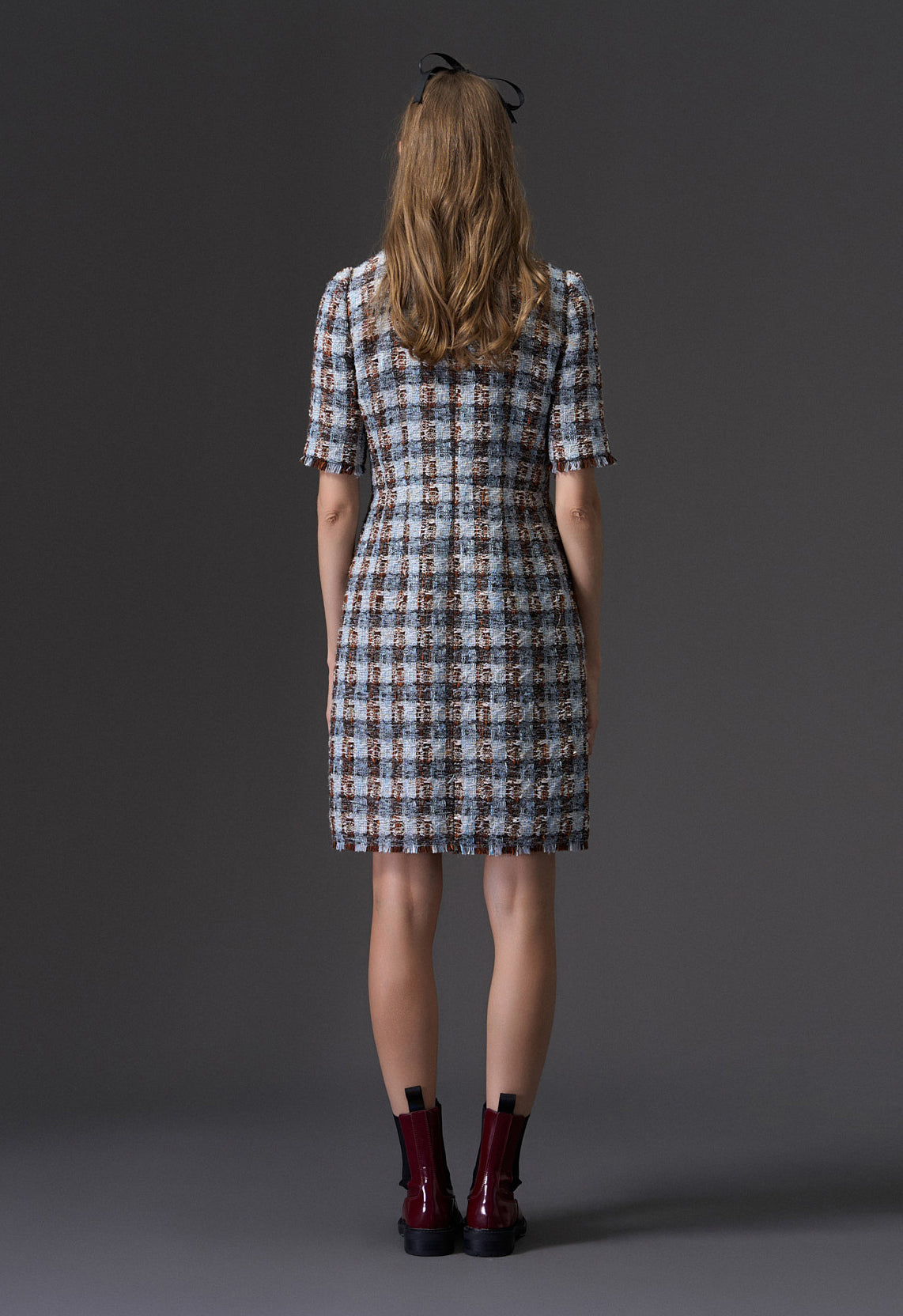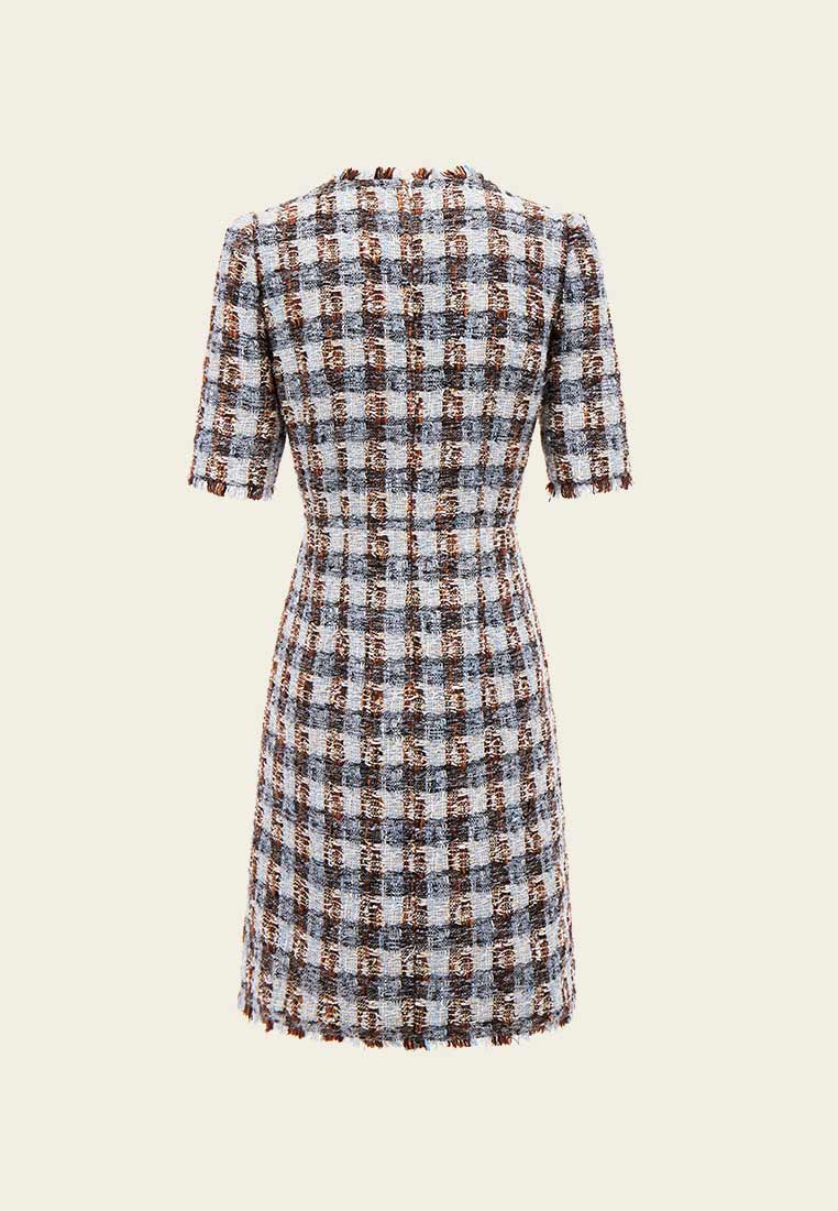 A classic tweed dress with a punchy twist, by the collision of amber and light blue. Who would have thought of such a distinctive piece would have outcomed by the two classic and understated colorway? Finishing up by rhinestone embedded buttons, wear yours to commercial events.