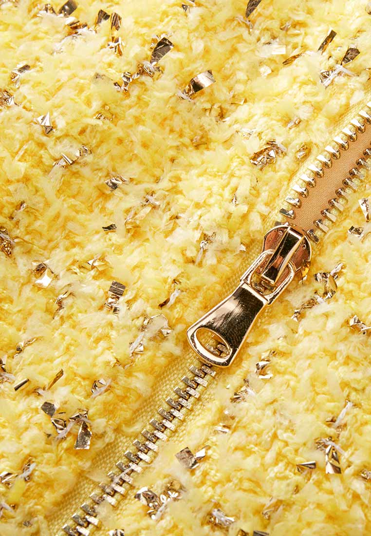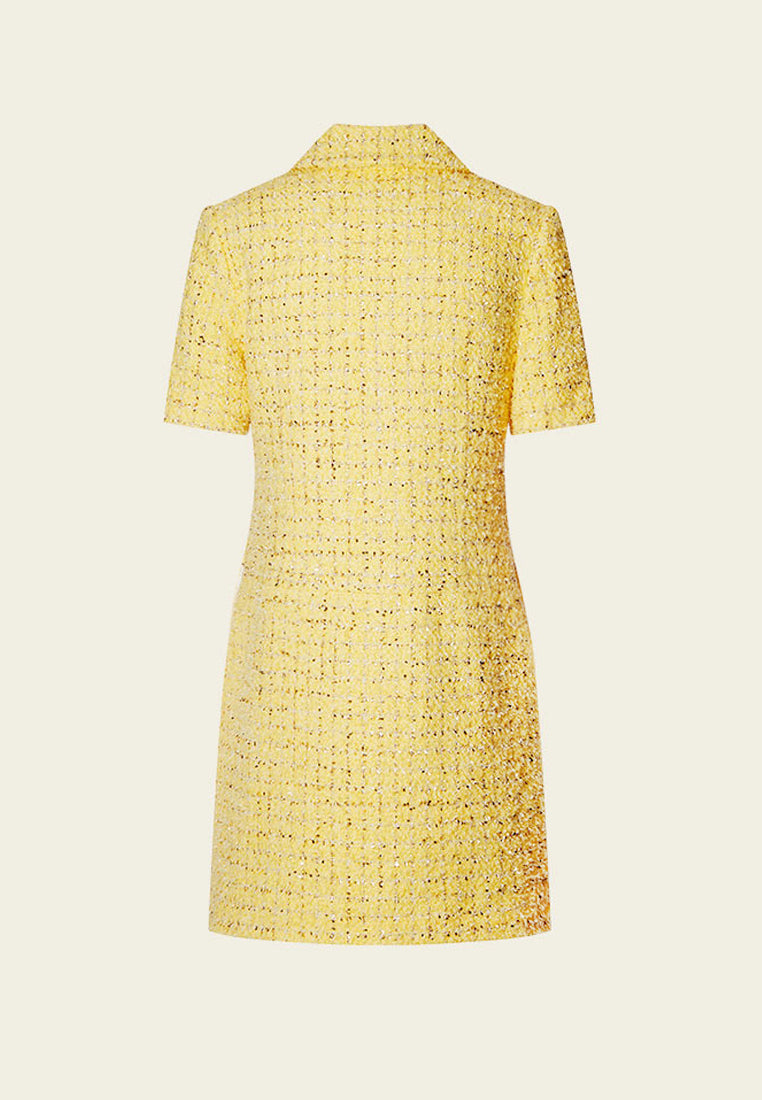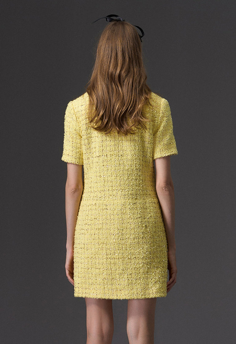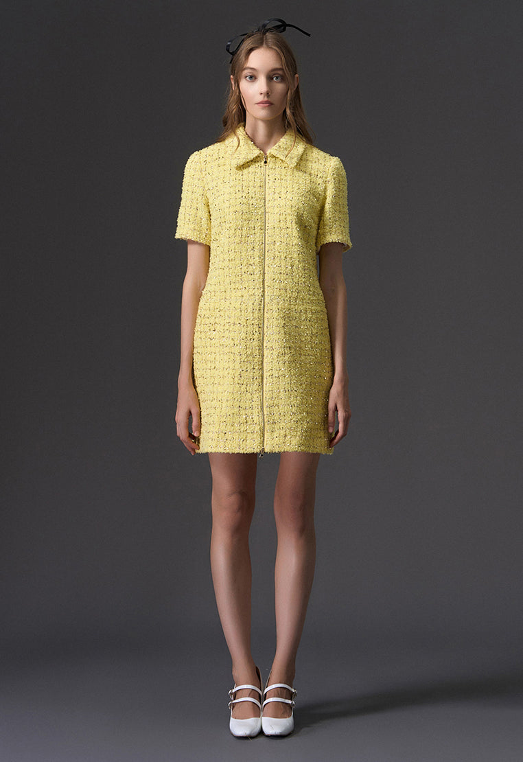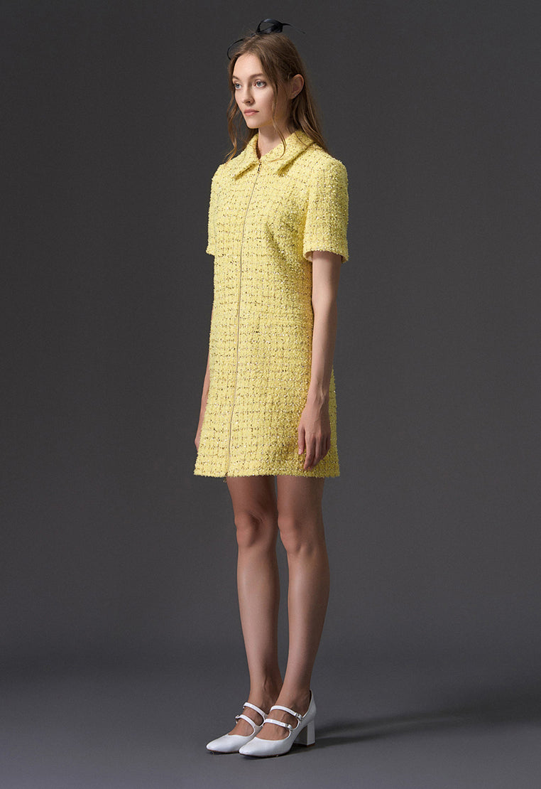 Yellow Short Sleeve Zip Up Front Tweed Dress