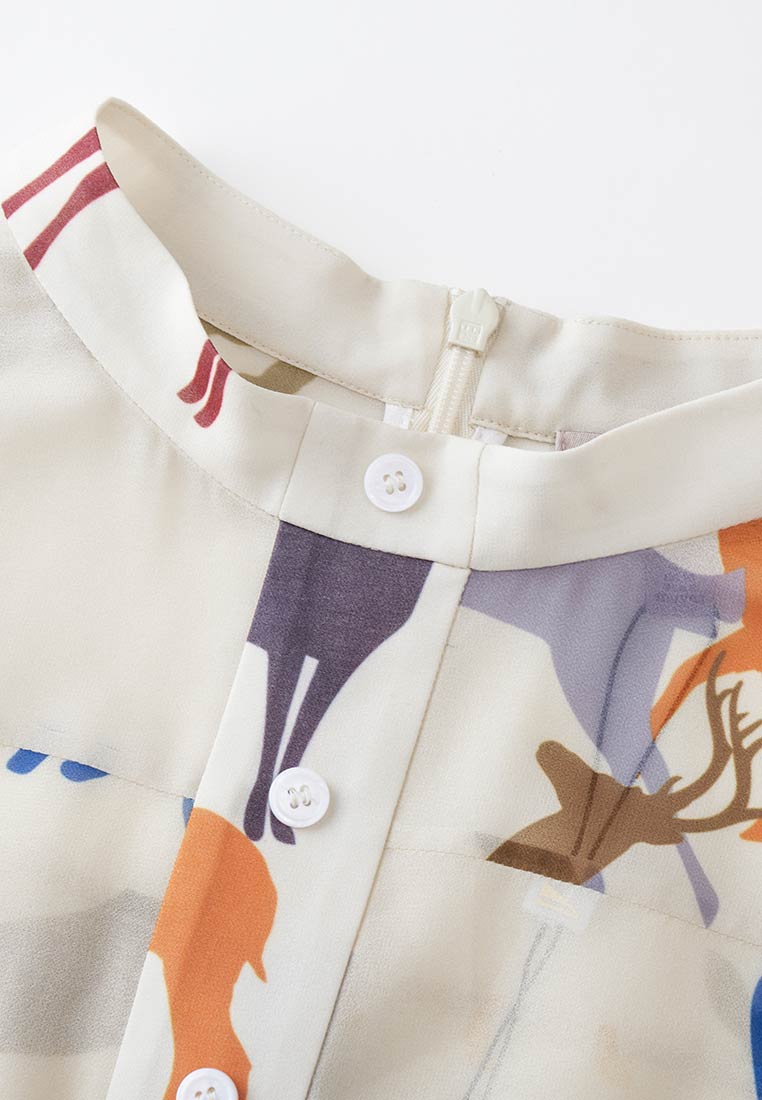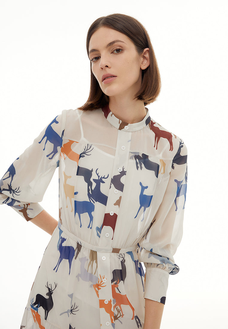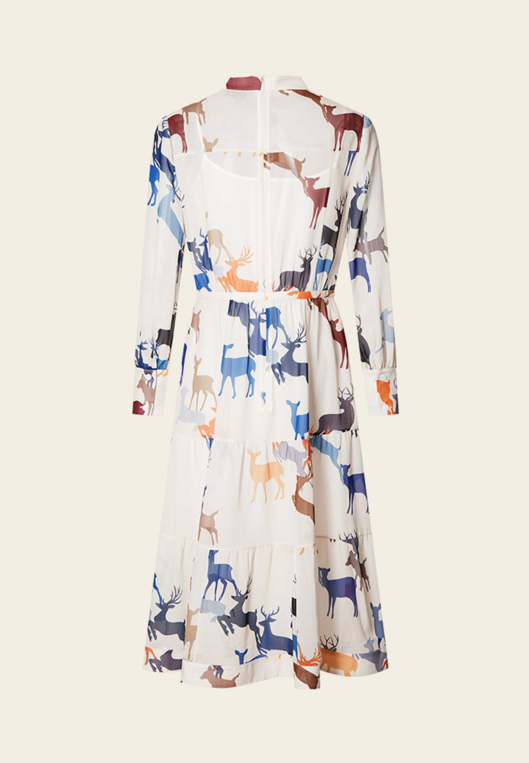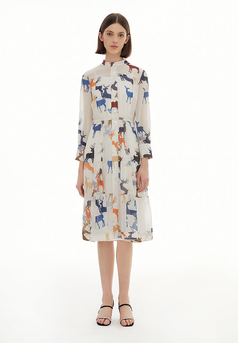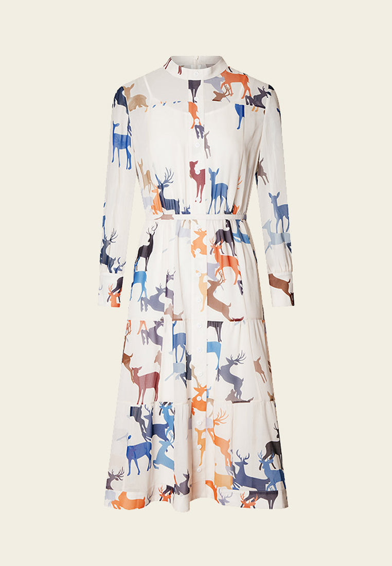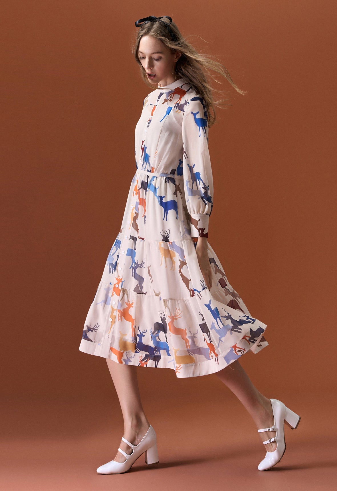 Who doesn't love a vibrant animal print to brighten up the day? Inspired by the Renaissance period in Rome, this new item of MOISELLE PF22 collection with random deer throughout infuses a playful and boyish feeling into the refined Dress. Pussy-bow collar. Complete your styling with low-key leather jacket.
