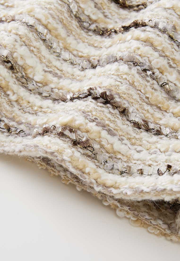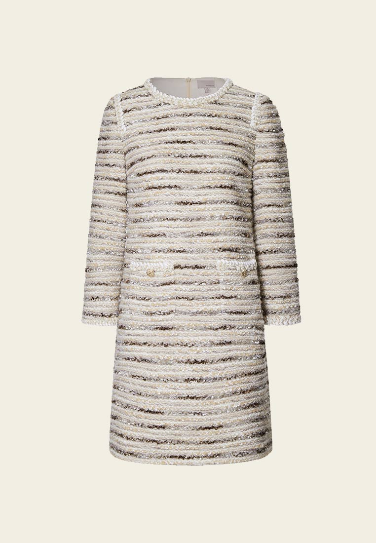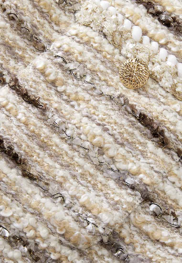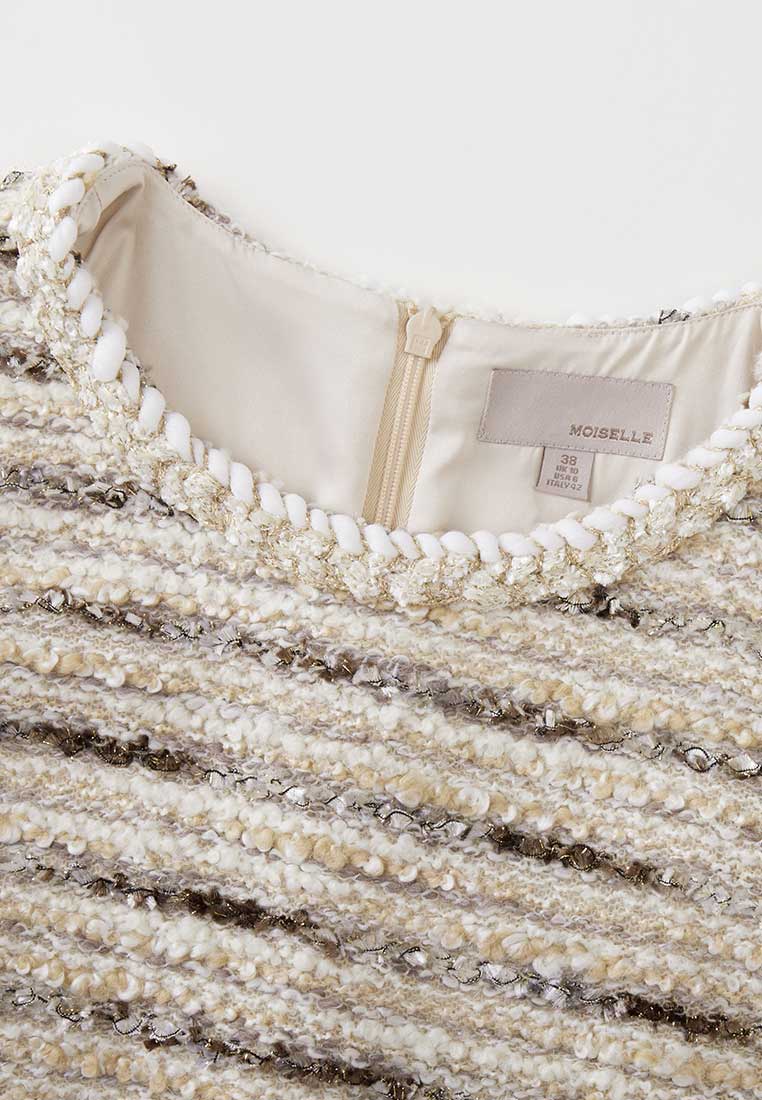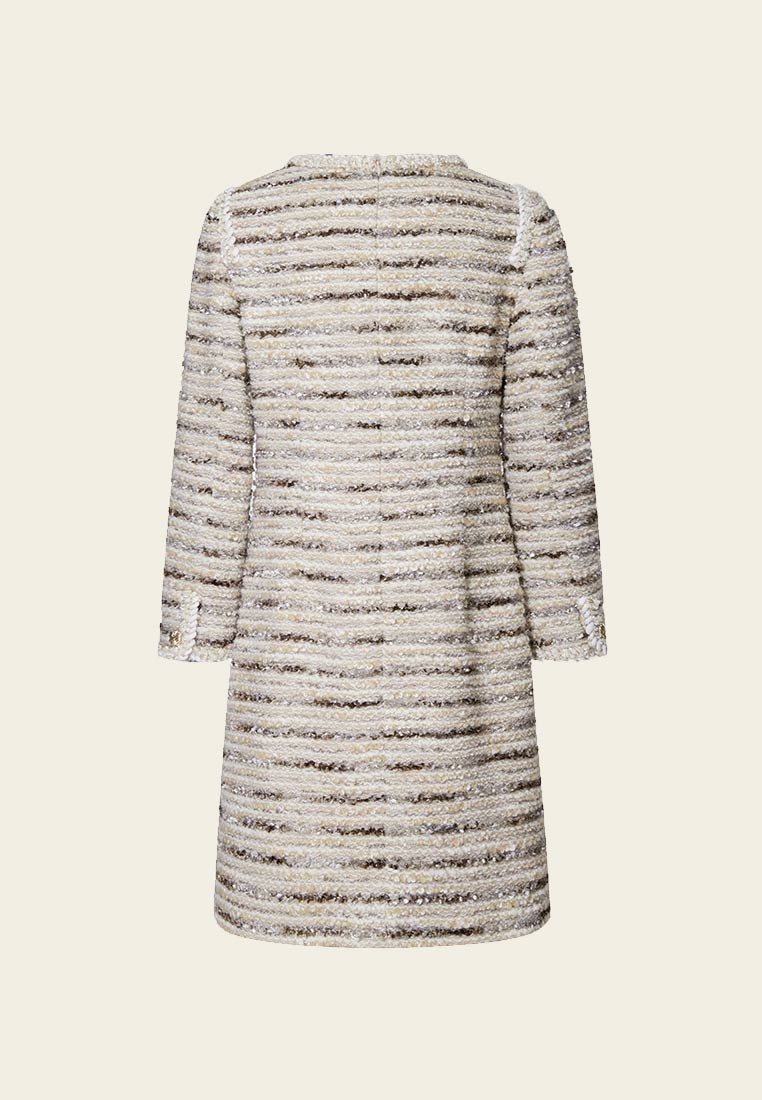 Echoing sailor striped shirt in summer, this dress provides an option of winter striped item. Volumed fabric symbolising winter, keeps you warm and secured. Bronze threads woven alternately with white tweed at neckline, hems & pocket edges to elongate the structure.