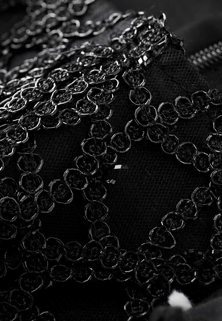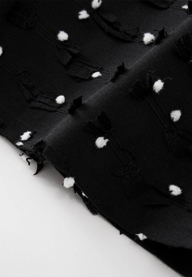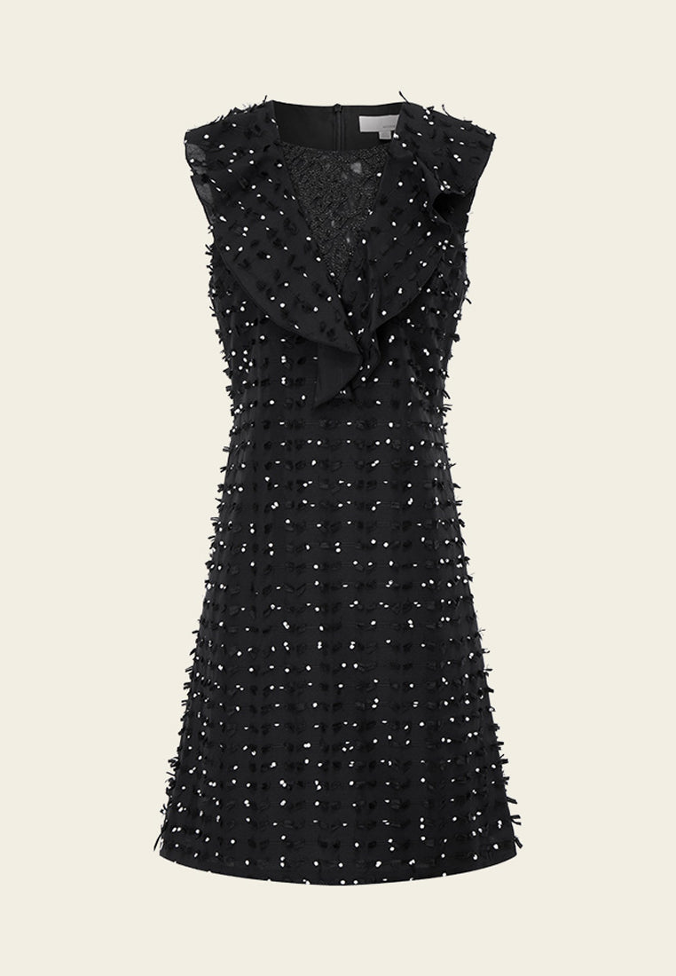 Sleeveless black dress. Jacquard yarn with small white puffs throughout the item, enhances its volume. Tailor-made to accentuate a slim figure by standing out the shoulder and arm silhouette. Ruffled lapel finish up with embroidery lace round neck. A casual wear that evokes a sense of luxurious. Perfect ready-to-go item for daytime commercial events and lunch meetings.