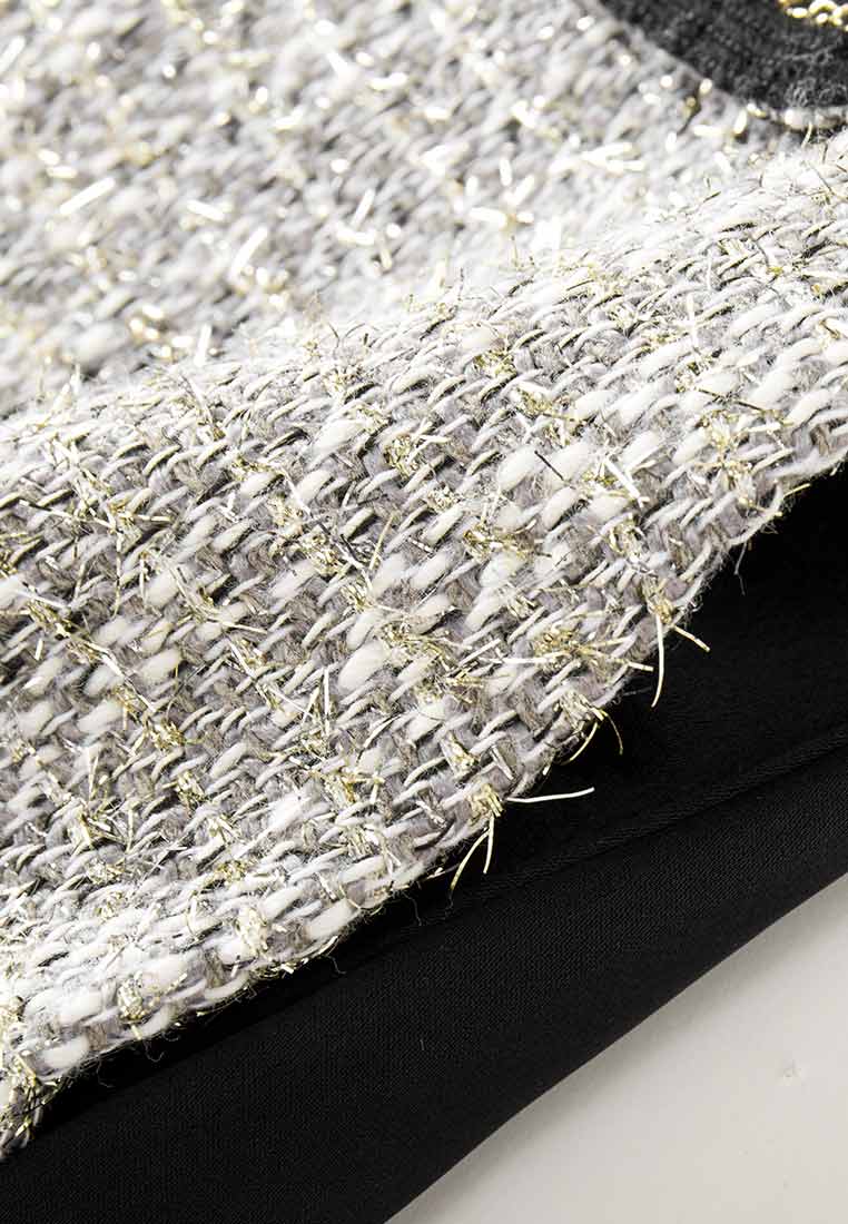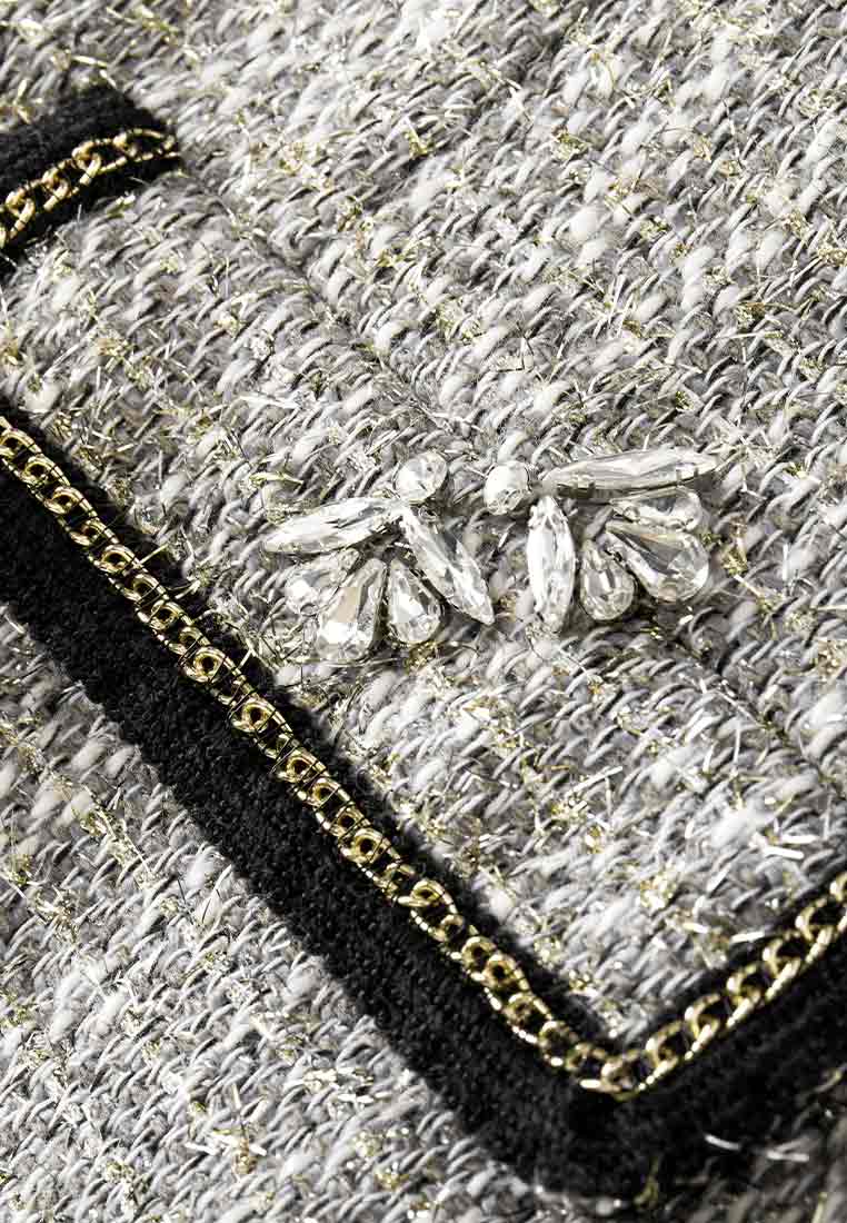 Belongs to MOISELLE PF2022 "REFLECTIONS IN NETHERLAND" collection, this item iterate the airy image of Netherland. Intricately mixed light grey, white and golden details front, whole-black back. The piece boasts decorative pocket flaps: Black and gold colorway, rhinestone-embellished. A perfect item to enhance your ethereal winter styling.