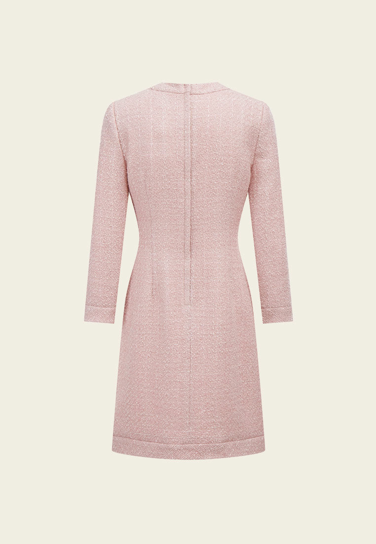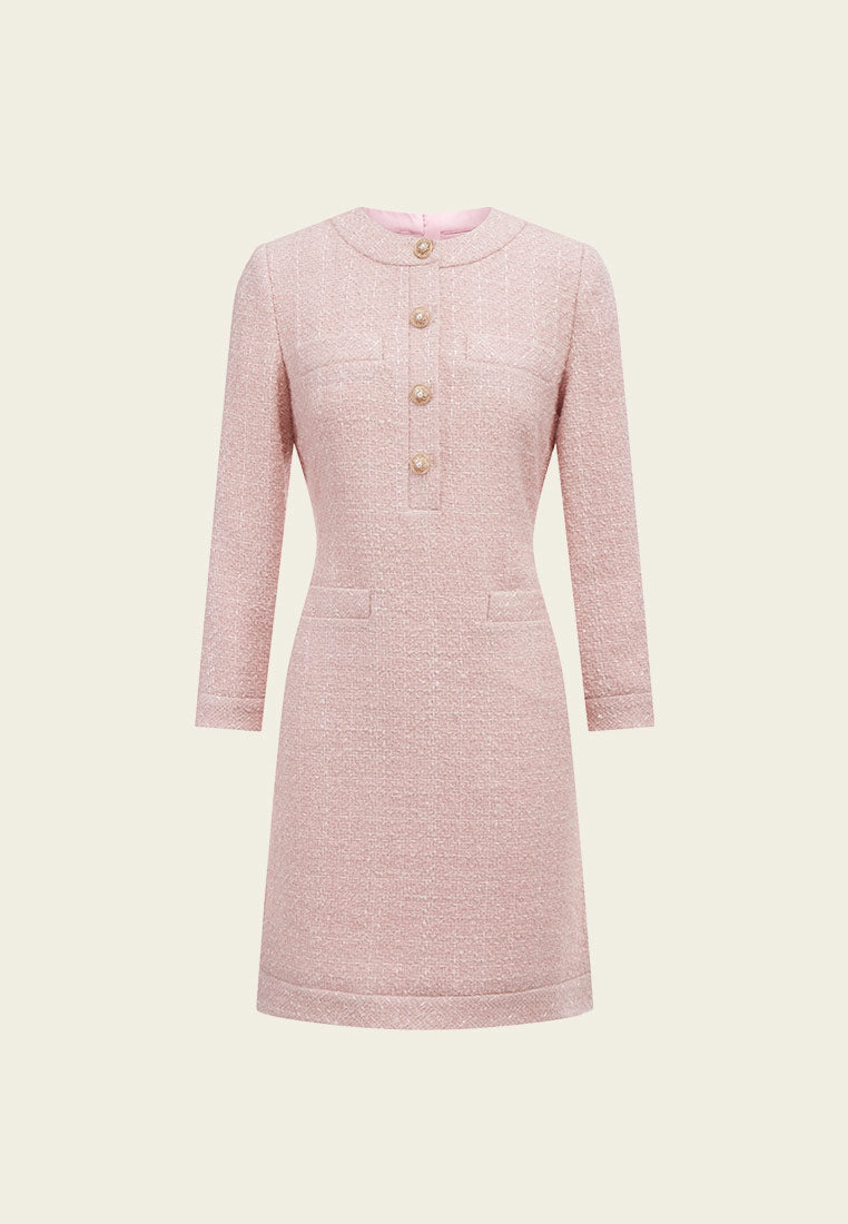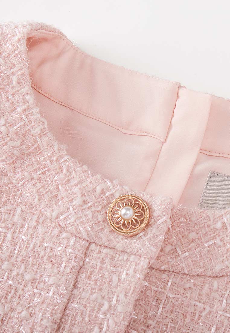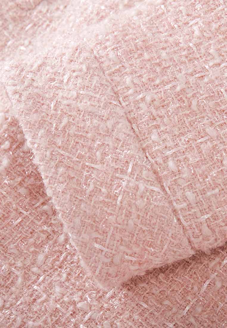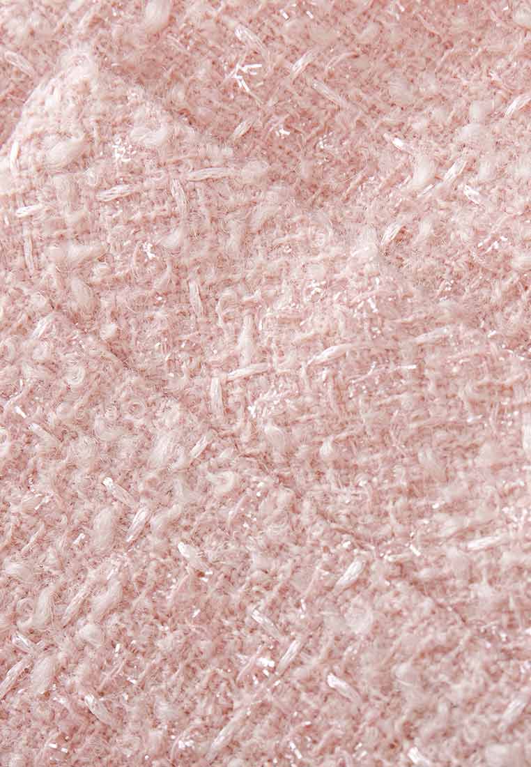 A renewed version of hot selling item till 2012. Men shirt collar silhouette, infusing androgynous feeling into an elegant item. Light pink colorway. Signature MOISELLE four pocket design. Fusion of wool, knit and lurex with recycled silver thread. A smooth, silk-like texture rarely seen.