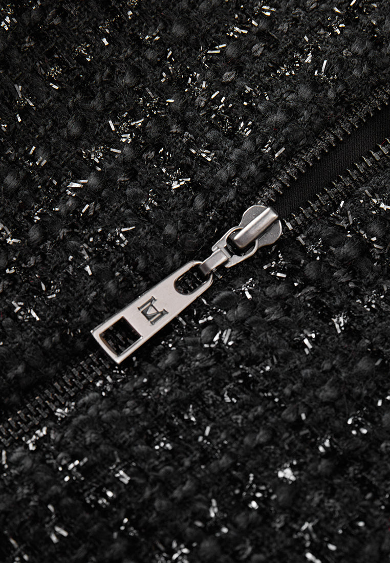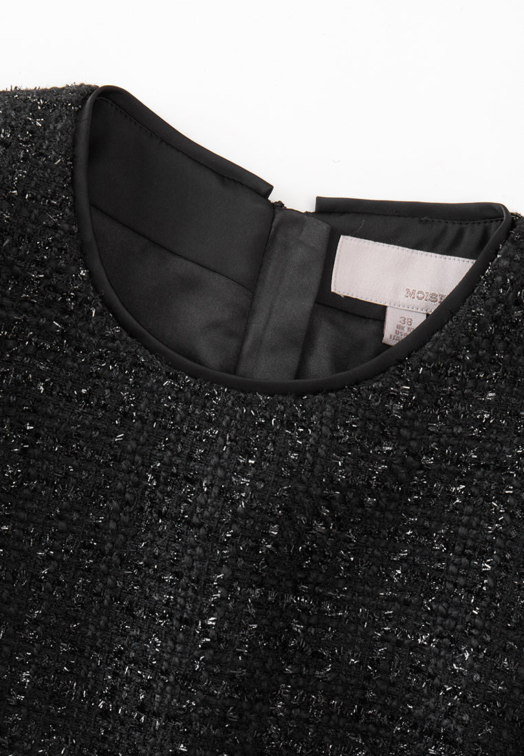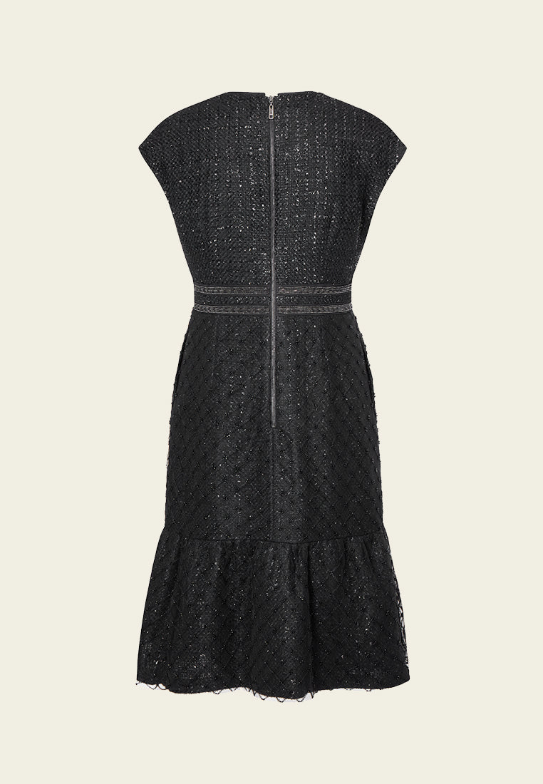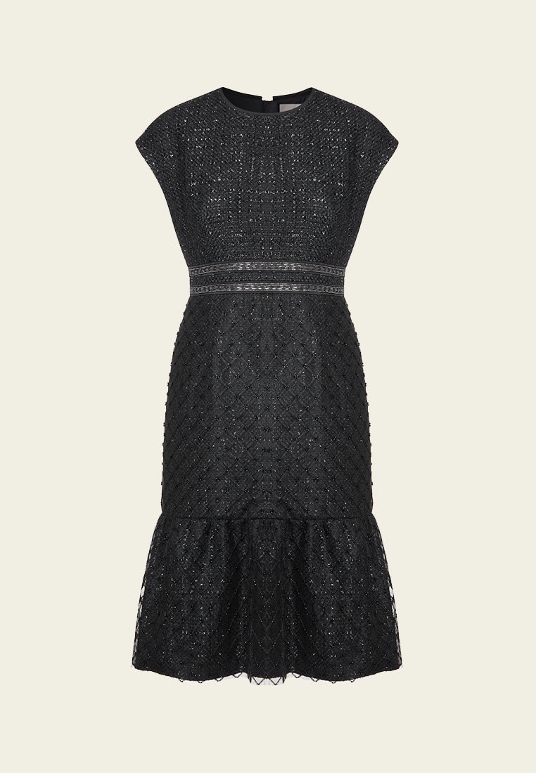 A monotone piece understatedly opulent in details. Cap sleeve lurex tweed top shimmers by reflection. Encrusted with jacquard mesh below the waistline, the bottom part is delicately embellished with diamond shape jacquard and beads. Waistline accentuating the silhouette. The piece finishes up with a fishtail cutting at the bottom