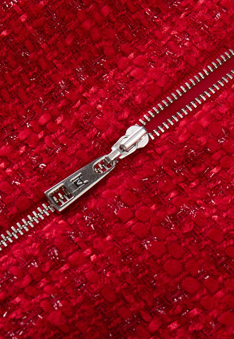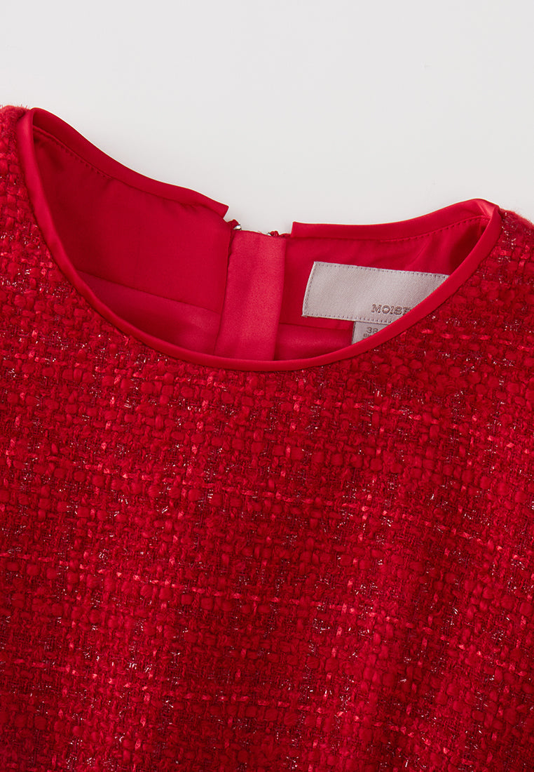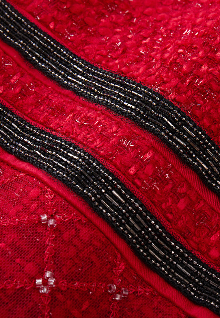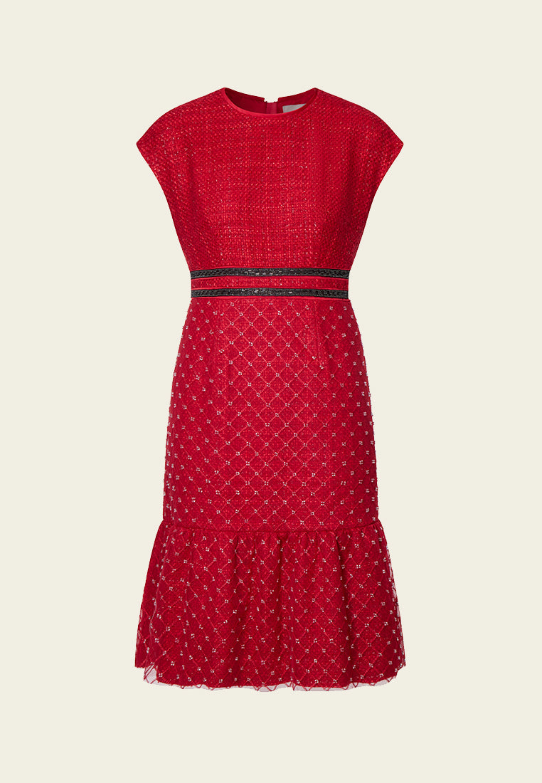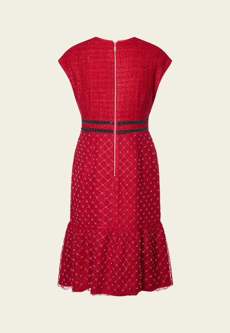 Red Cap-sleeved Embroidered Mesh Tweed Dress