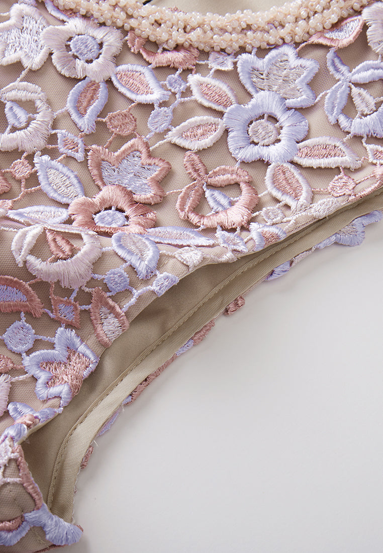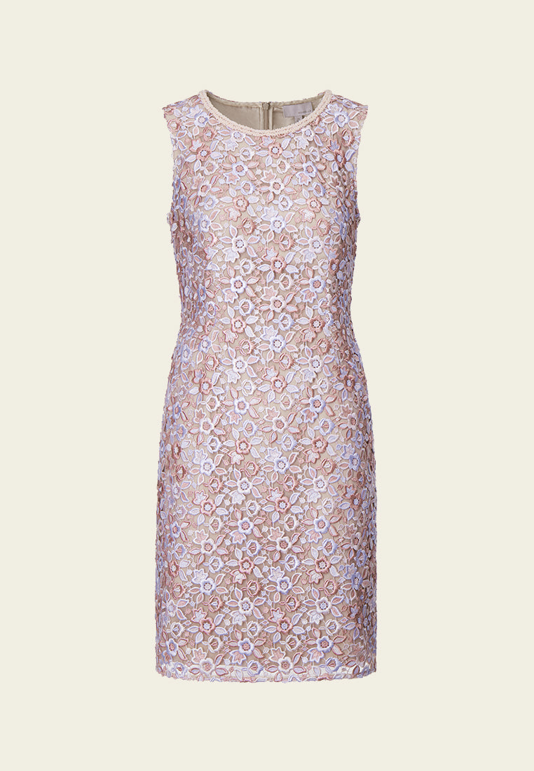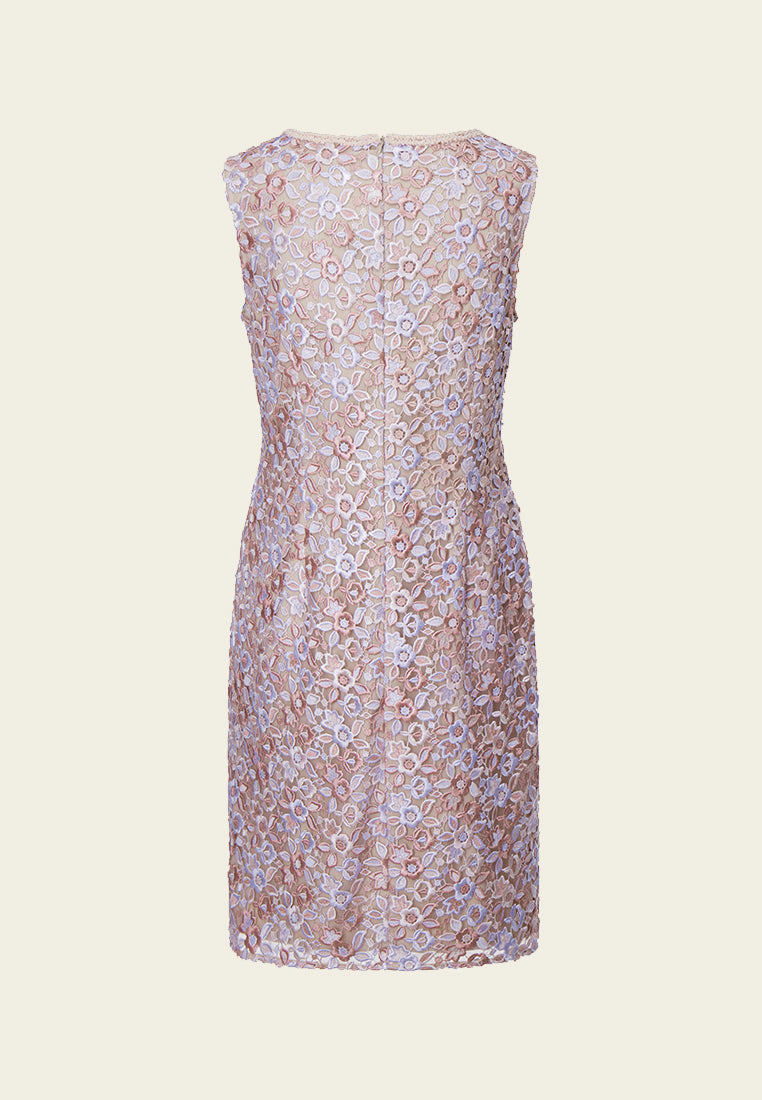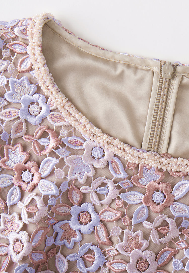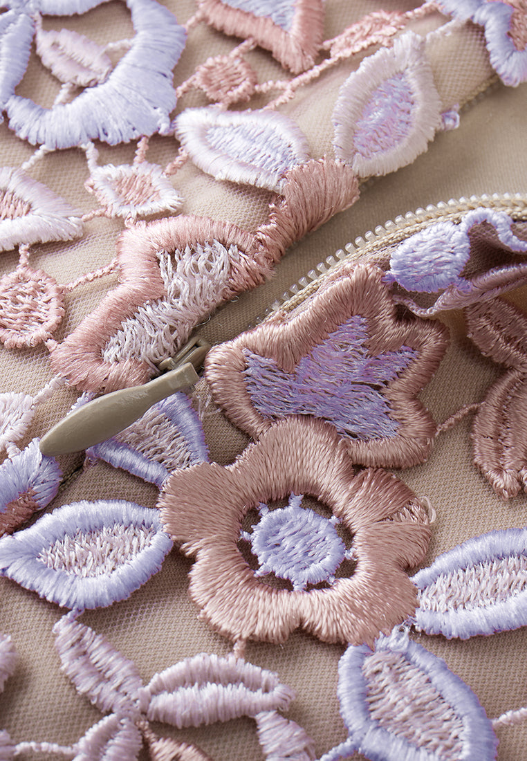Lining gracefully encrusted with tailor-made embroidery. A hollow carved floral pattern overlays the fabric. Pastel tone colorway evokes fantasy gracefulness. Finish up with beaded hems, this dress is the best for your decent commercial meeting and gathering office outfit.