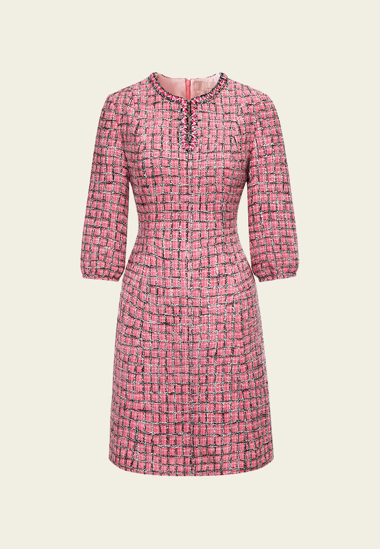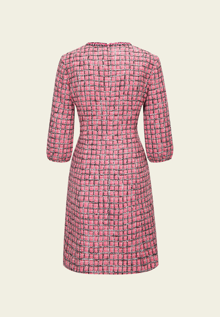 Pink Puff Sleeve Tweed Midi Dress