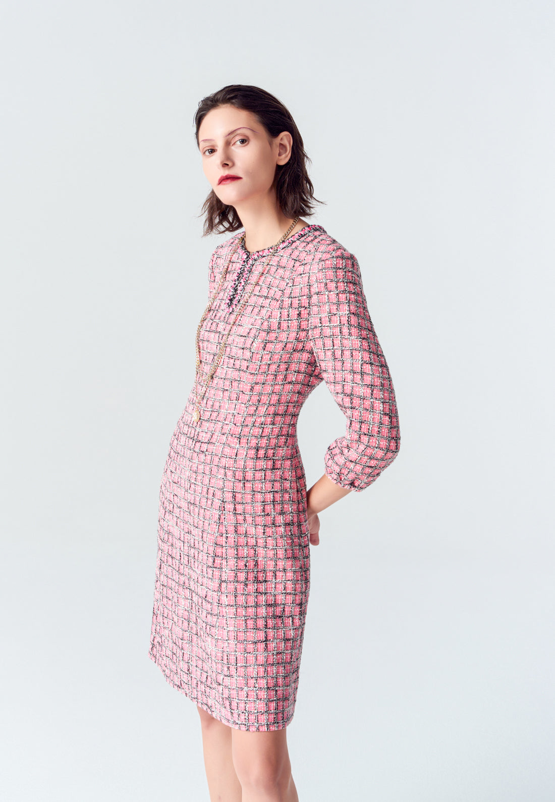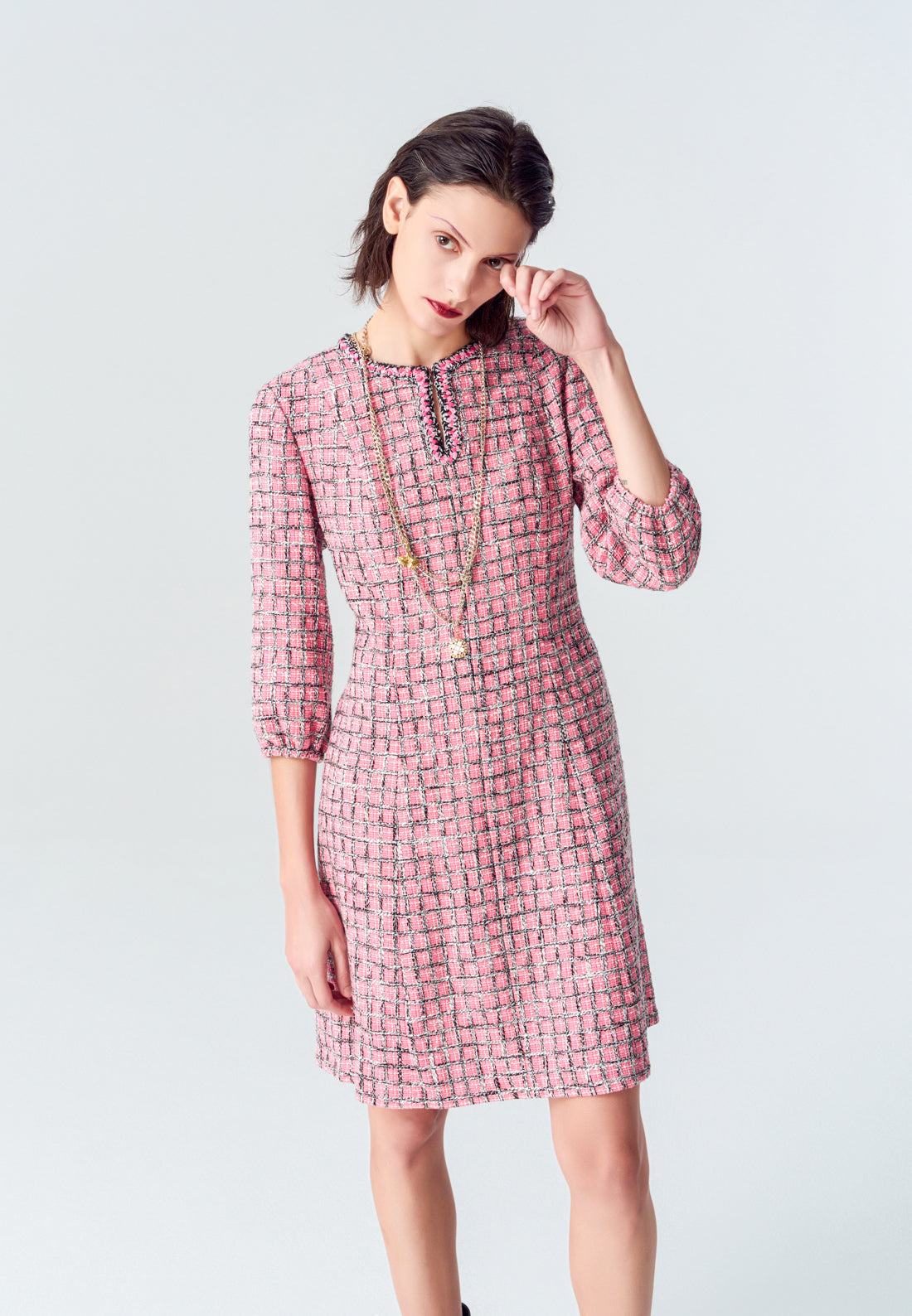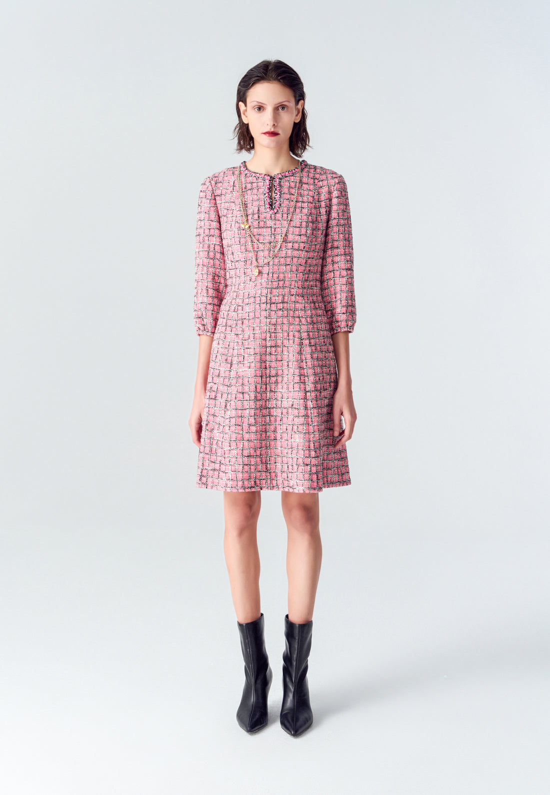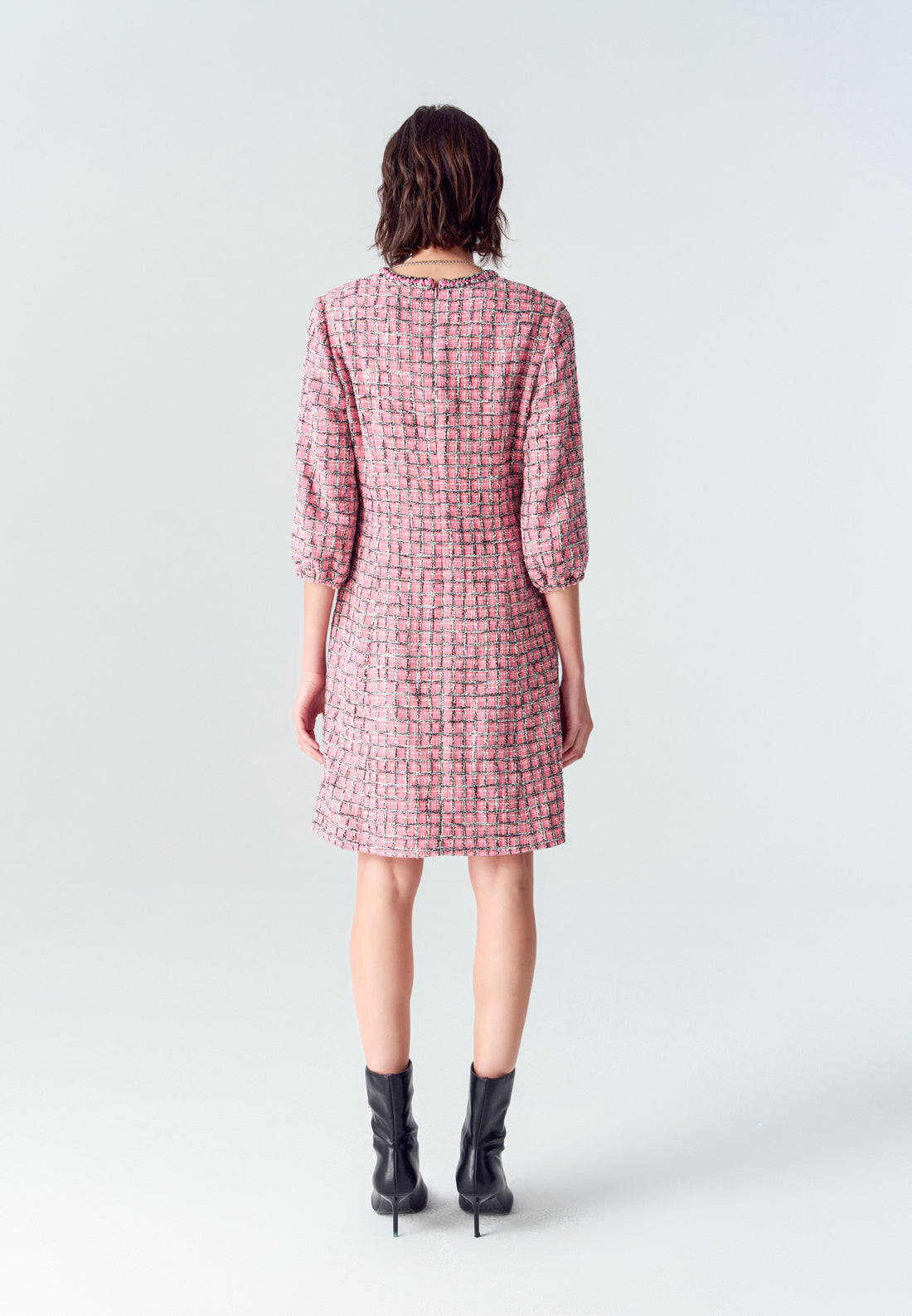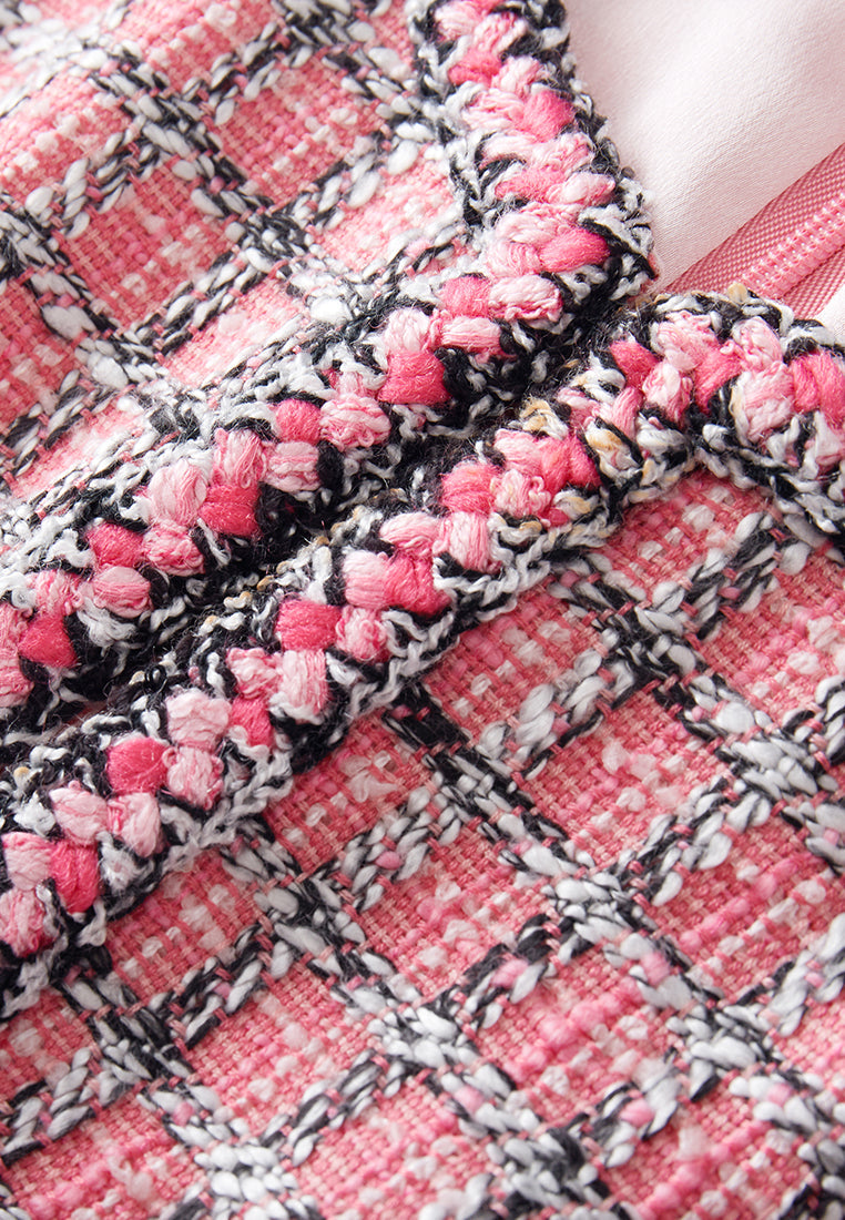 A vibrant twist of classic tweed item. Contrasting black and pink colorway delightfully interwoven as plaid. Puff sleeves and v-neck feature evokes a hint of bohemian style feeling. Wear it as smart casual office wear or enjoy your holiday with it.