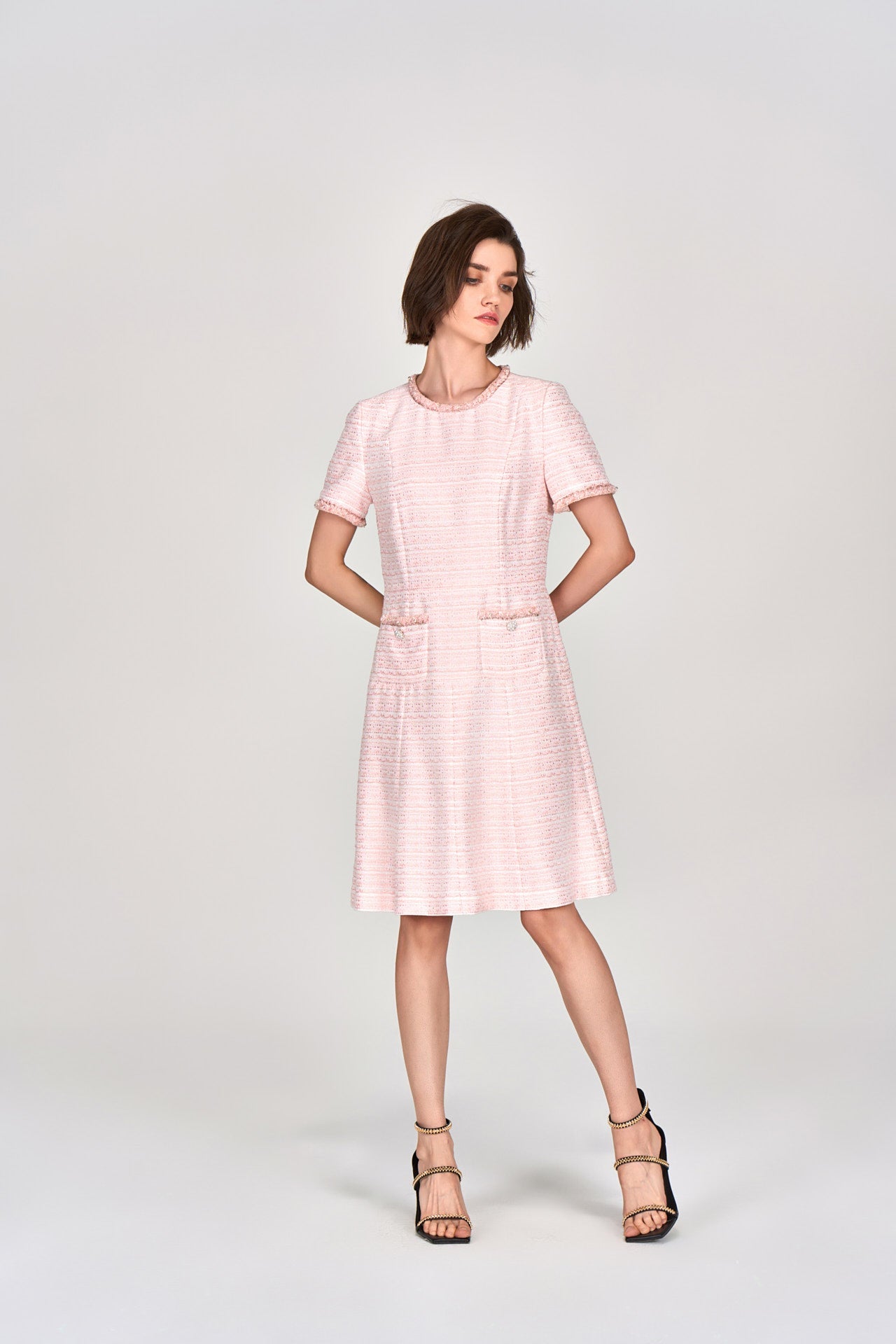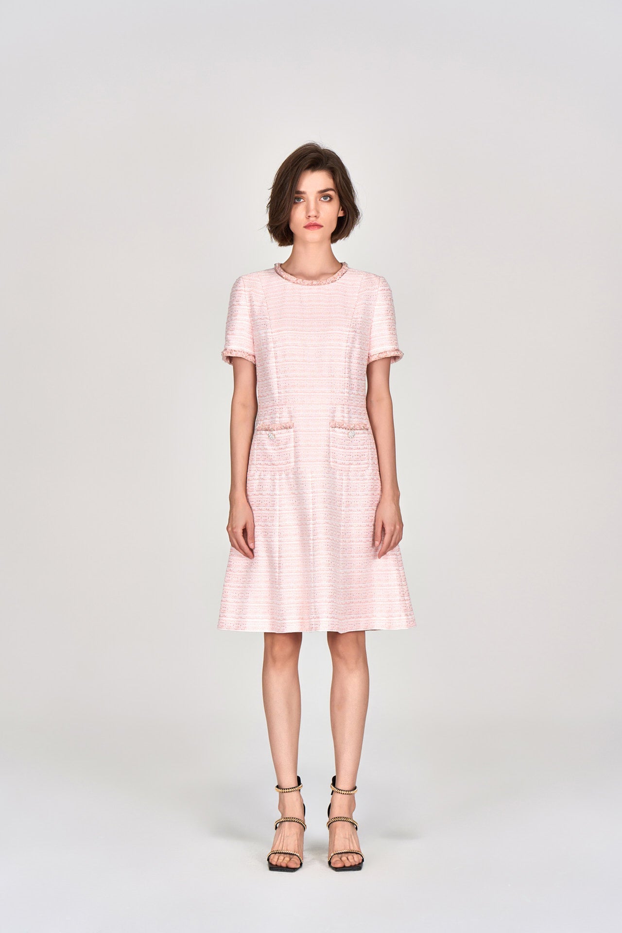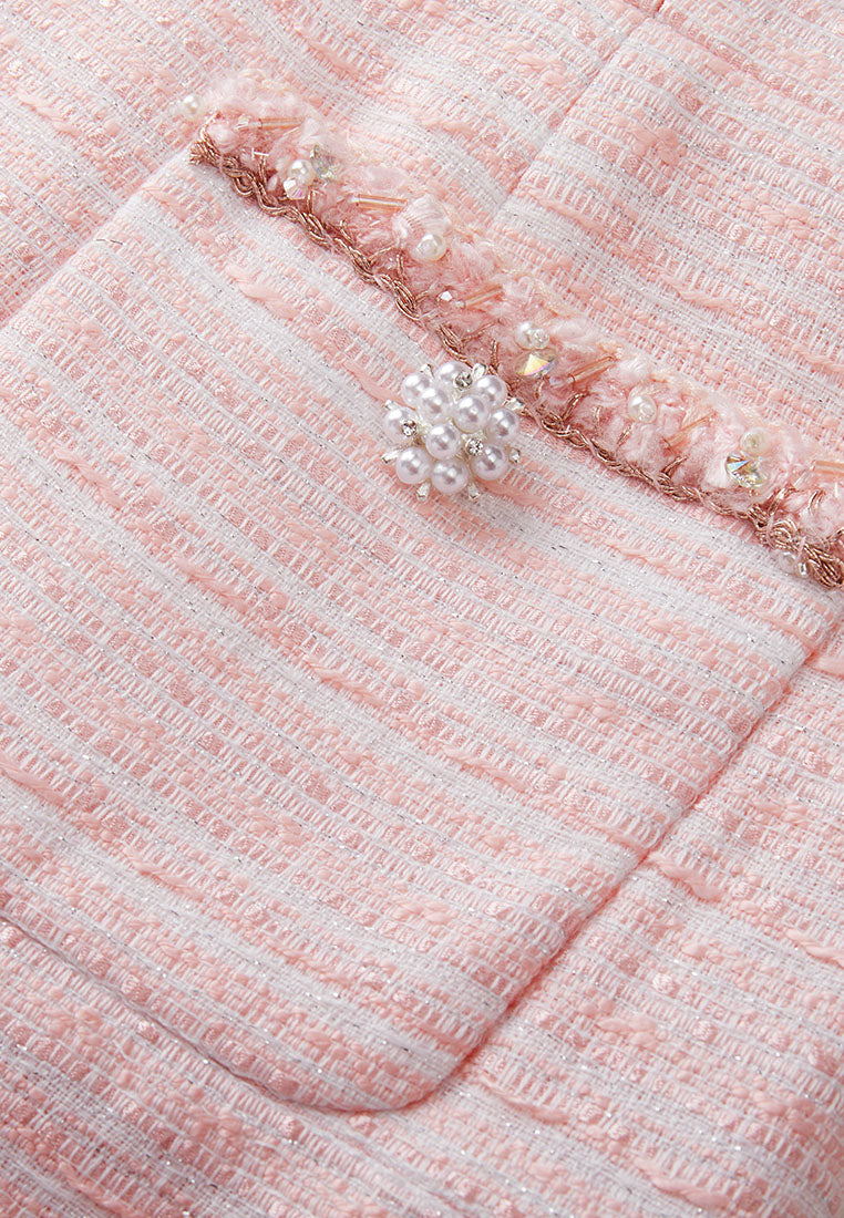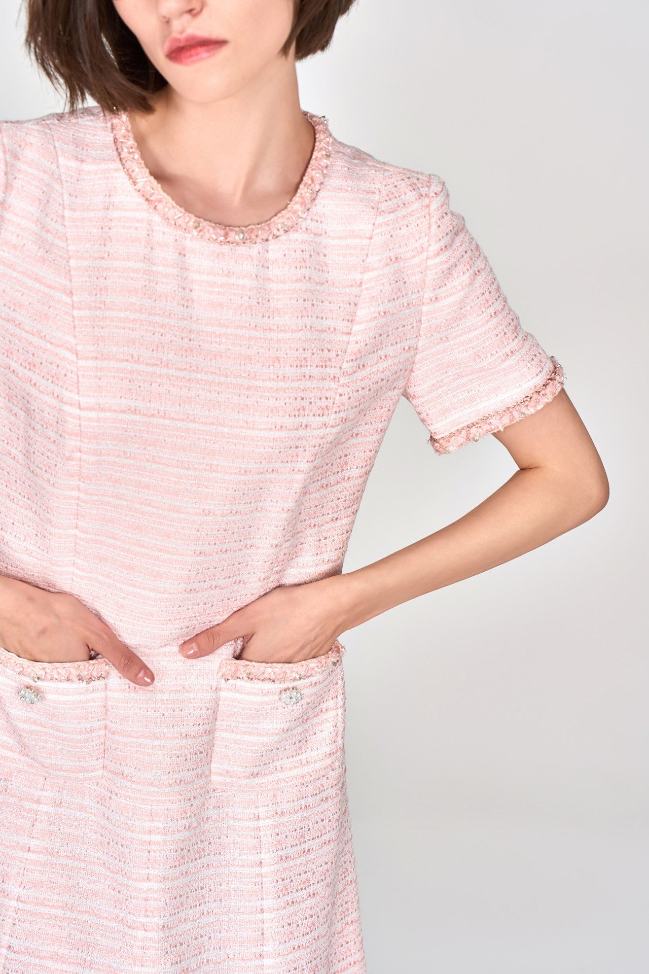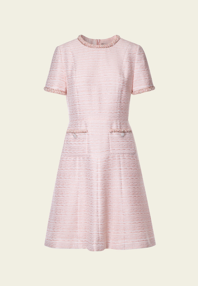 Classic modern tweed dress in a cute and loveable light pink colorway. Short sleeves tweed dress evokes a nostalgic modern feeling. Flared cutting delightfully accentuates waistline. Collar, cuffs and pocket edges embellished with fluffy tweed, pearls and beads.