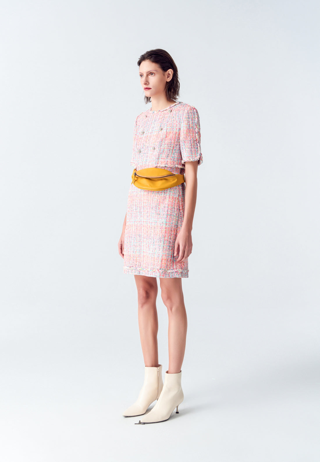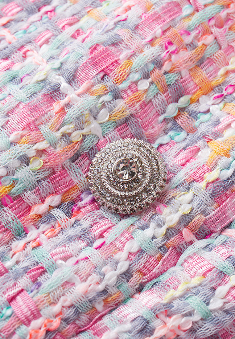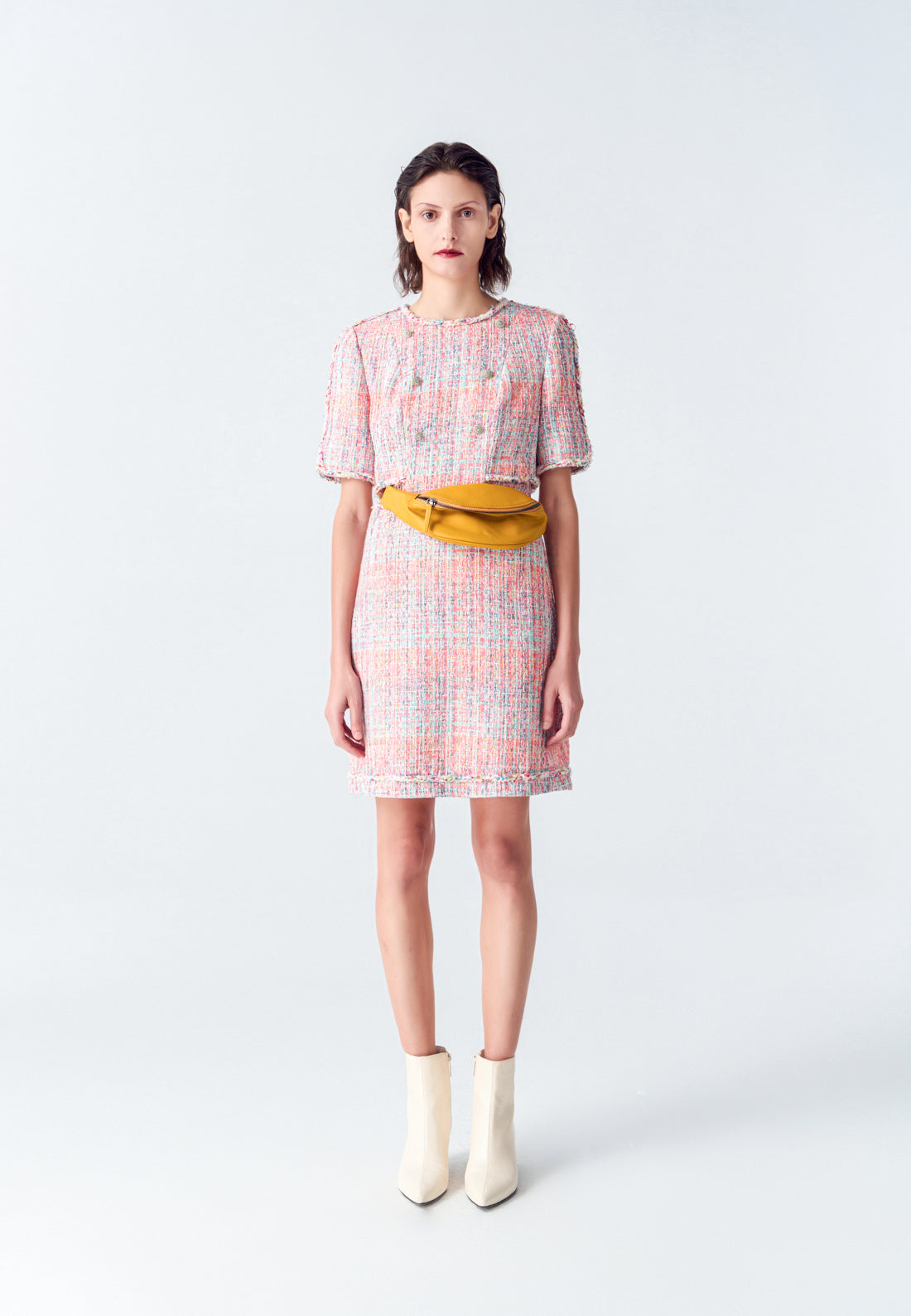 A spring item that will surely brighten up your day. Pastel tone tweed is intricately interwoven with a variety of forms and colors of threads. Hems and waist highlighted with same color braided tweed. Finish up with double-breasted crystal buttons. This dress is sure to make a statement with its unique look, giving any wardrobe an unexpected, fashion-forward touch. It'll add a sophisticated, stylish flair to any occasion.