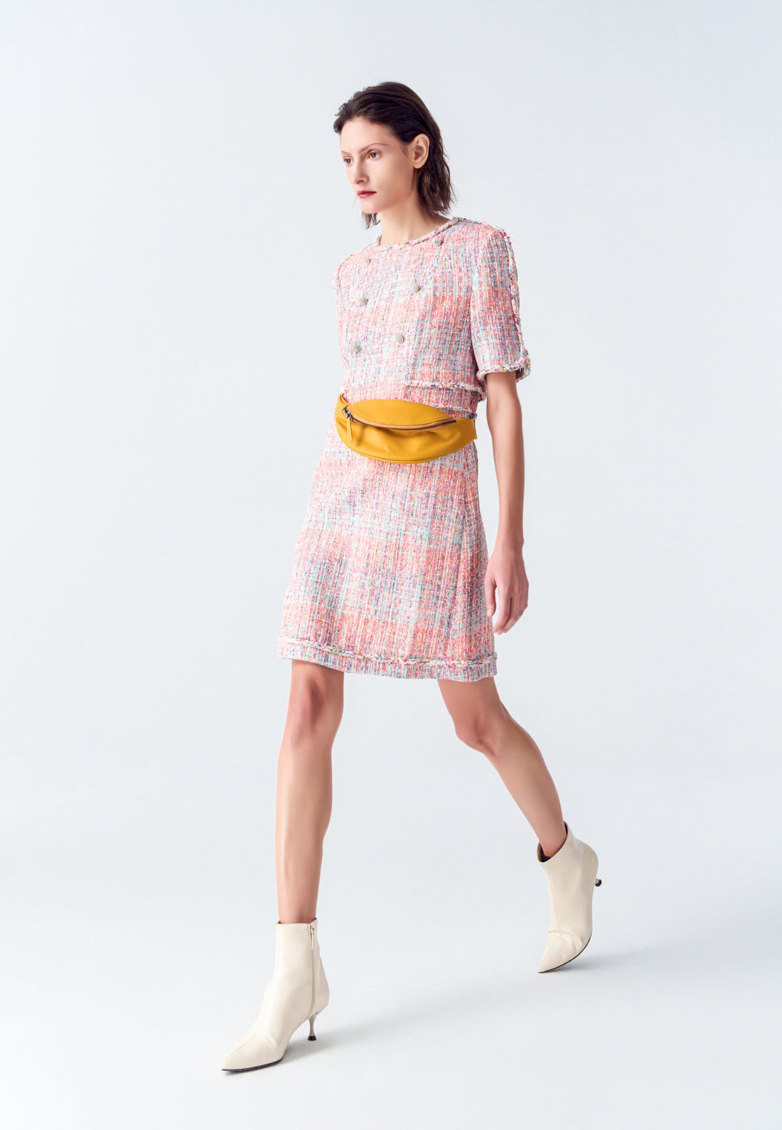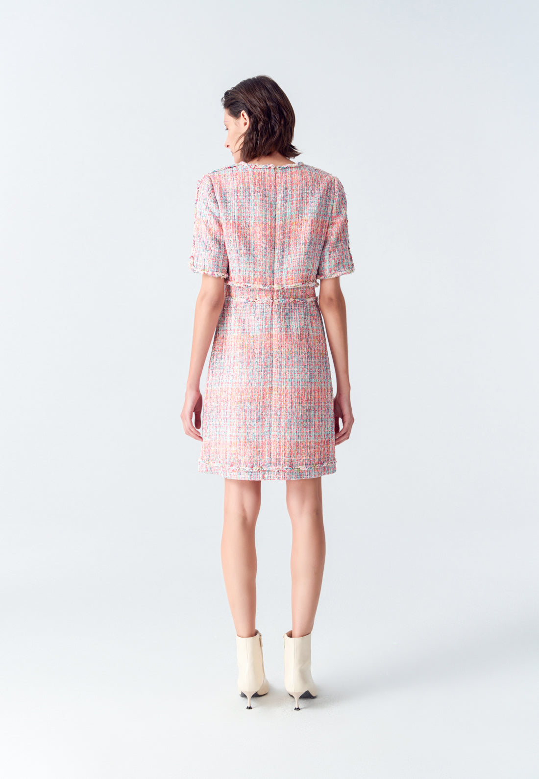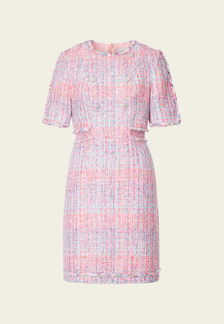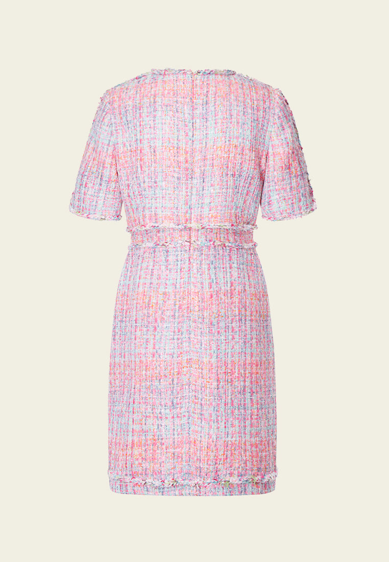 A spring item that will surely brighten up your day. Pastel tone tweed is intricately interwoven with a variety of forms and colors of threads. Hems and waist highlighted with same color braided tweed. Finish up with double-breasted crystal buttons. This dress is sure to make a statement with its unique look, giving any wardrobe an unexpected, fashion-forward touch. It'll add a sophisticated, stylish flair to any occasion.