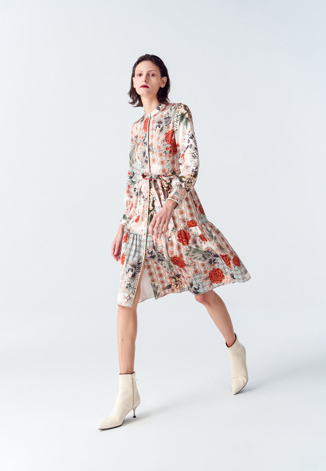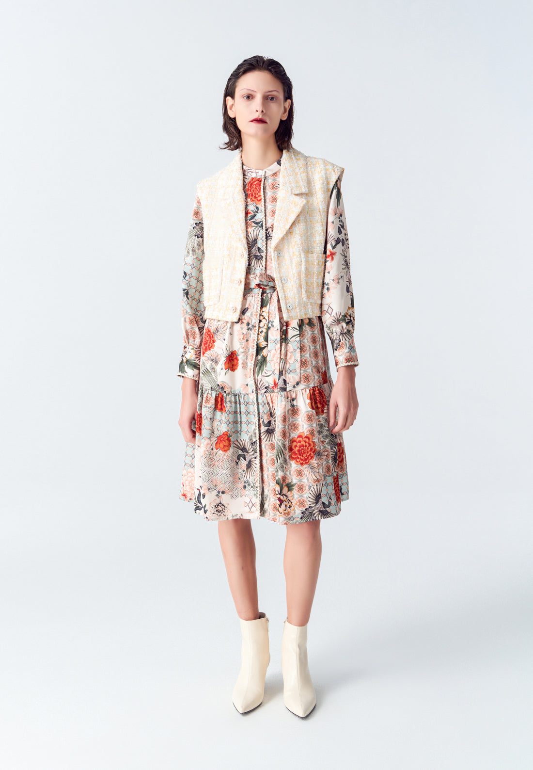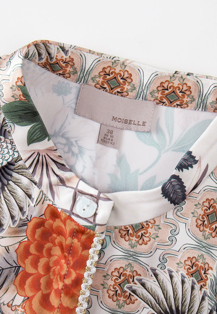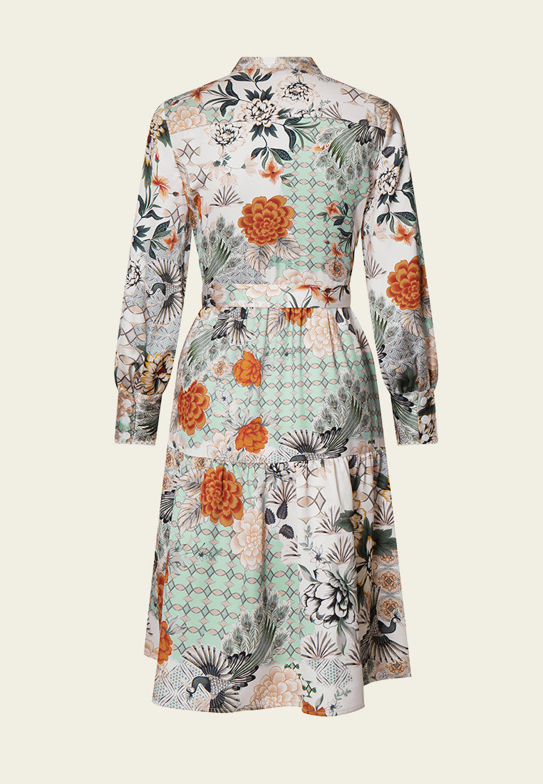 A contemporary item that impresses people with a friendly and vibrant character. Intricately repetitive patterns are reminiscent of Morocco tiles. The patterns collage with flowers and birds, resulting in an item filled with an oriental aesthetic. A ready-to-go commercial lunch/office wear you do not want to miss.