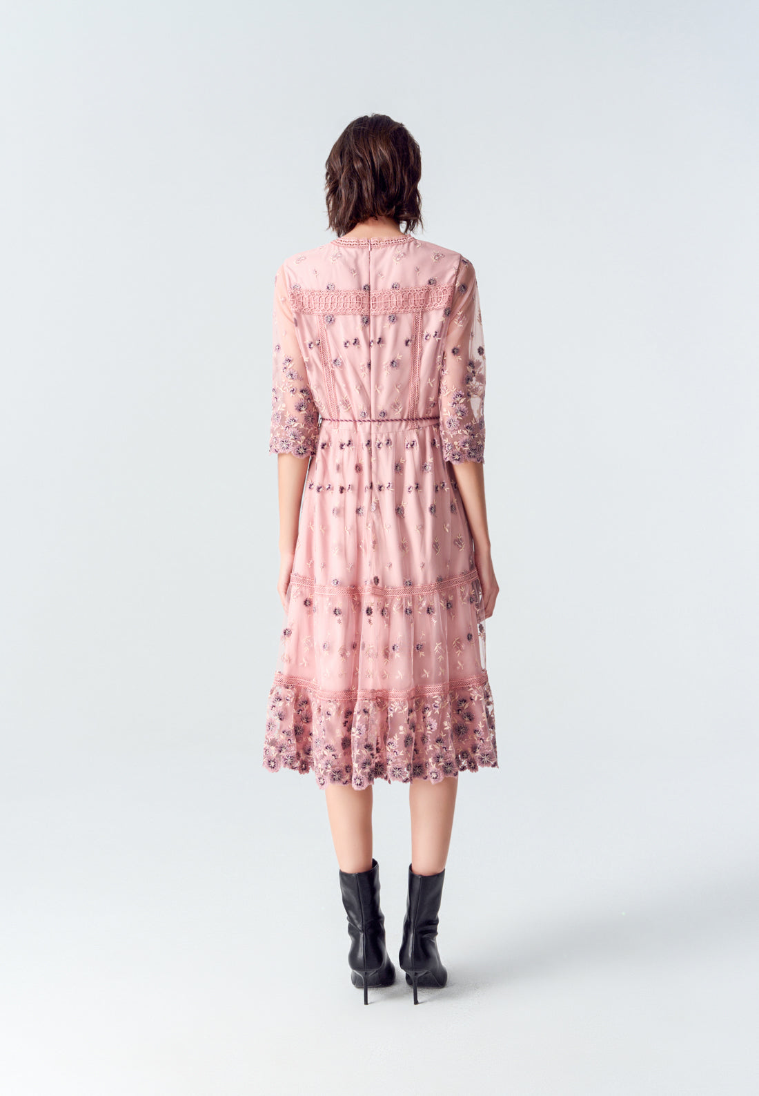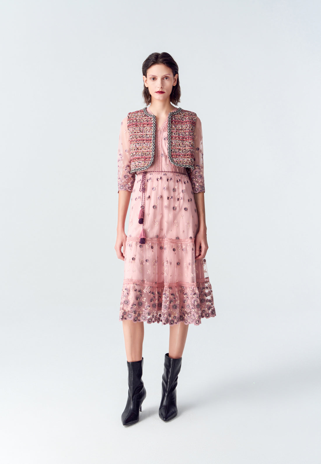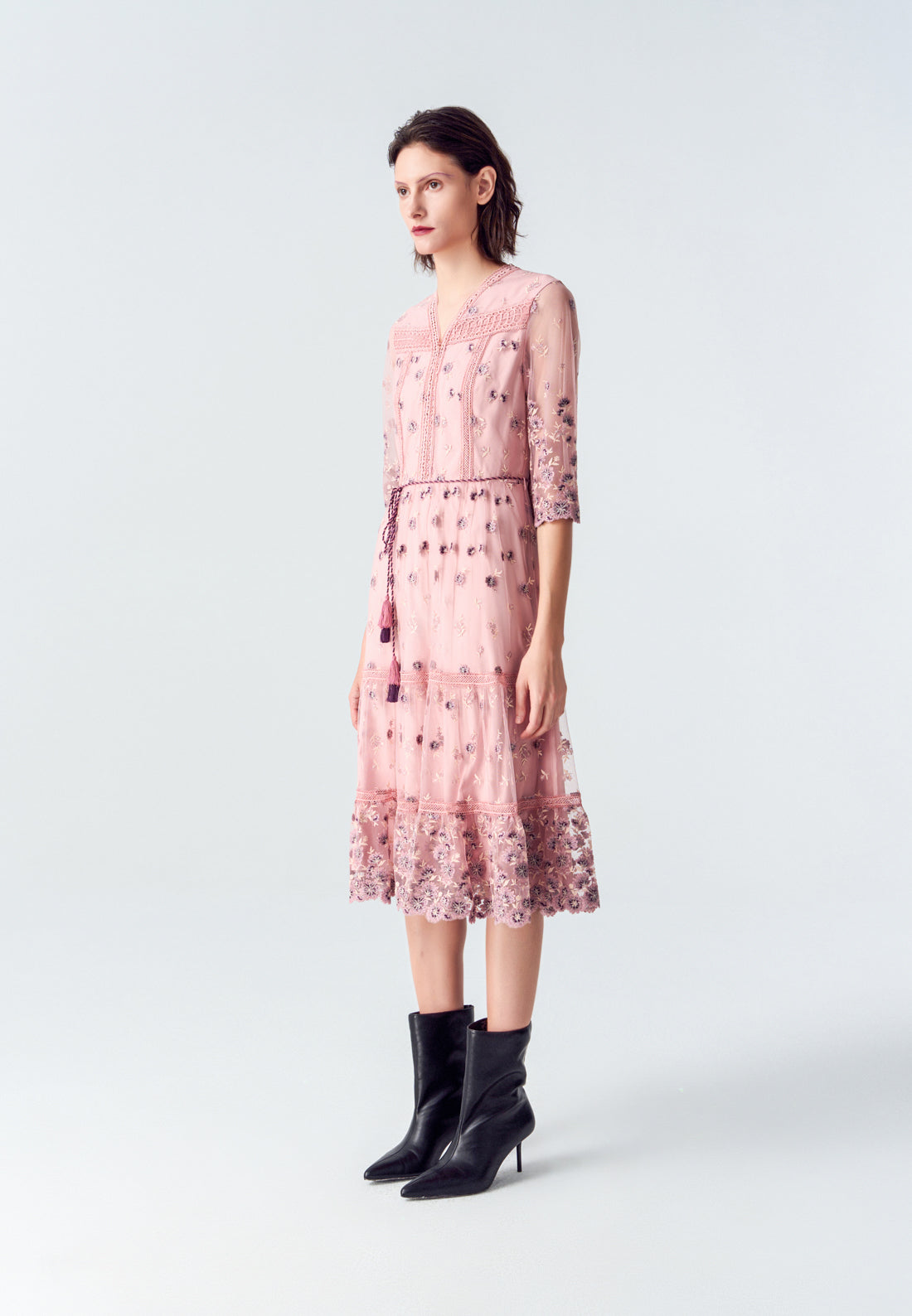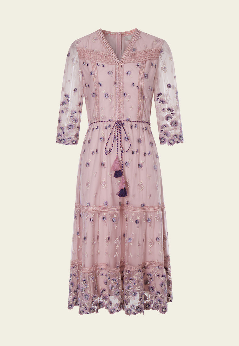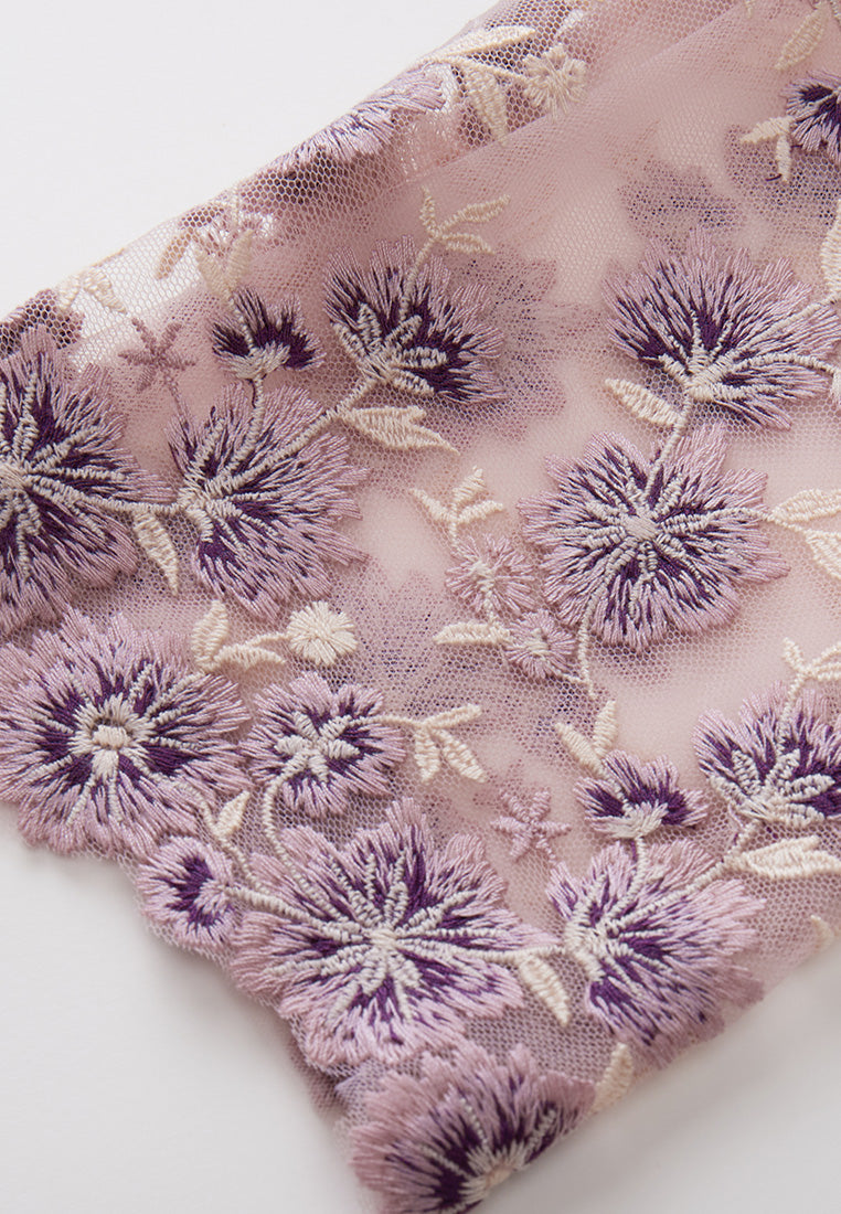 Graceful and elegant are the best description of this item. Embroidery purple flowers fall on the item and accumulate at the cuffs and bottom. Intricate lace delightfully embellishes the hems, highlighting the bust and bottom. Finish up with a fringe belt.