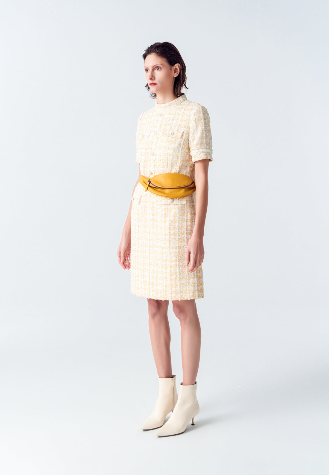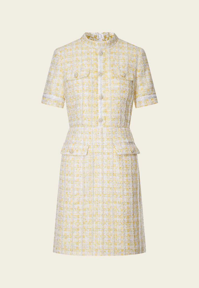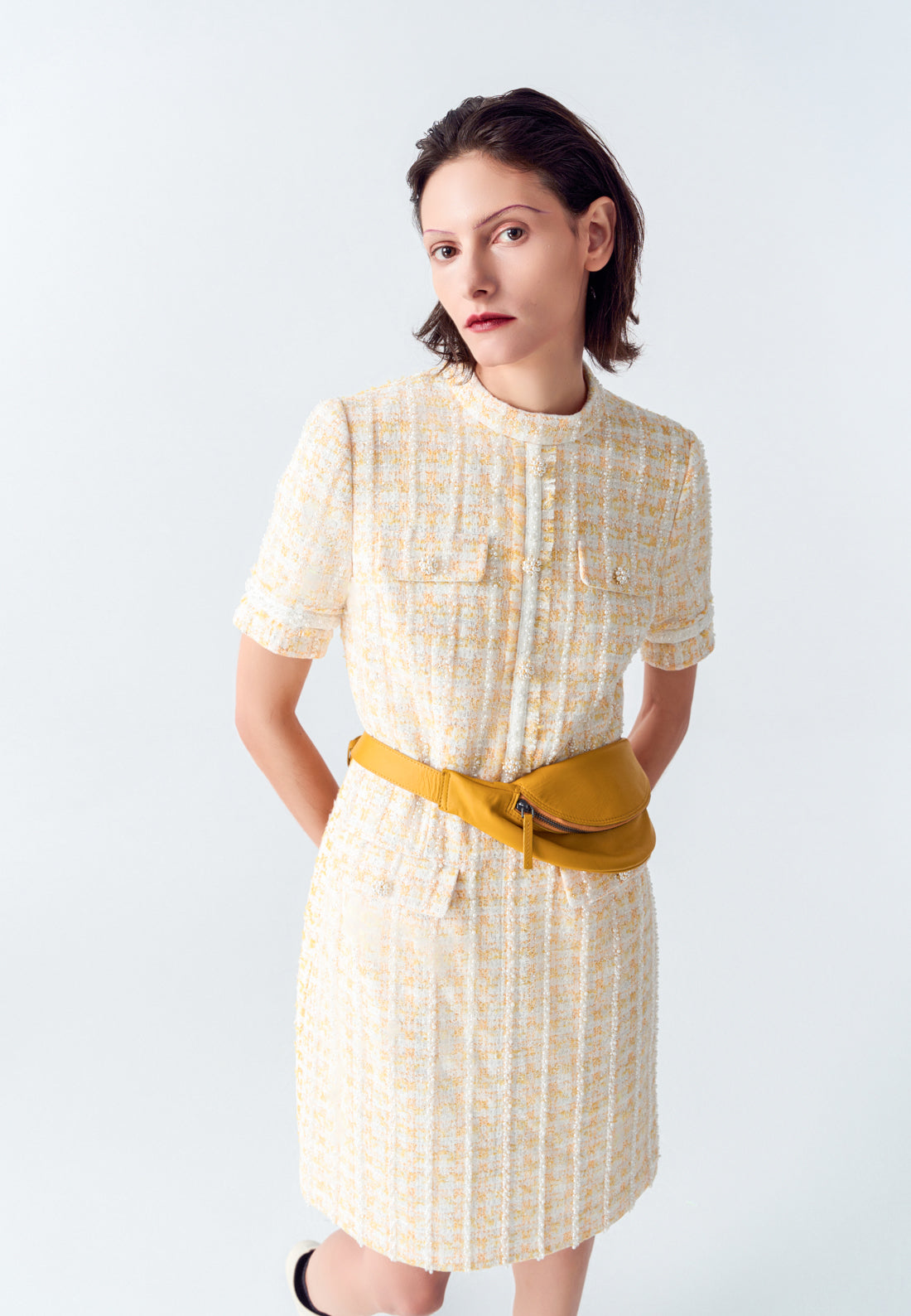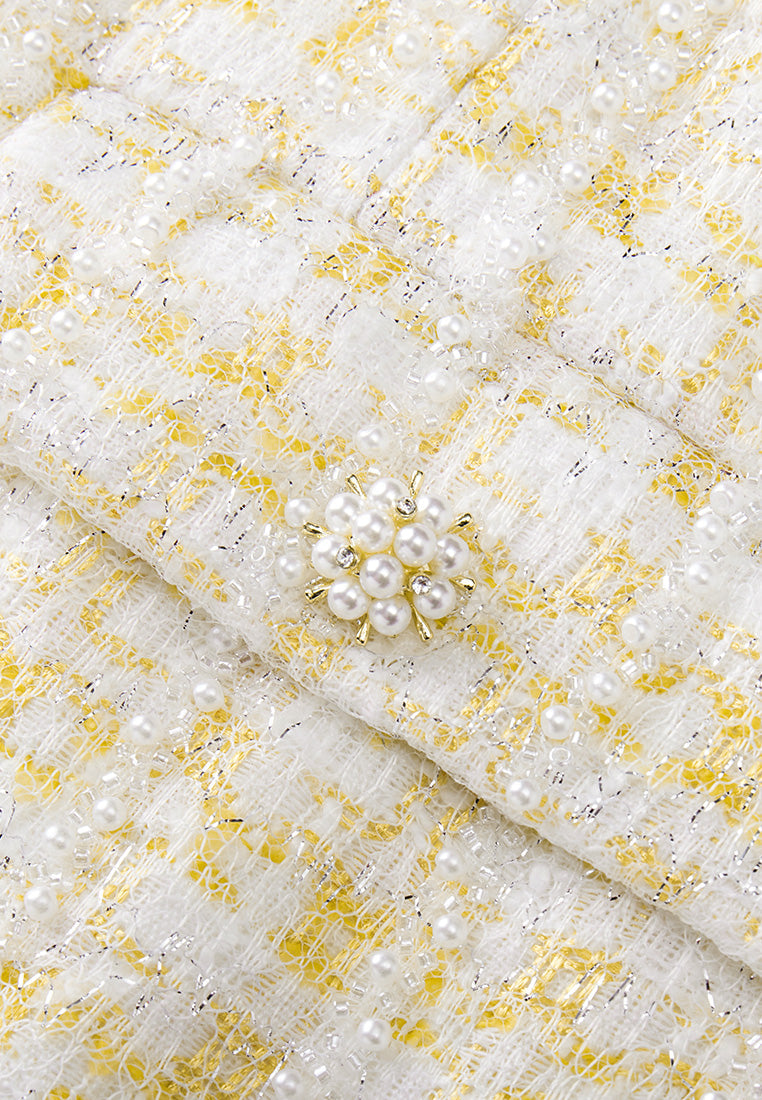 Graceful and elegant are the best description of this item. Tweed fabric gracefully woven in light yellow white colorways. The item features MOISELLE's signature four pockets design. Pearl buttons delightfully lined up at the front fly and pocket flaps. Finish up with pearls intricately embellishing the item.