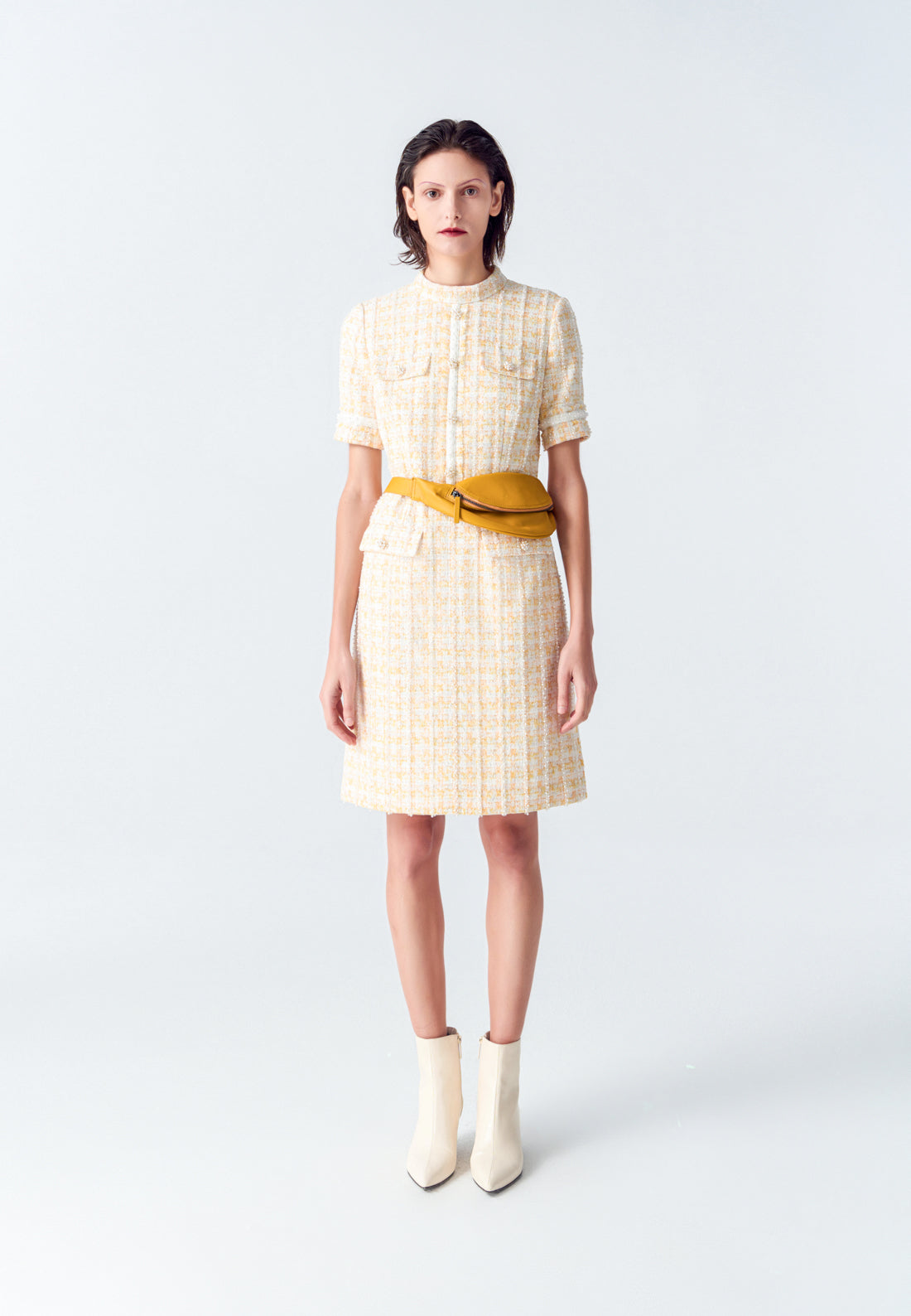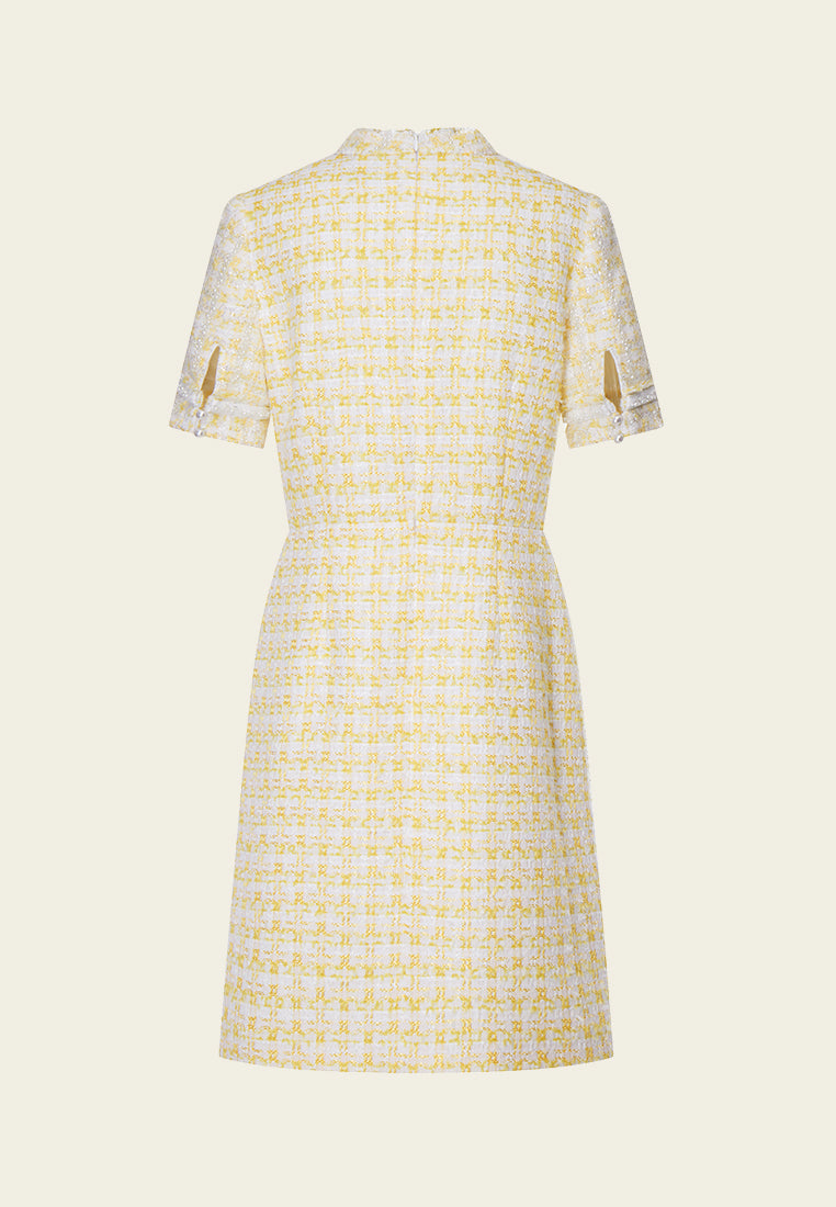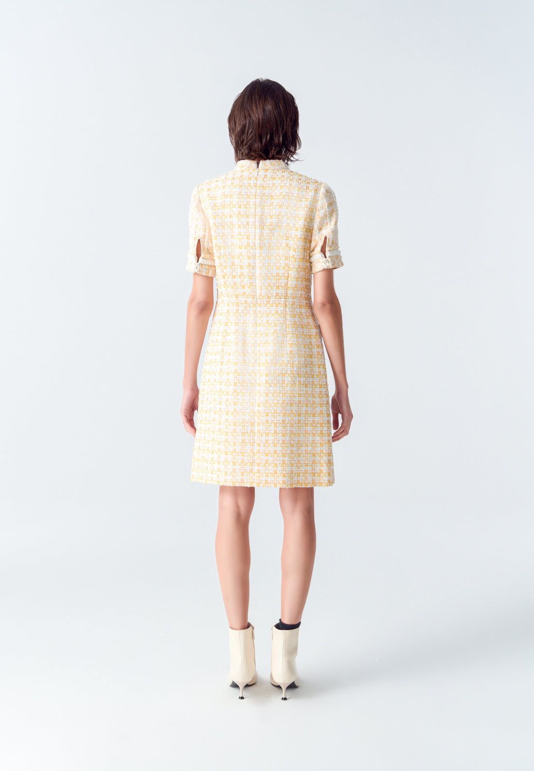 Graceful and elegant are the best description of this item. Tweed fabric gracefully woven in light yellow white colorways. The item features MOISELLE's signature four pockets design. Pearl buttons delightfully lined up at the front fly and pocket flaps. Finish up with pearls intricately embellishing the item.