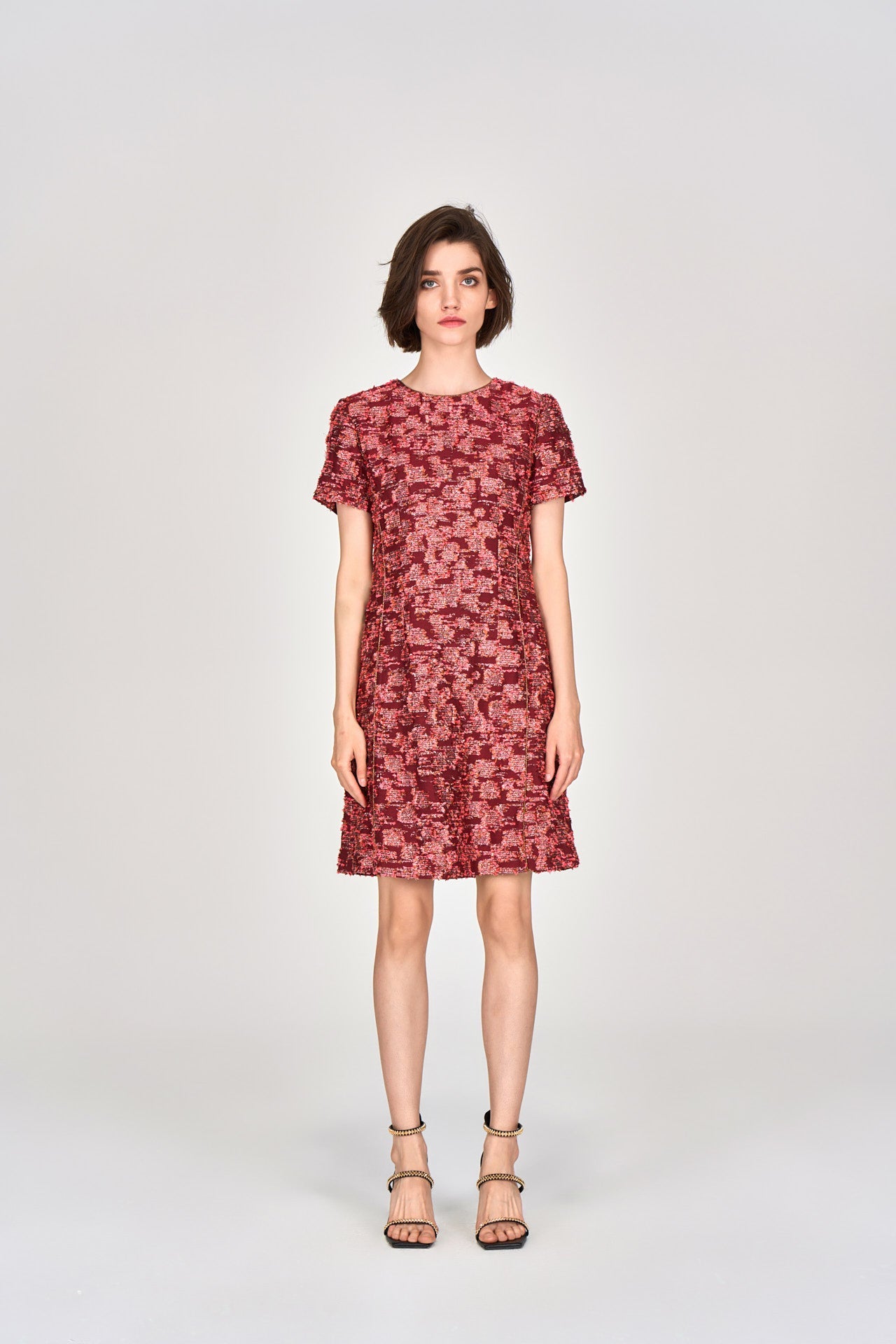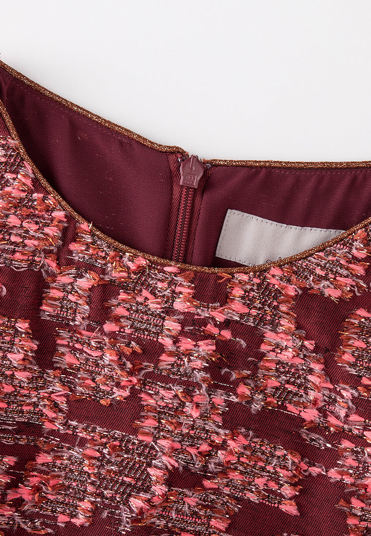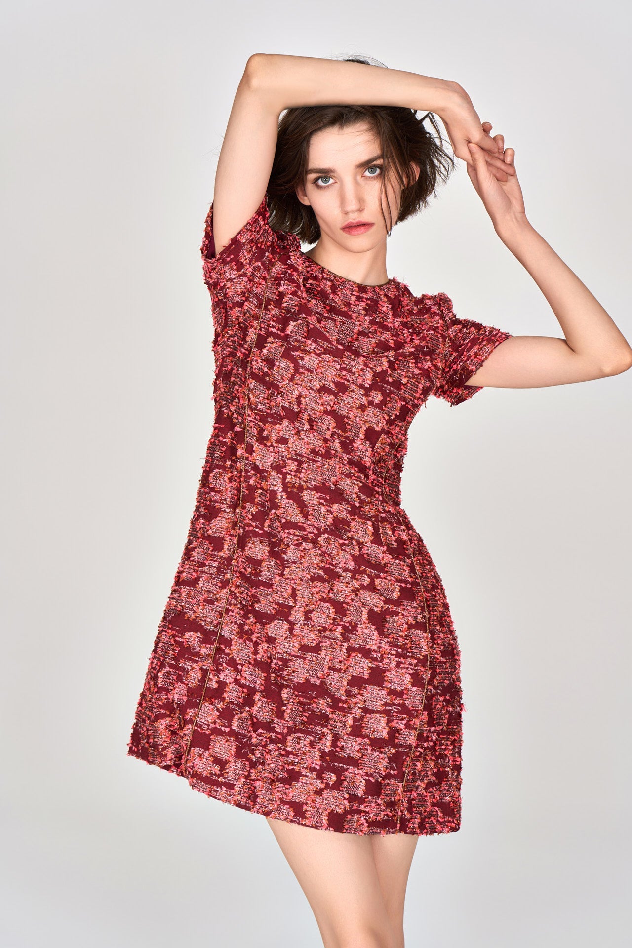 Unique colorway, texture and punchy pattern, resulting a one-and-only festive outfit. Dull orange colorway infuses a perfect amount of gracefulness and mature into the item. Jacquard lurex pattern reminiscent of firework sparkles. Short sleeve, waist accentuating silhouette.