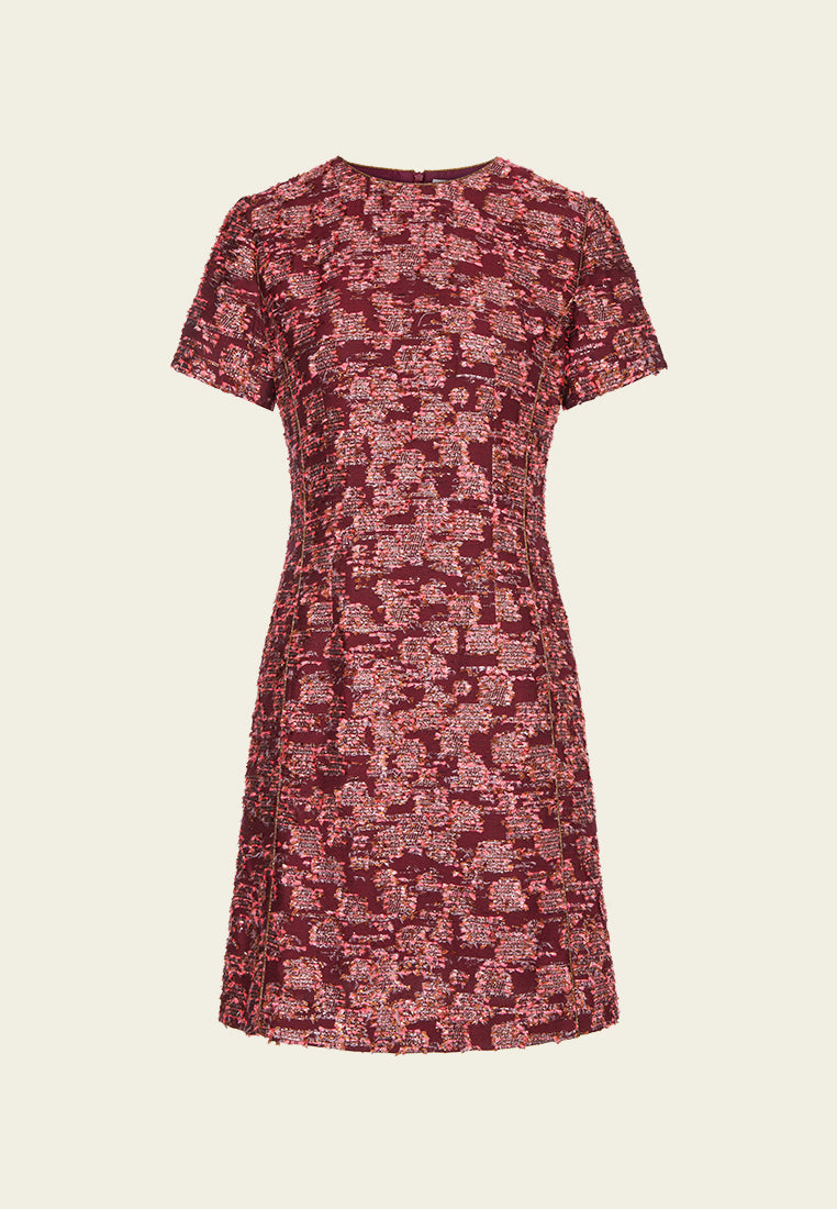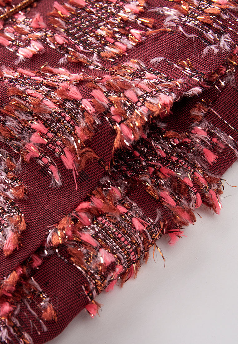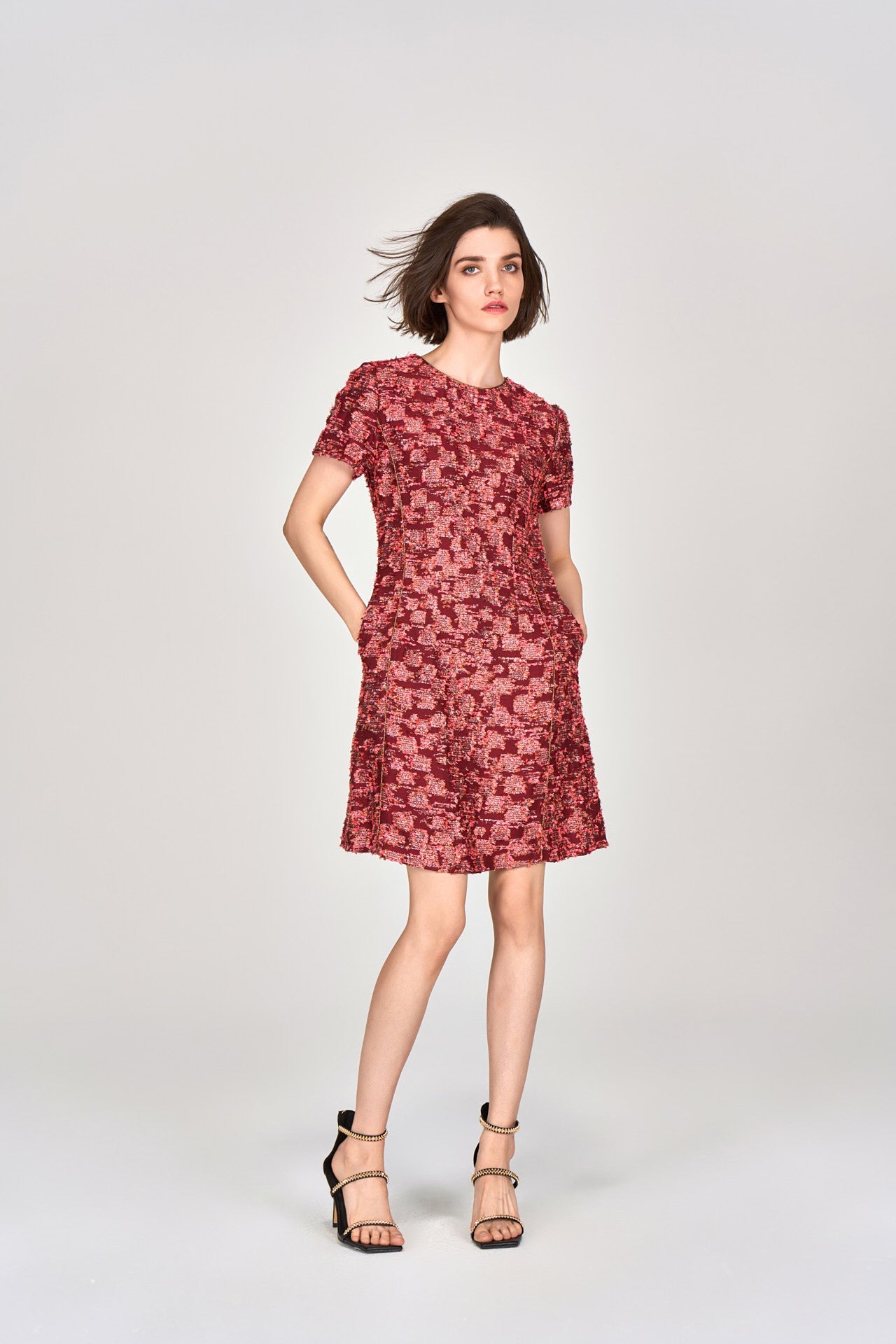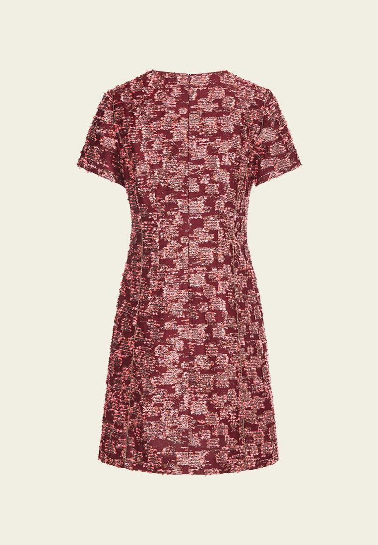 Unique colorway, texture and punchy pattern, resulting a one-and-only festive outfit. Dull orange colorway infuses a perfect amount of gracefulness and mature into the item. Jacquard lurex pattern reminiscent of firework sparkles. Short sleeve, waist accentuating silhouette.