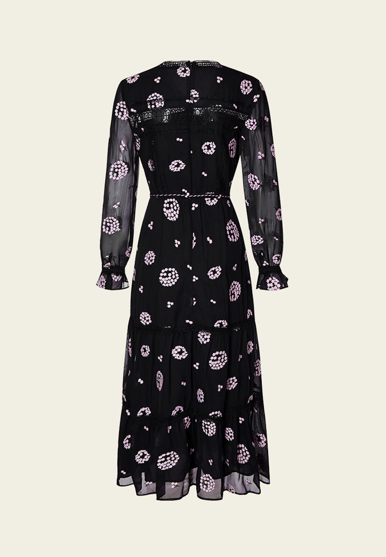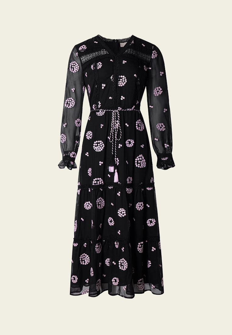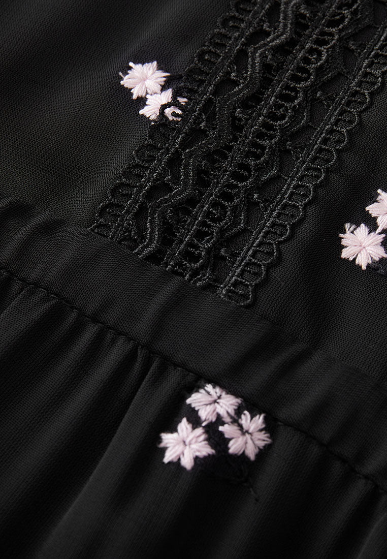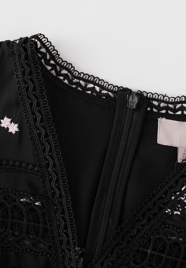 Gracefully embroidered with light pink hydrangea. The dress iterates a scene of hydrangea blown by a gentle breeze, that the flowers fall under the night sky. Black lace understatedly highlighting the silhouette of the dress. Tie-waist organically accentuate waistline.