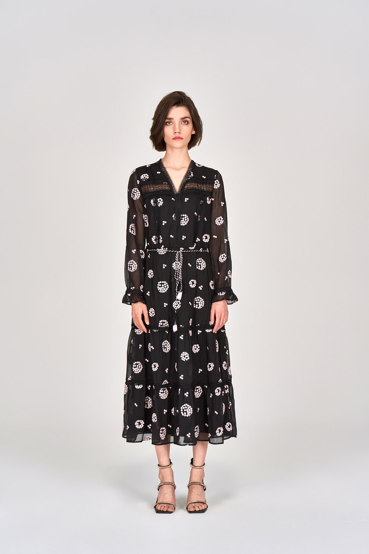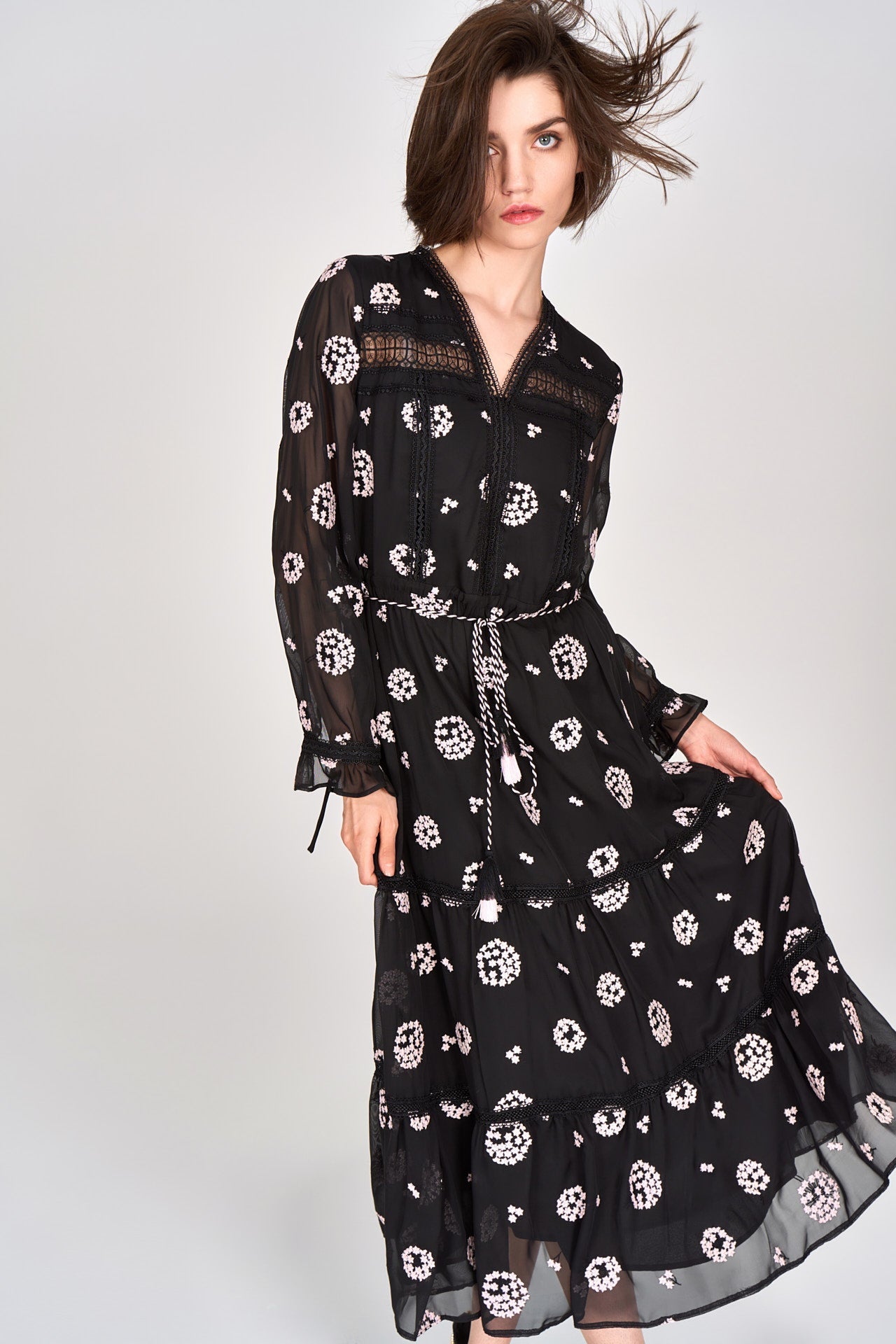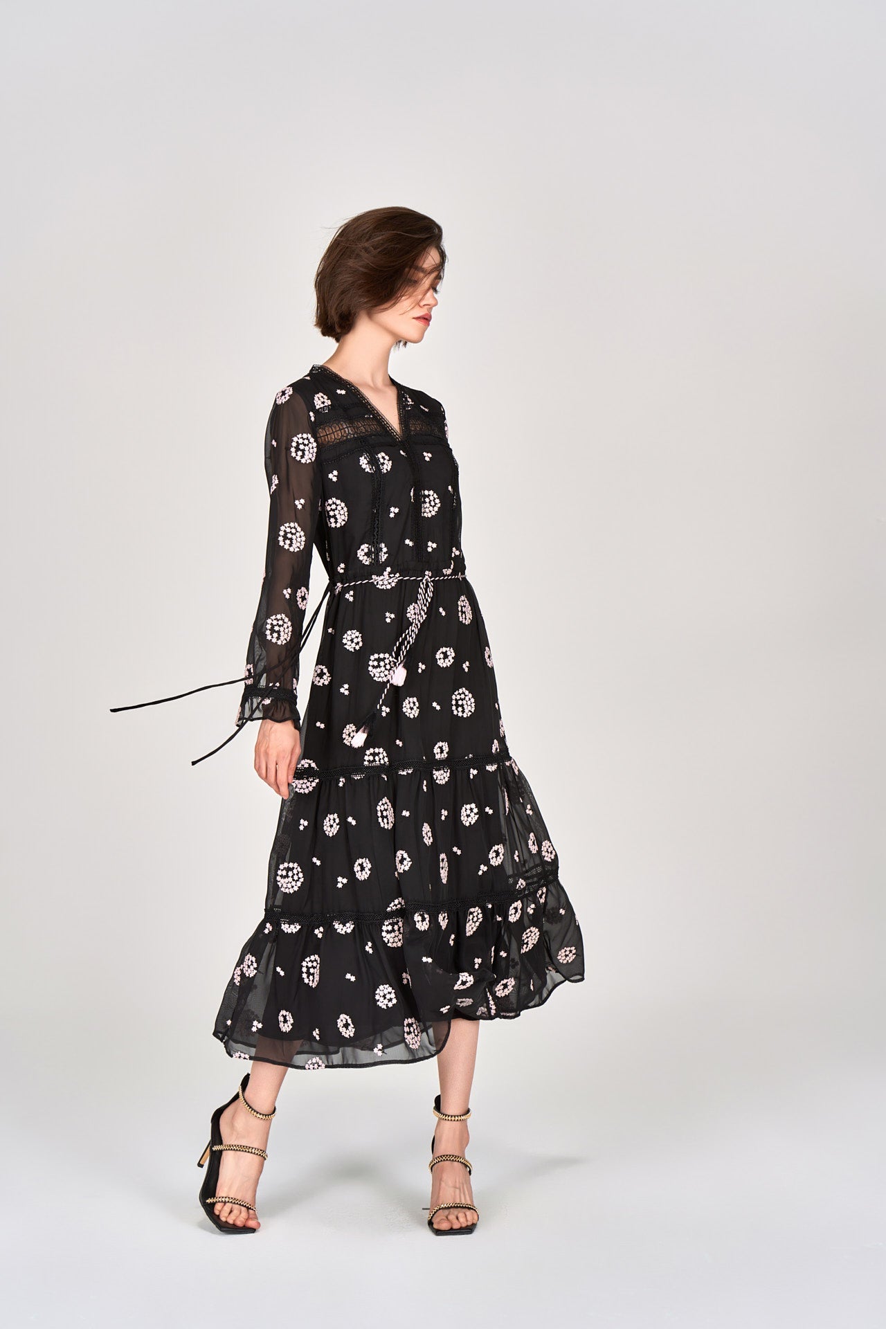 Gracefully embroidered with light pink hydrangea. The dress iterates a scene of hydrangea blown by a gentle breeze, that the flowers fall under the night sky. Black lace understatedly highlighting the silhouette of the dress. Tie-waist organically accentuate waistline.
