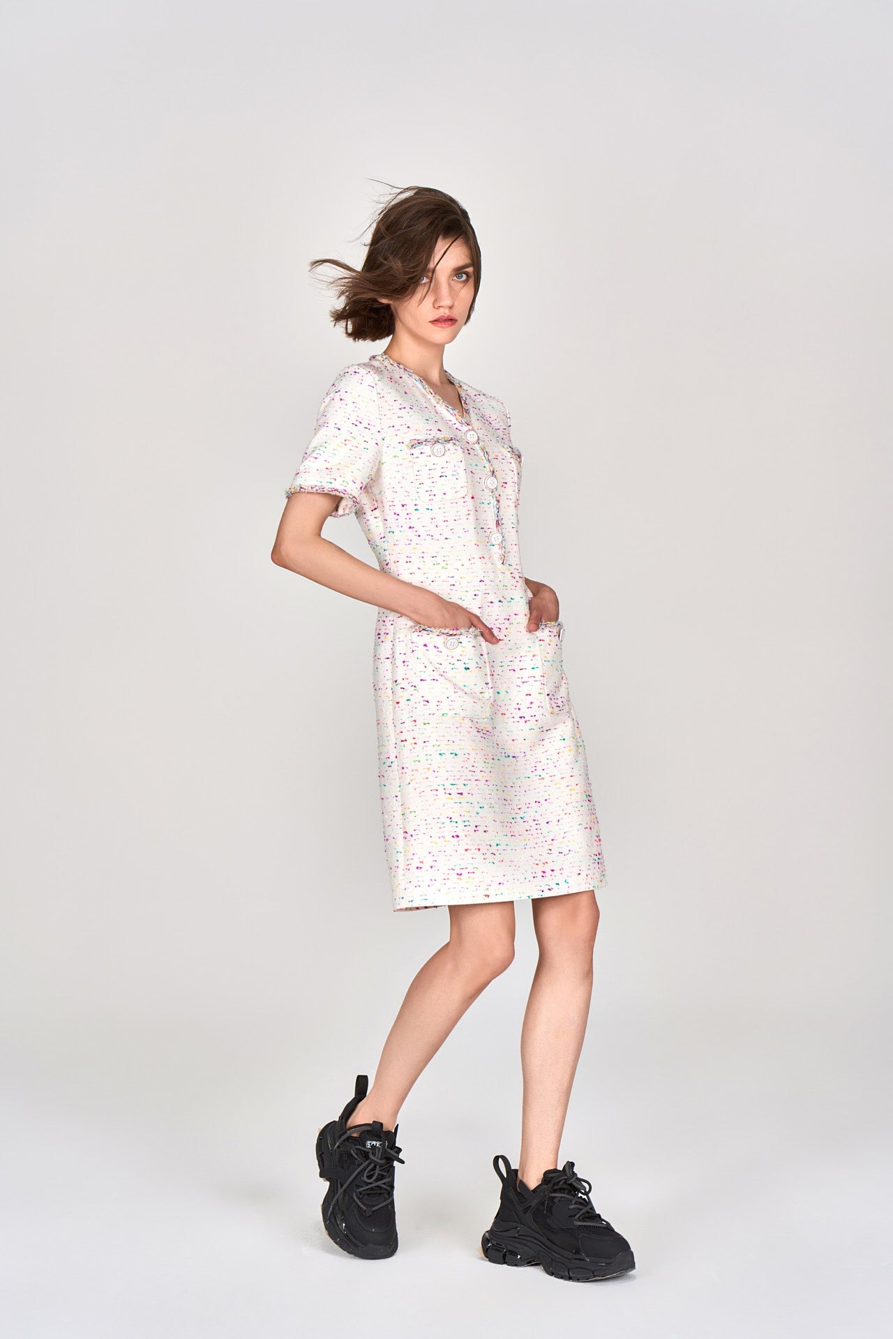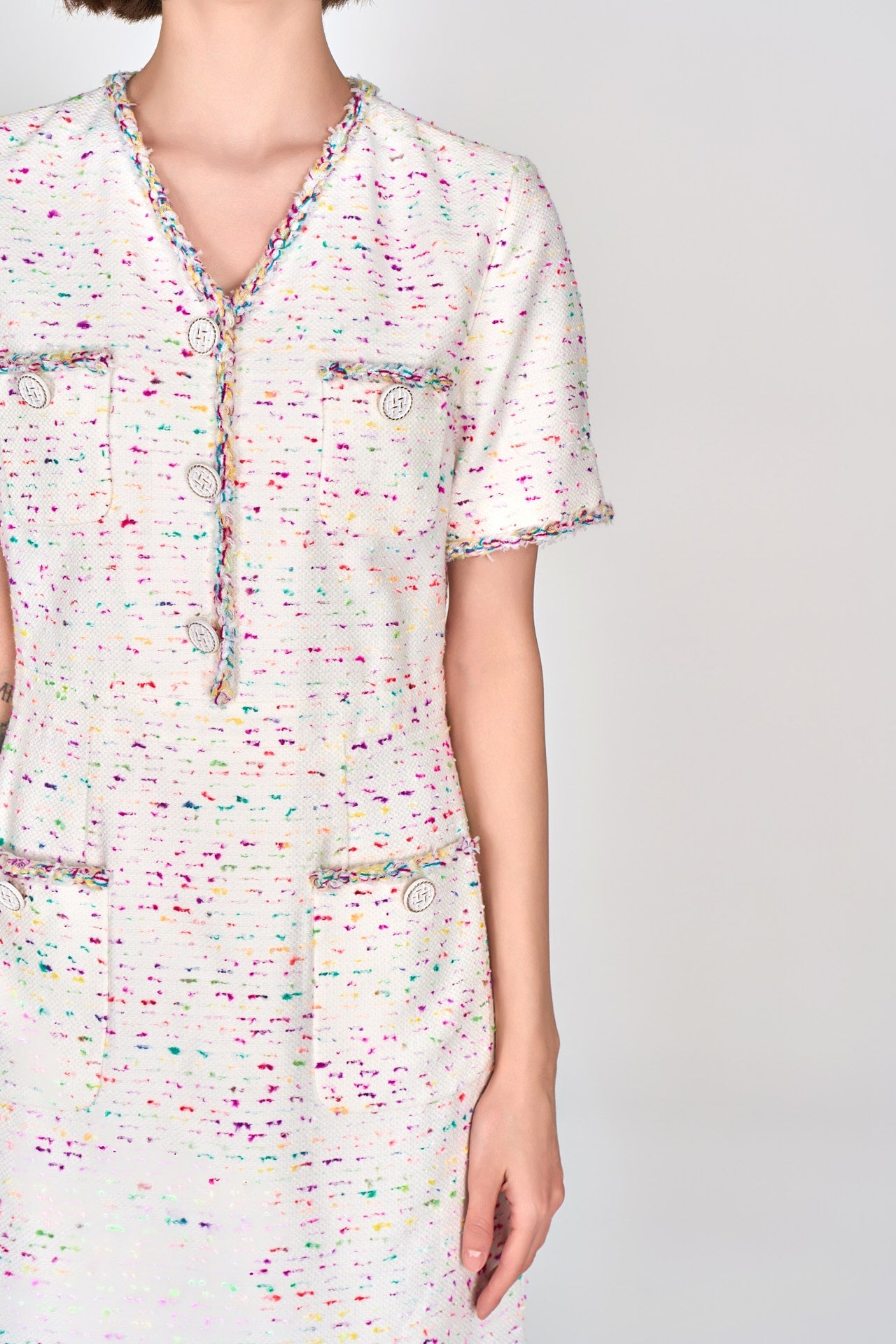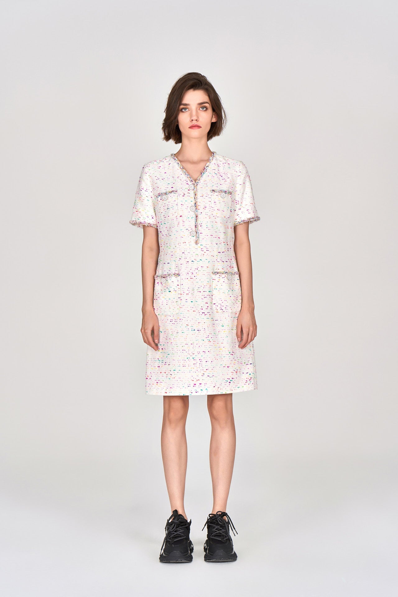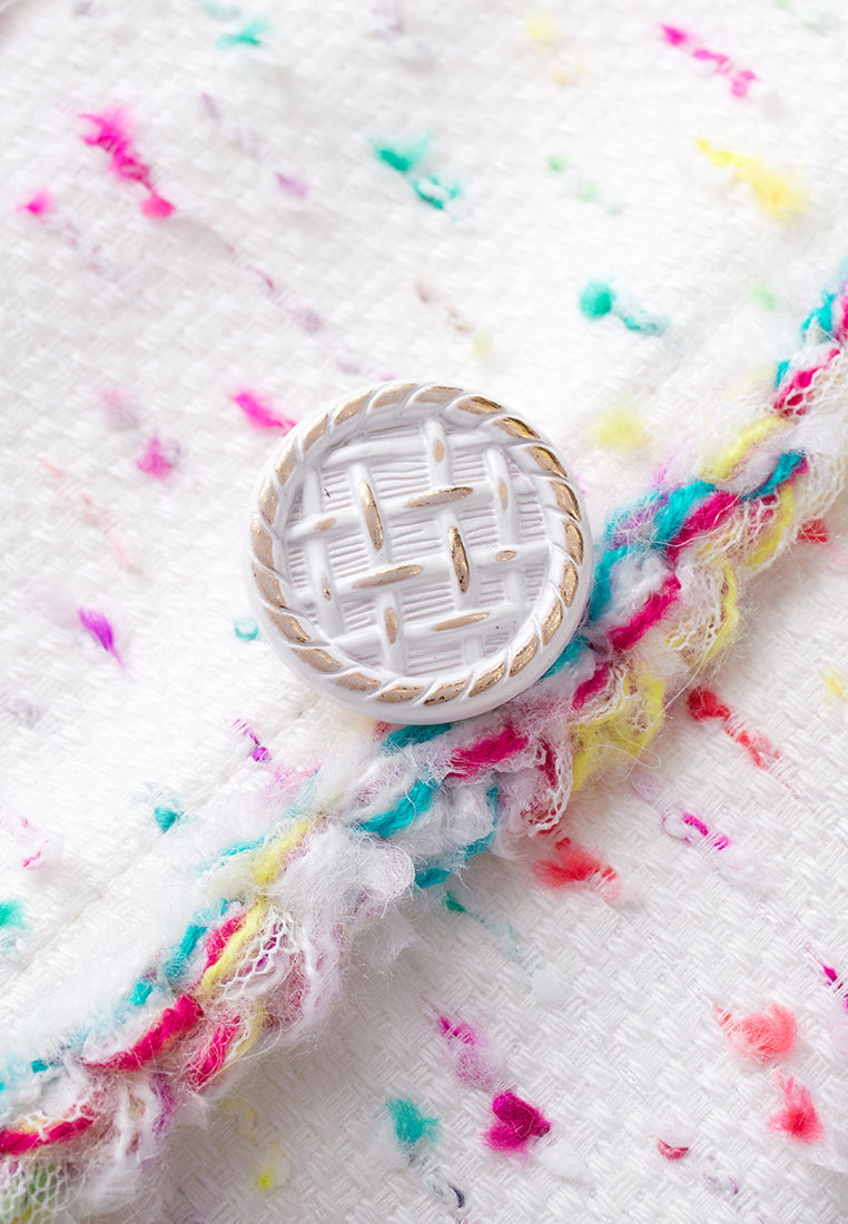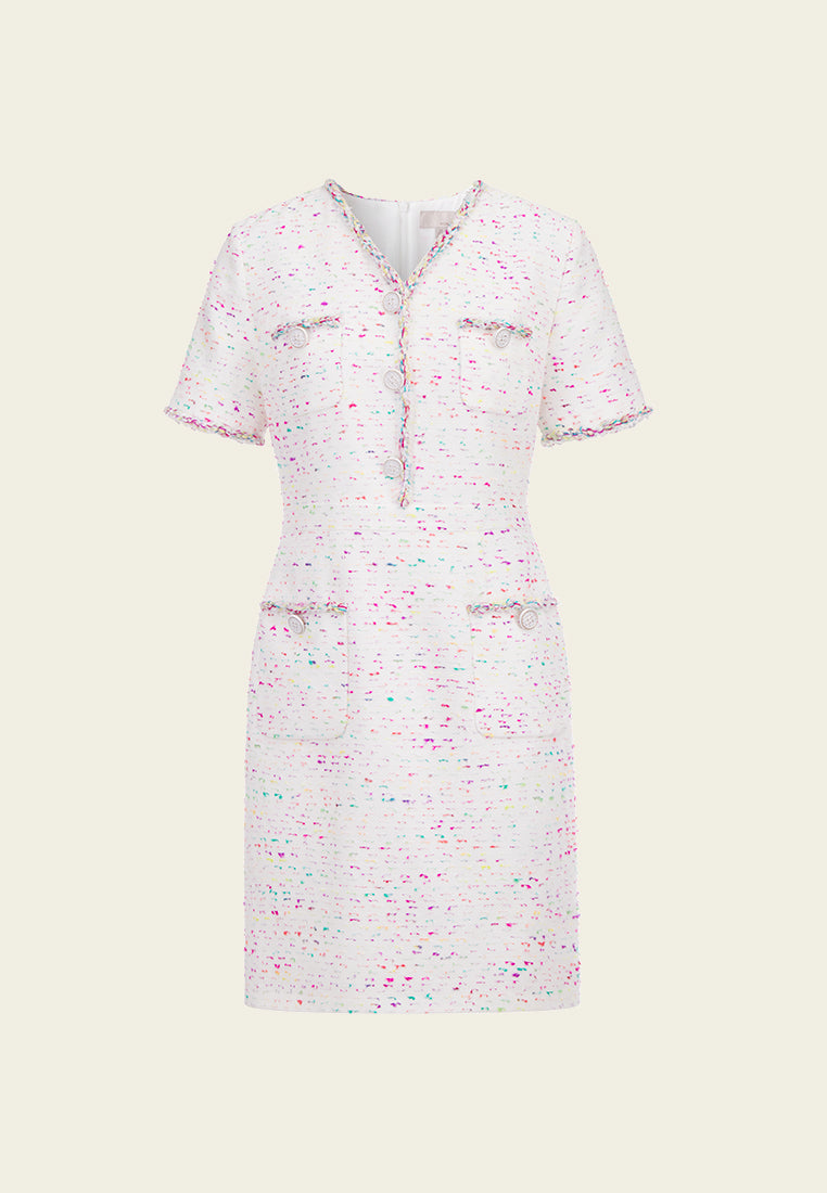 Candy White V-neck Tweed Dress