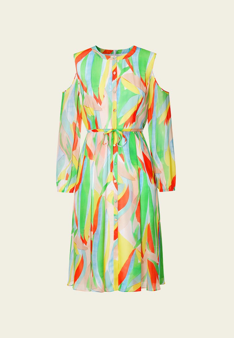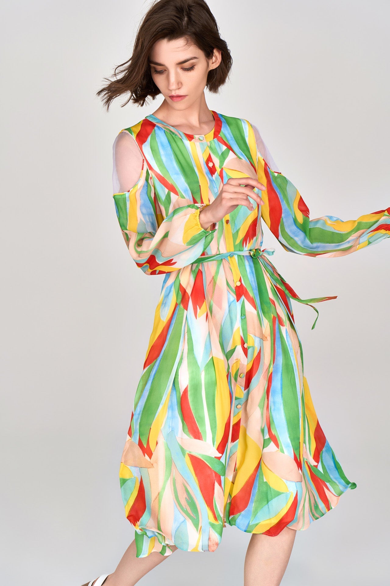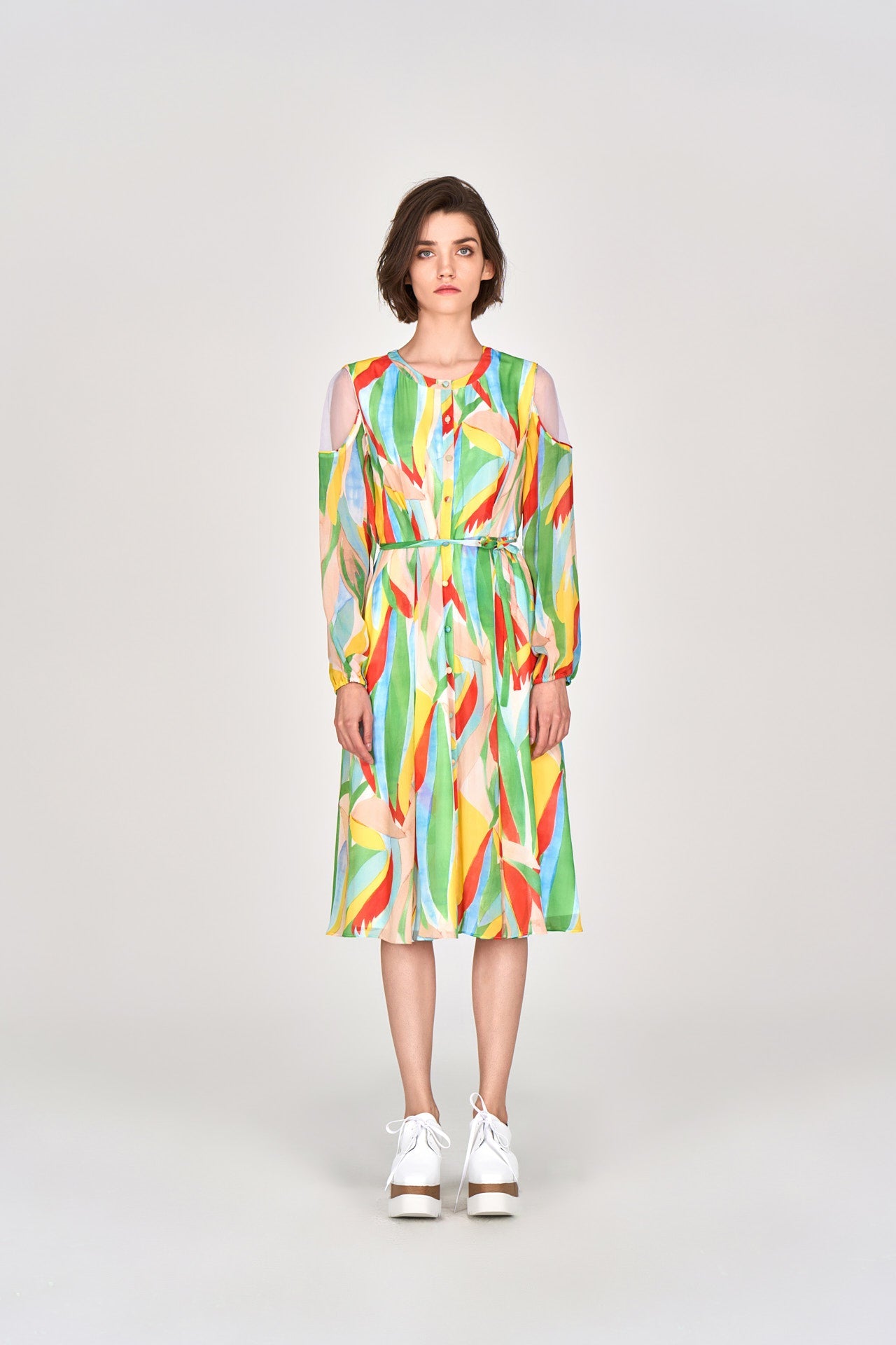 An unique from the MOISELLE spring collection. Long sleeve chiffon dress in vibrant candy tone. The abstract pattern and the silhouette evokes a 70's nostalgic feeling. The piece boasts two cutting features: cut-out that lurks arm skin, and a tie belt that casually accentuate waistline.