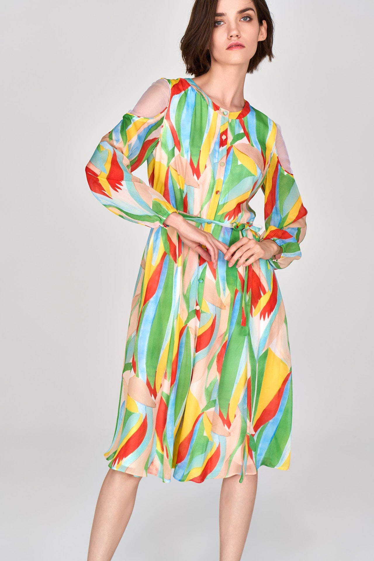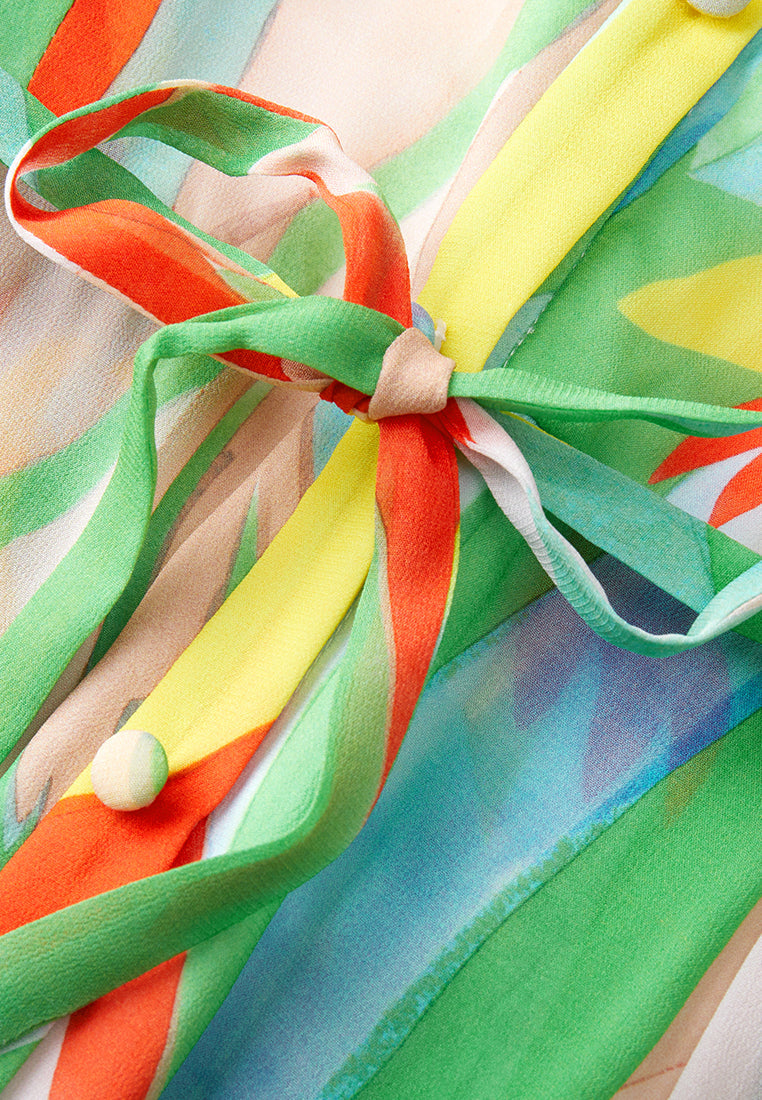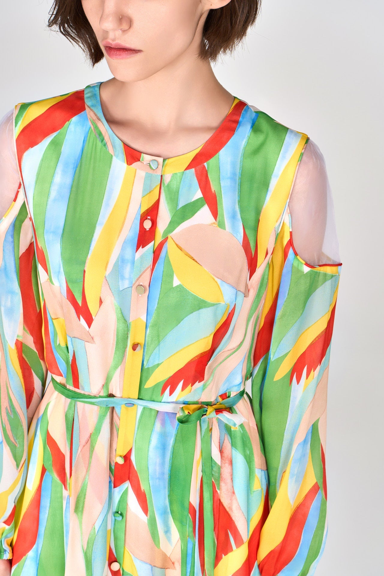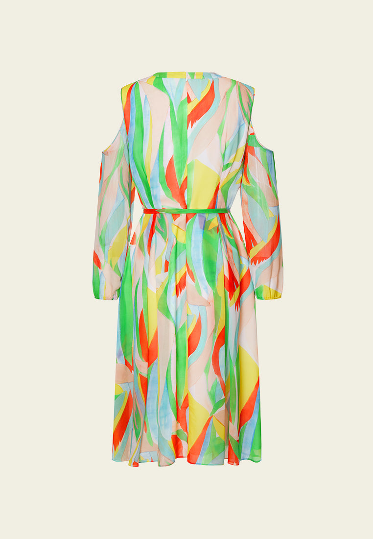 An unique from the MOISELLE spring collection. Long sleeve chiffon dress in vibrant candy tone. The abstract pattern and the silhouette evokes a 70's nostalgic feeling. The piece boasts two cutting features: cut-out that lurks arm skin, and a tie belt that casually accentuate waistline.