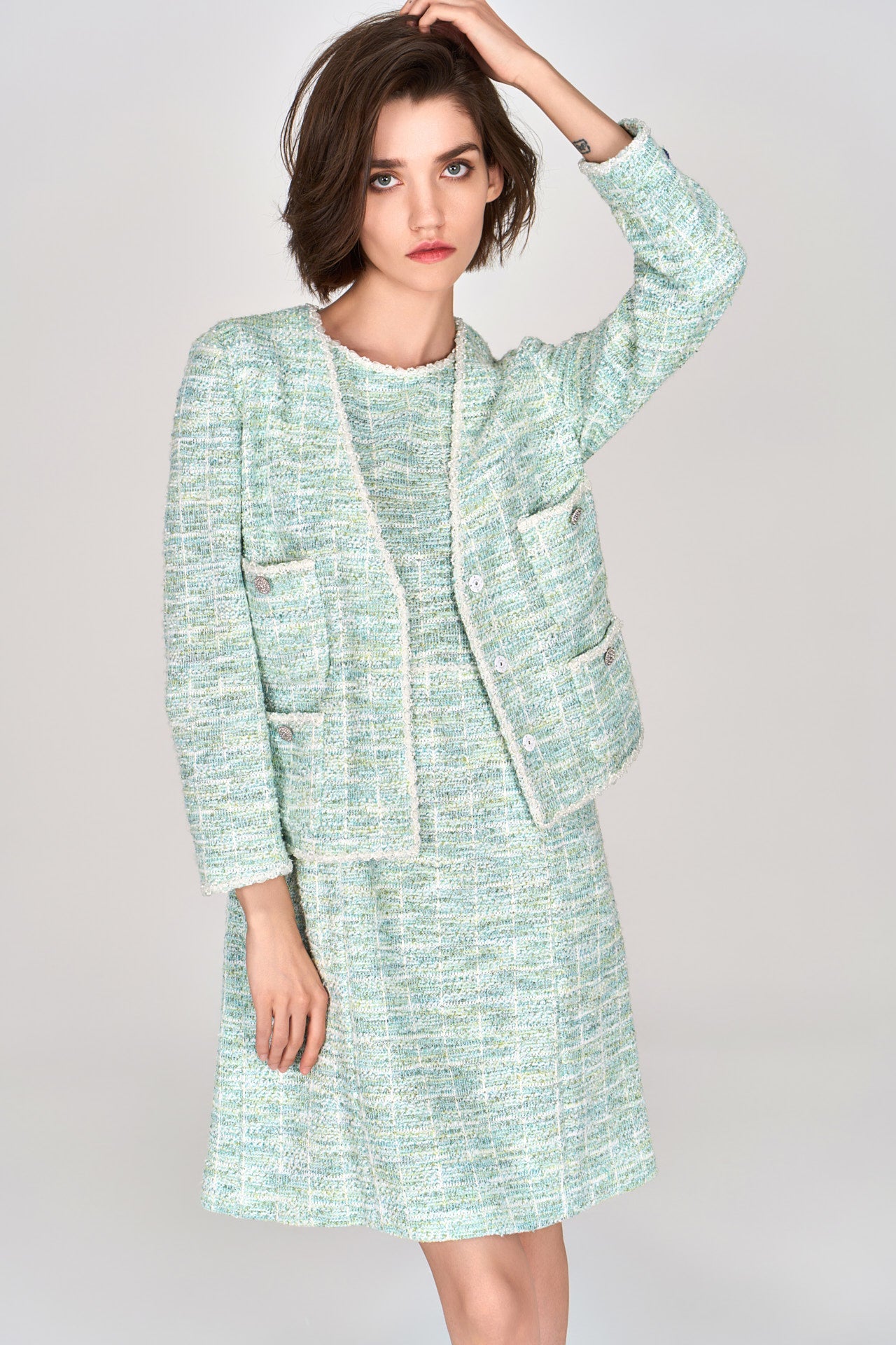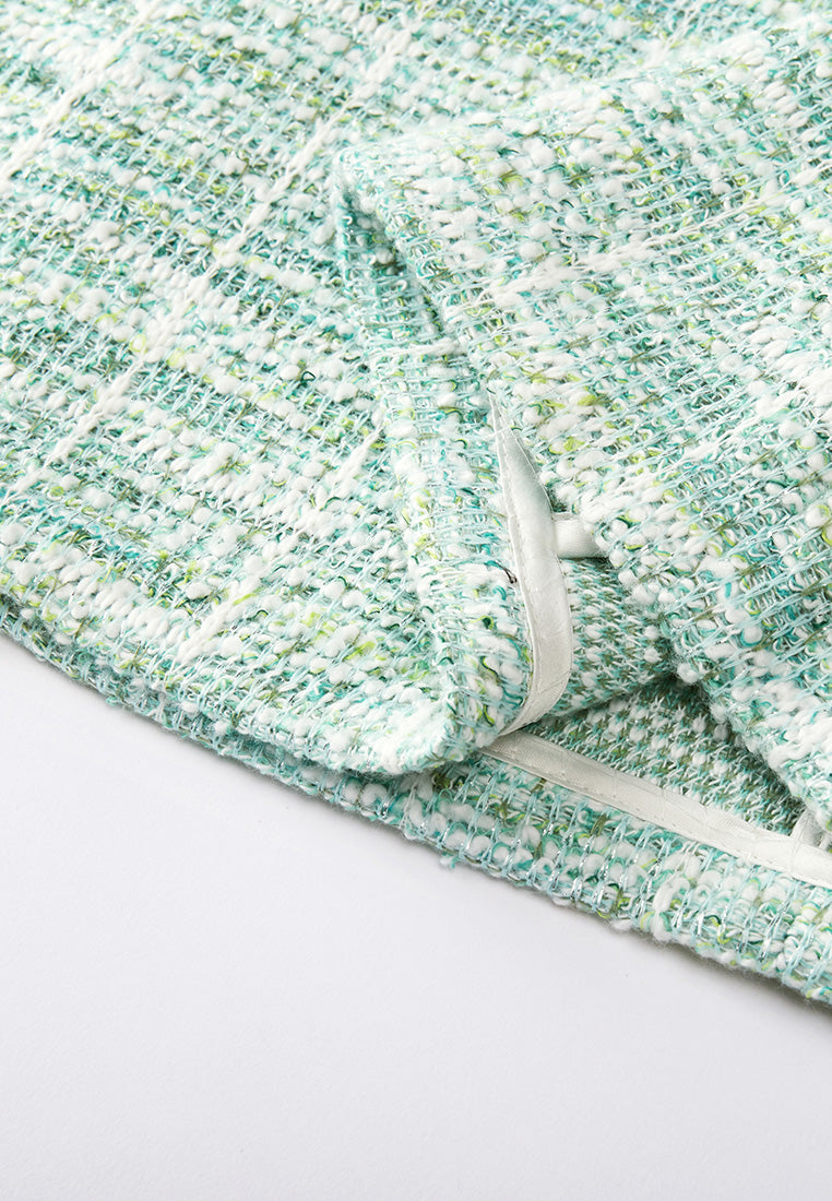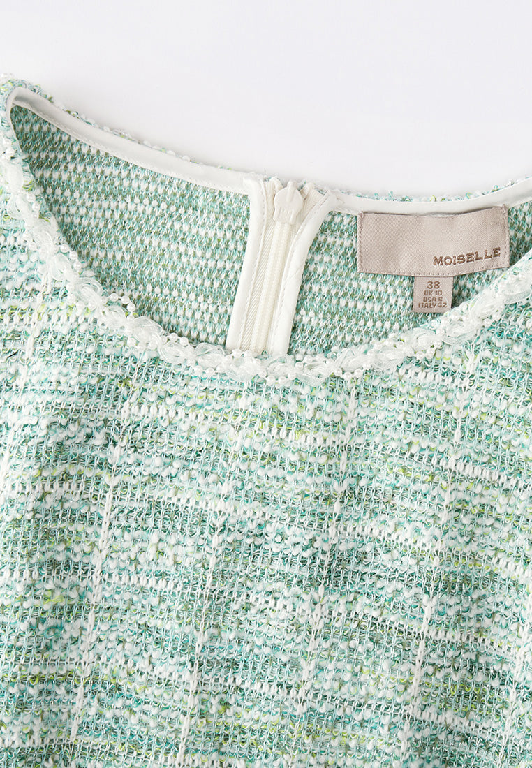 Strike your hot and intolerable summer with this refreshing green item. Made with white and green interwoven tweed, the fabric has a subtle ombré effect. Finish up with white pearl and mesh embellishment. Sleeveless. Ready-to-go workwear.