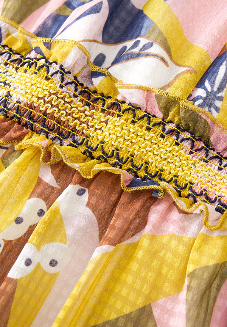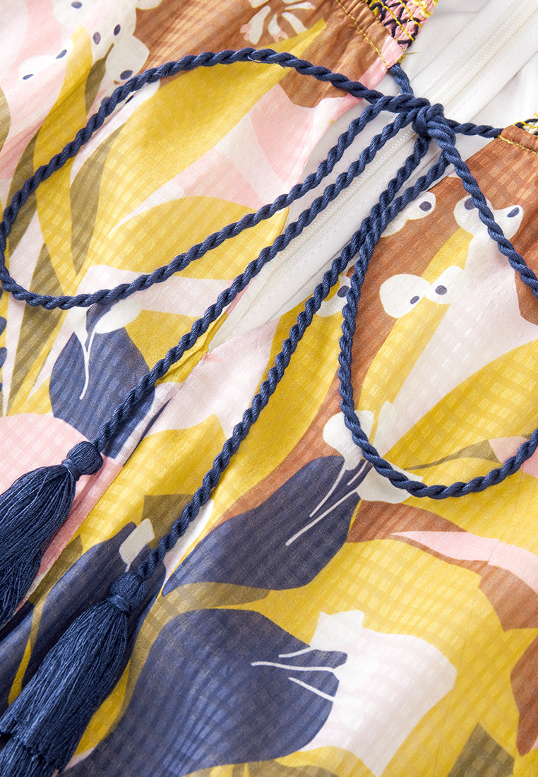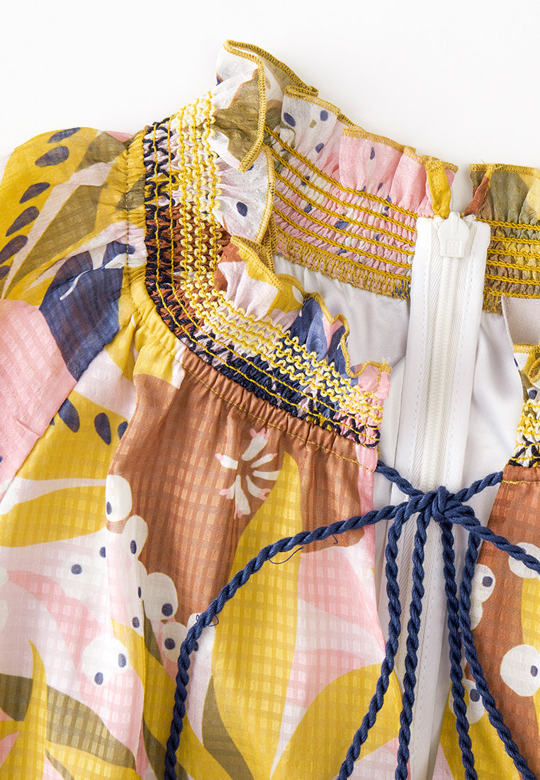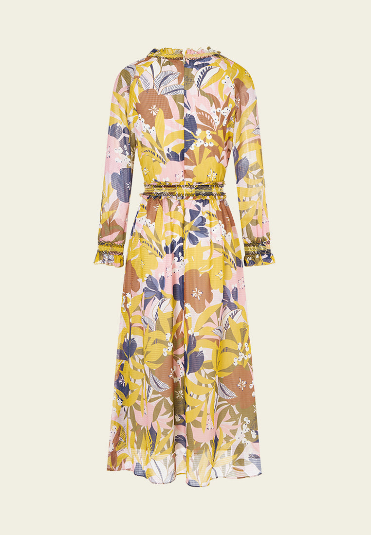 Enliven the summer season with this buoyant dress, complete with a striking yellow floral print and a navy blue tie neck. The long sleeve and chiffon construction ensures a comfortable experience, even in highly air-conditioned areas.