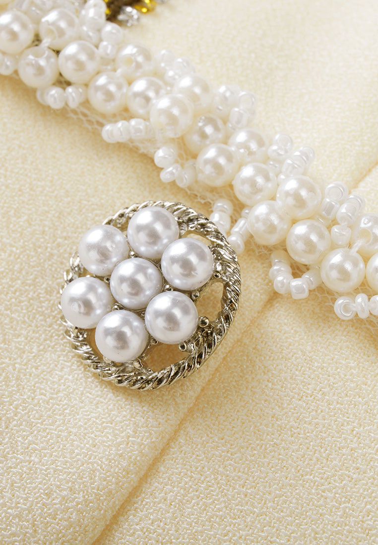 Custard colorway evokes a mild and sophisticated feeling. The item boasts lurex lace, pearl and bead embellishments, gracefully highlighting the upper body and waistline. Crepe fabric keeps you cool and non-sticky when sweat. Perfect ready-to-go as workwear or dignified occasions item.