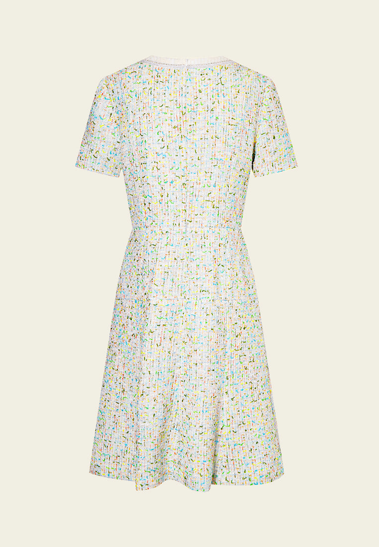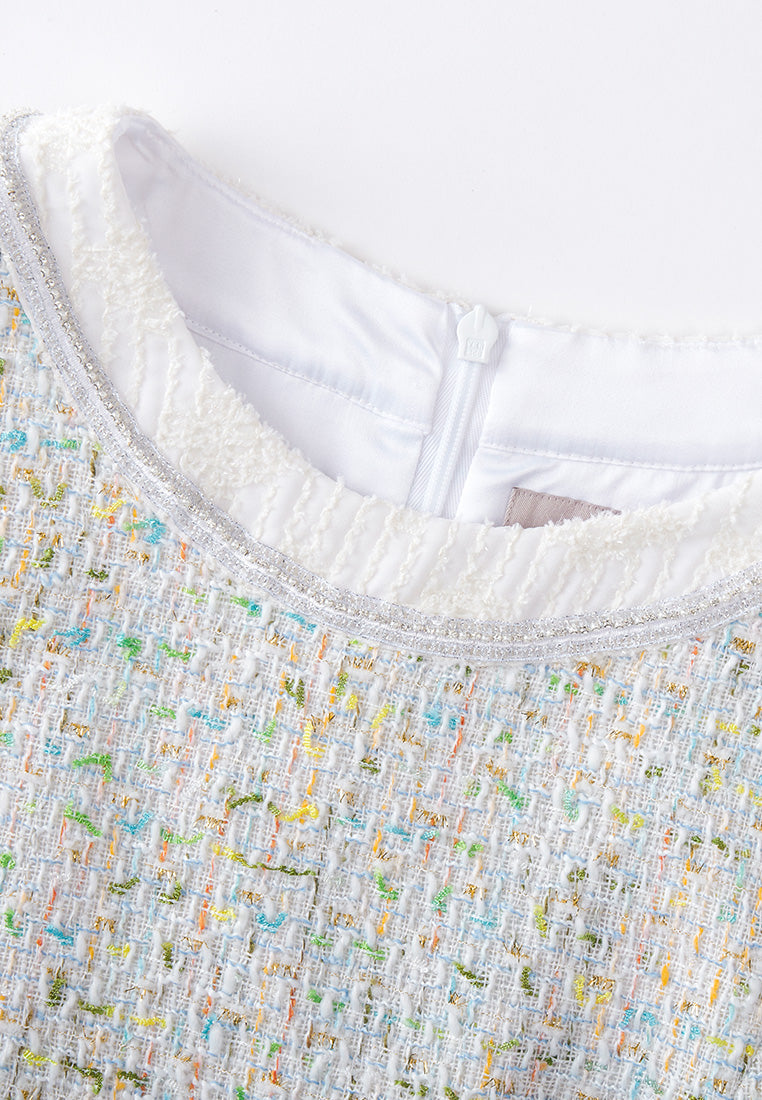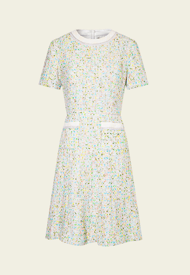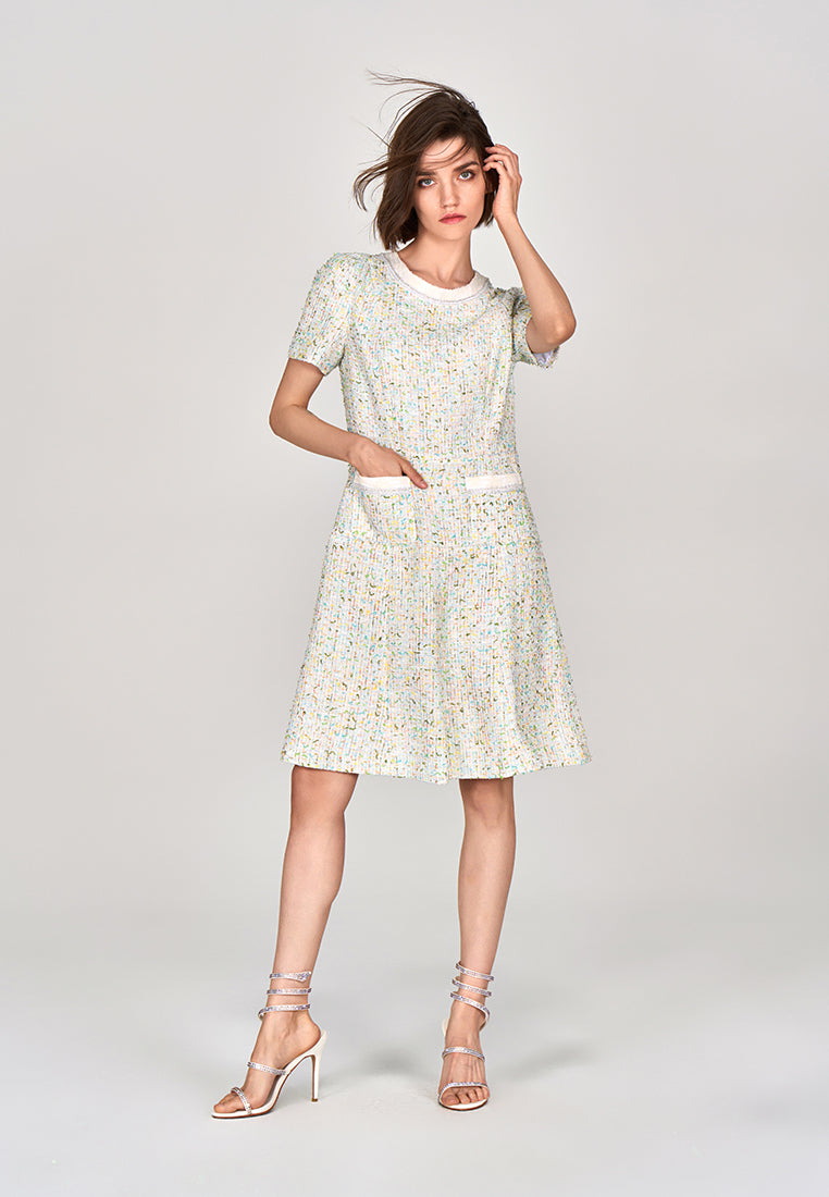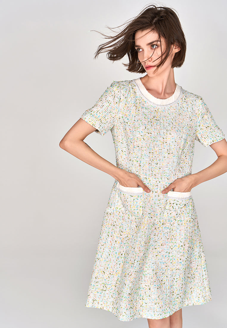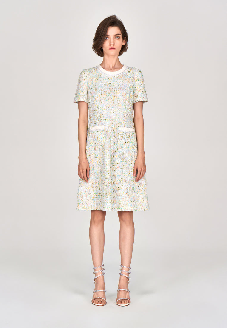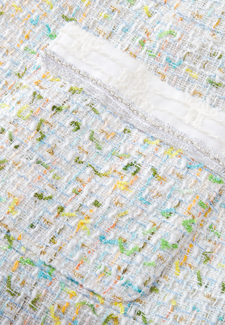 A decent ready-to-go workwear infused with a hint of spring/summer vibe. Classic white tweed midi dress delightfully interwoven with colors of spring and summer : yellow, green orange and blue. Finish up with pearl and rhinestone lurex and white trimming hems.